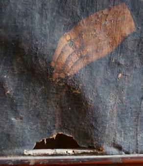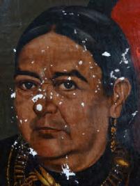 Fotografía. Detalle faltante de soporte, deformación de plano, suciedad consistente, craquelados y faltantes de capa pictórica.
