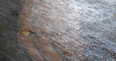 Fotografía. Detalle con luz rasante donde se evidencia el cambio de textura luego de sentar el craquelado con espátula caliente (parte superior).