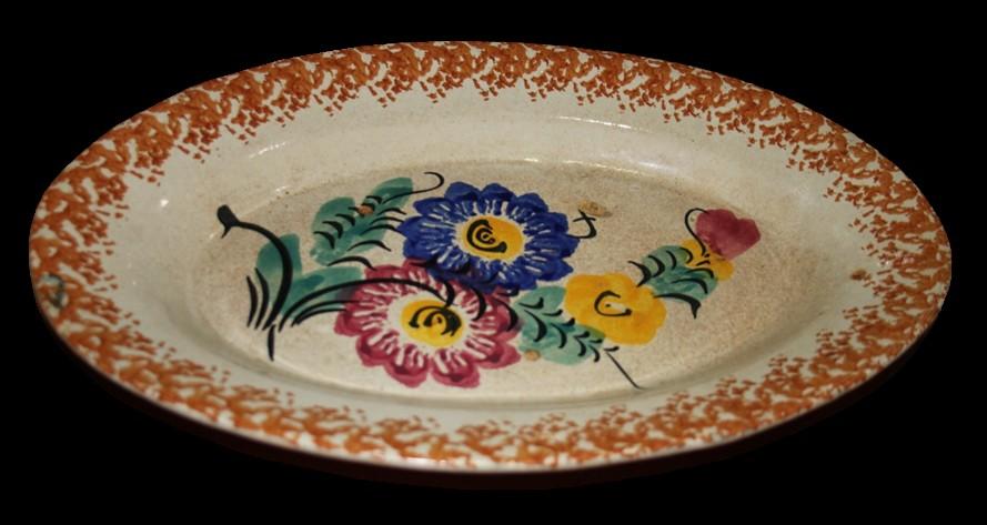 A travessa é uma peça muito antiga, apesar de não saber ao certo a sua idade sabemos que tem mais de 100 anos, tendo alguns furos no centro. É decorada em toda a volta com uma decoração castanha dourada, no centro encontram-se flores grandes e de três cores (azul, rosa e amarelo). Está com muito pó. Em alguns lados já está gasta.