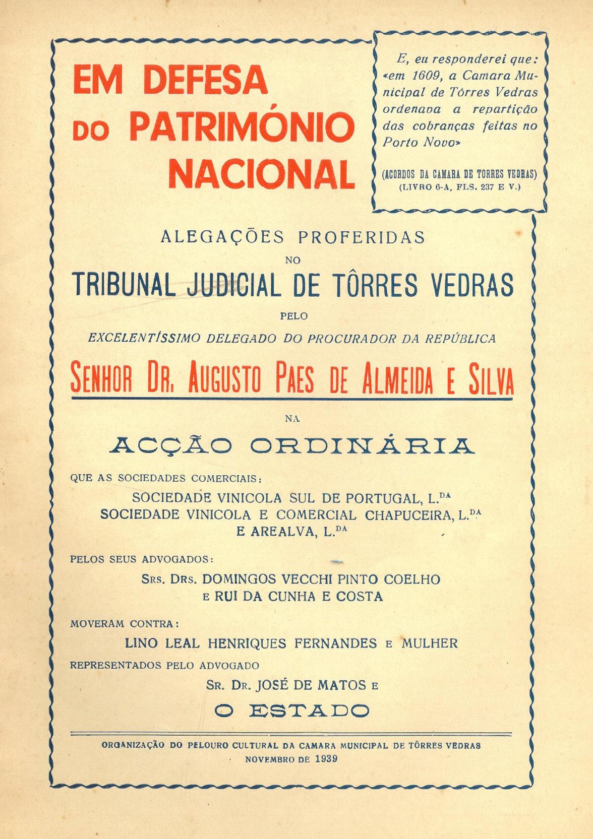 Foram incorporados na nossa biblioteca, através de doação, uma publicação e um material não livro de grande interesse. Trata-se de uma ementa do almoço do XXXV Congresso da União das Feiras Internacionais. A publicação, intitulada Em defesa do Património Nacional, diz respeito à ação da Sociedade Vinícola Sul de Portugal e Sociedade Vinícola e Comercial e Arealva contra Lino Leal Henriques Fernandes e mulher.