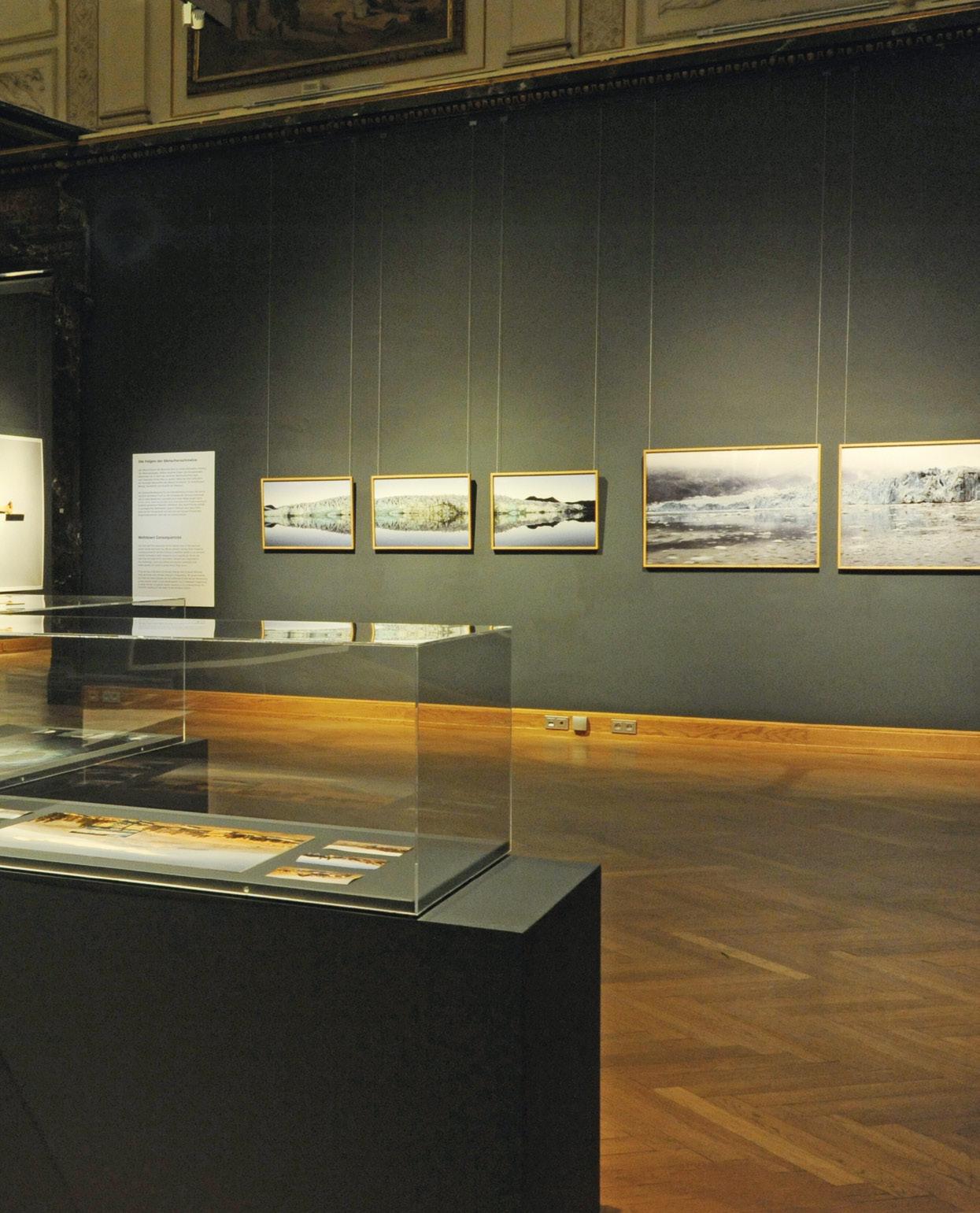 anzuregen. Die ausgewählten Kunstwerke in der Ausstellung beziehen sich auf abschmelzende Gletscher und zeigen die Auswirkungen des Klimawandels, wobei verschiedene Medien zum Einsatz kommen. Im Gegensatz zu Waldbränden, Überschwemmungen etc. sind Gletschermassenverluste nicht auf kurzfristi-