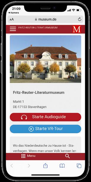 ganz neue Maßstäbe setzen. Durch die Integration modernster Technologien können sich Gäste nun barrierefrei sowie orts- und zeitunabhängig in den Räumen des Museums bewegen und dieses auf eigene Faust erkunden. Der digitale Rundgang, der in 3D erlebbar ist, eröffnet völlig neue, aber auch zeitgemäße Perspektiven für die Gäste. Im täglichen Umgang mit den Besuchern hat sich noch ein weiteres Tool etabliert - der integrierte Audioguide. Dieser ist in den 3D-Rundgang integriert, kann aber auch eigenständig und unabhängig als Guide für den Museumsbesucher vor Ort genutzt werden. An festgelegten Stationen innerhalb des Museums können sich die Besucher per Scan eines QR-Codes nun umfassend über das Leben und Schaffen des niederdeutschen Schriftstellers Fritz Reuters informieren. Diese innovative Kombination aus visuellen und auditiven Elementen schafft ein einzigartiges und immersives Erlebnis für die Besucherinnen und Besucher. Er wird derzeit in hochdeutscher und englischer Sprache angeboten. Um die Authentizität zu gewährleisten soll er zudem in niederdeutscher Sprache angeboten werden.