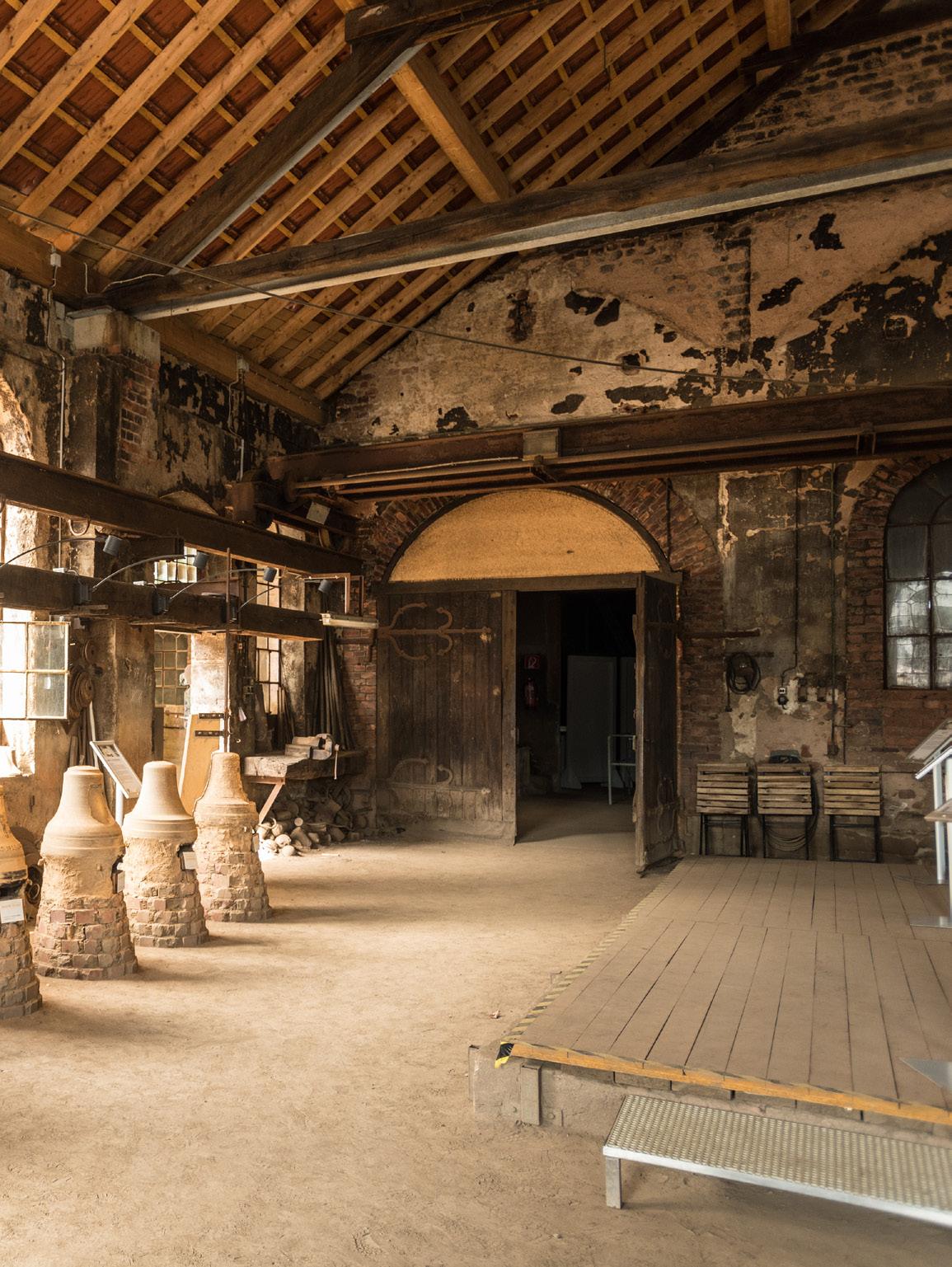 Schritt für Schritt können Sie die Herstellung nachverfolgen und die original erhaltenen Räumlichkeiten besichtigen – vom Zeichenzimmer, in dem der Meister den Glockenton berechnete und die Rippe (eine Holzschablone, die der Glocke ihr Profil gibt) entwarf, über den Lehmraum bis hin zum Kronenzimmer und der Gießhalle.