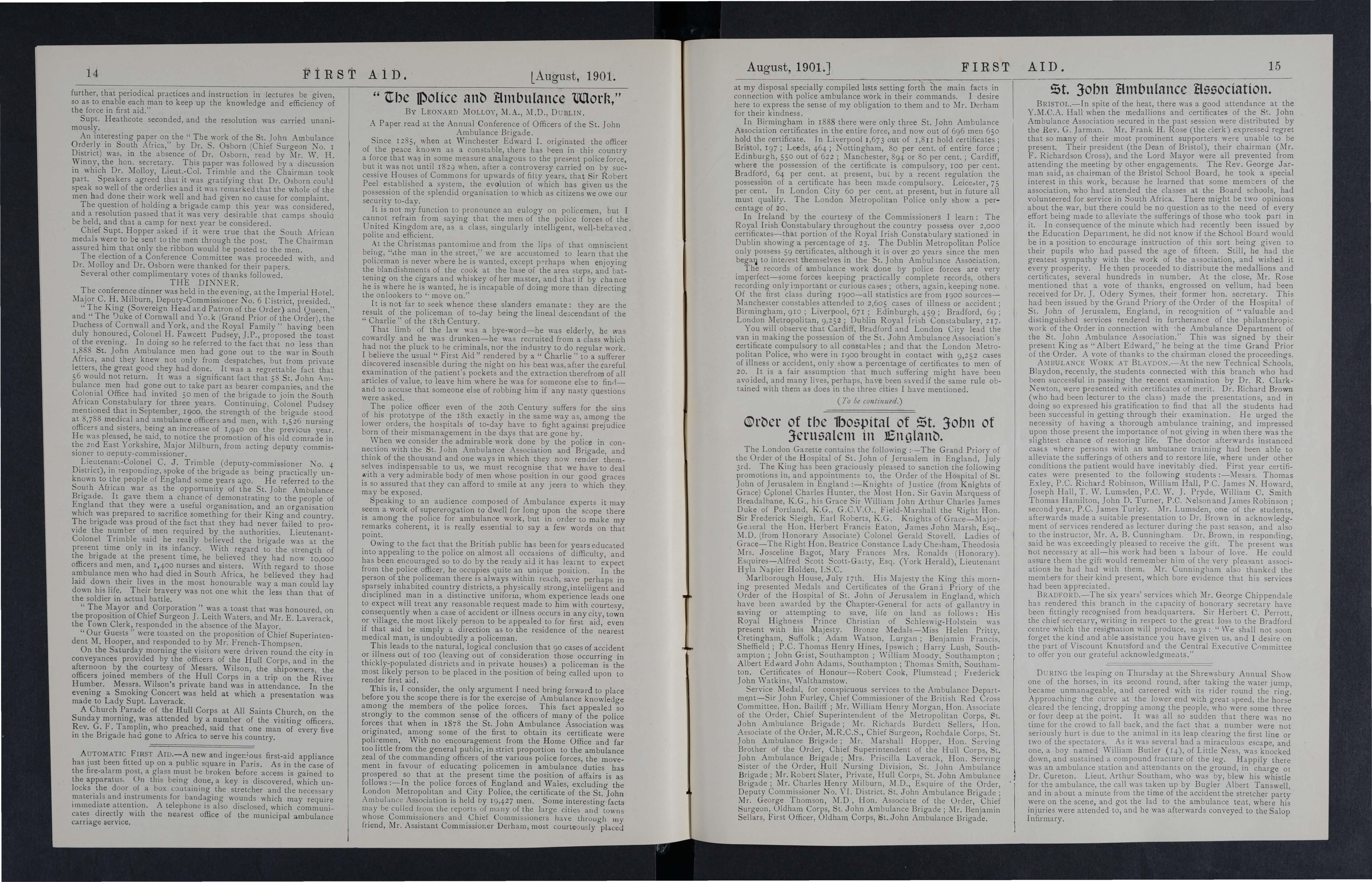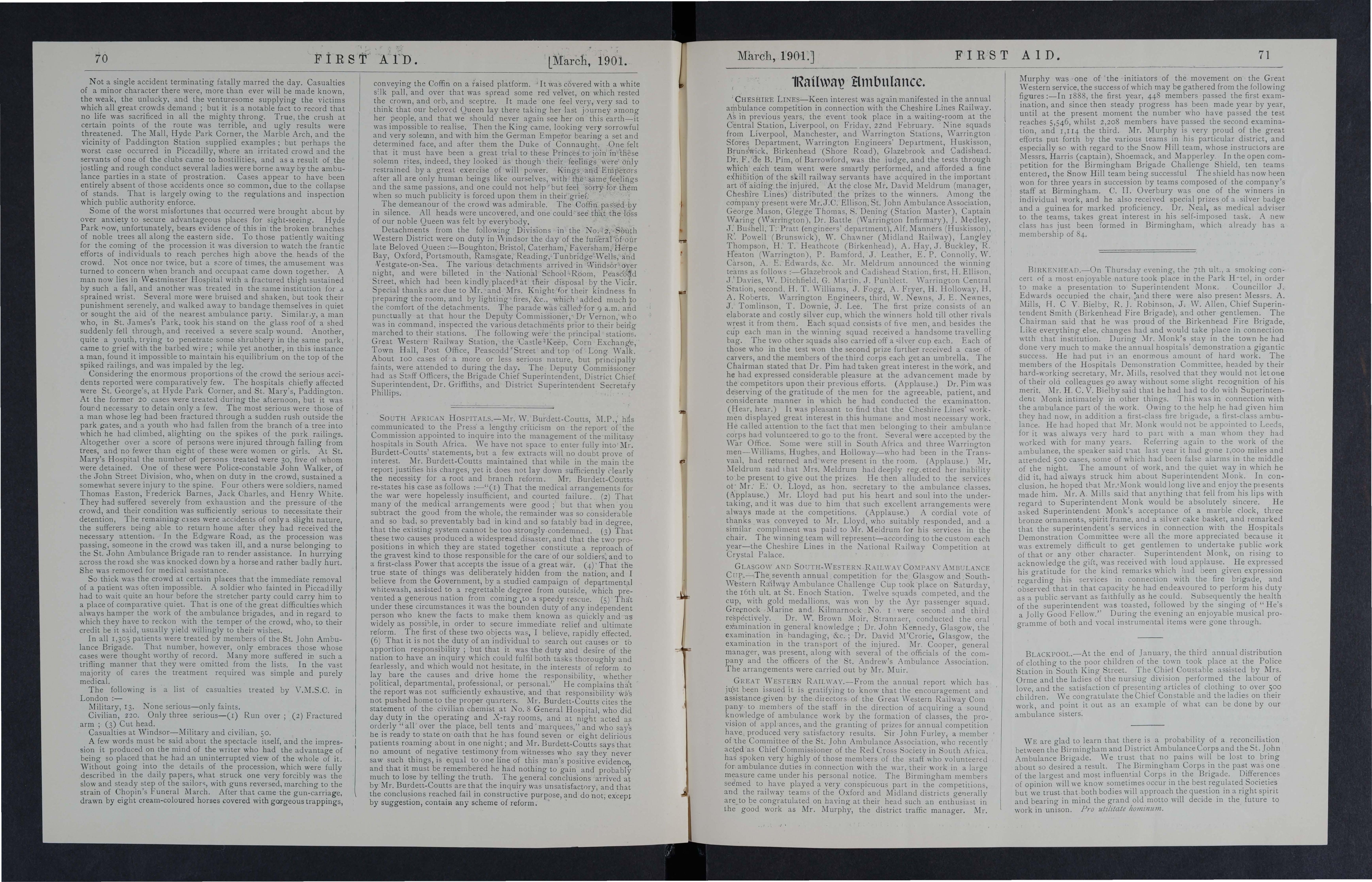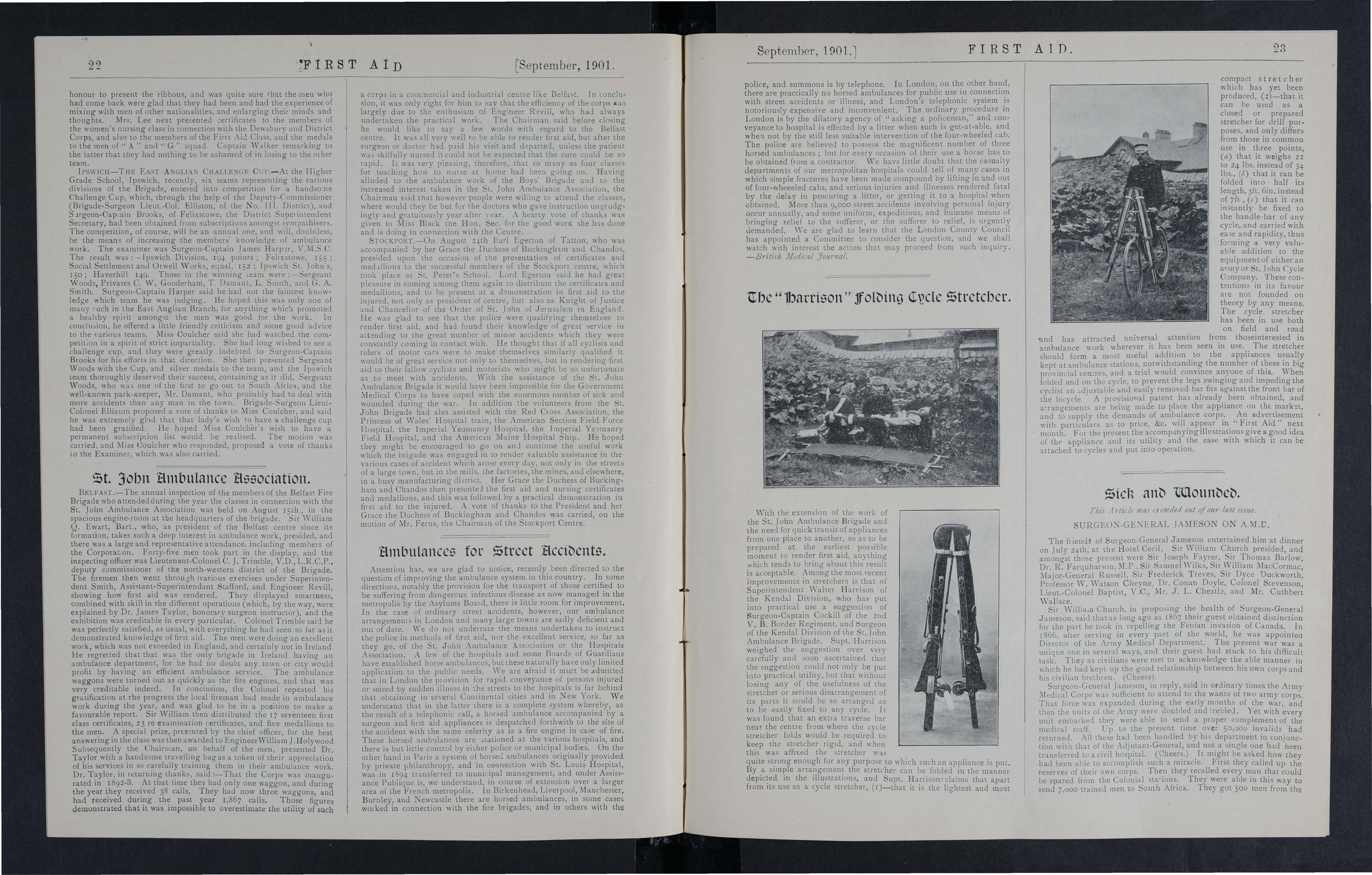 I R.-II avinO' read" First Aid" recently, it has led me to take an int'!rest in the service for London. It seems to me, from 13 years personal experience on beats in -orth,. and ? est London thouO'h not a first-aider, that the .\Ietropol!s IS better prOVIded for in the matter of ambulanc e provision, than readers of your Journal miO'ht be led to suppose. undoubtedly, there is room for impr ovement, for"instance, if some inexpensive means c.ould be devised for the police to be able to signa l, o r telephone, for the Ir ambulance from the st.reets, th eir work would h ave a more credita ble appearance of promptItude. :\Iany sergeants do what C,ln to make people comfortable when injur ed in the streets, by puttlllg on the polIce ambulances. The new pattern amb ulance s are a great Impr ovement on old, and duly take their pla(:e as the old ones wear out. If I am III charge of an acc ident case, I always order a blanket to on the ambulance, place the injured person Injured SIde up, o n the blanket lift on ambulance, first taklllg stretcher off wh eel frame. agree w\h you that speci.allitters for accidents only should he kept at poli ce stat ions , and I thlllk that would be found yery useful if kept at the followlllg polIce statIons: - \\ andsworth t We st Dill), Brixton Road, Peckham (High Street), Greenwi.ch (Blackheath R oad), !-Ial:row (Ca rlt on Ham mersmLlh (Broadway), Stoke ;'; eIVll1 gt on (High treet), l\. entlsh Town ( H olmes Roa d) , Bow Road and Scotland Y"rd. Wagons, if kep.t at the named stat ion s would be in direct call by t"legraph WIth 120 polIce sta tion s in London wi tho ut costing an extra penny for communication the remaining 42 stations, not co,unti ng the city , could also si O'.n a I r apid ly. Thi s would saye the many we::try tramps to OUtlYlllg Infirm a ri es, people's &c. 1 en woul? cost the GO\'ernme t much with sheds to put them lll, whIle .lQrses and coac hm e n are for at very 10\\ !'ates. H op ing this may be suitabl e for in ser tion in your interestinO' Journal, and will not tre spass on your space and attention.