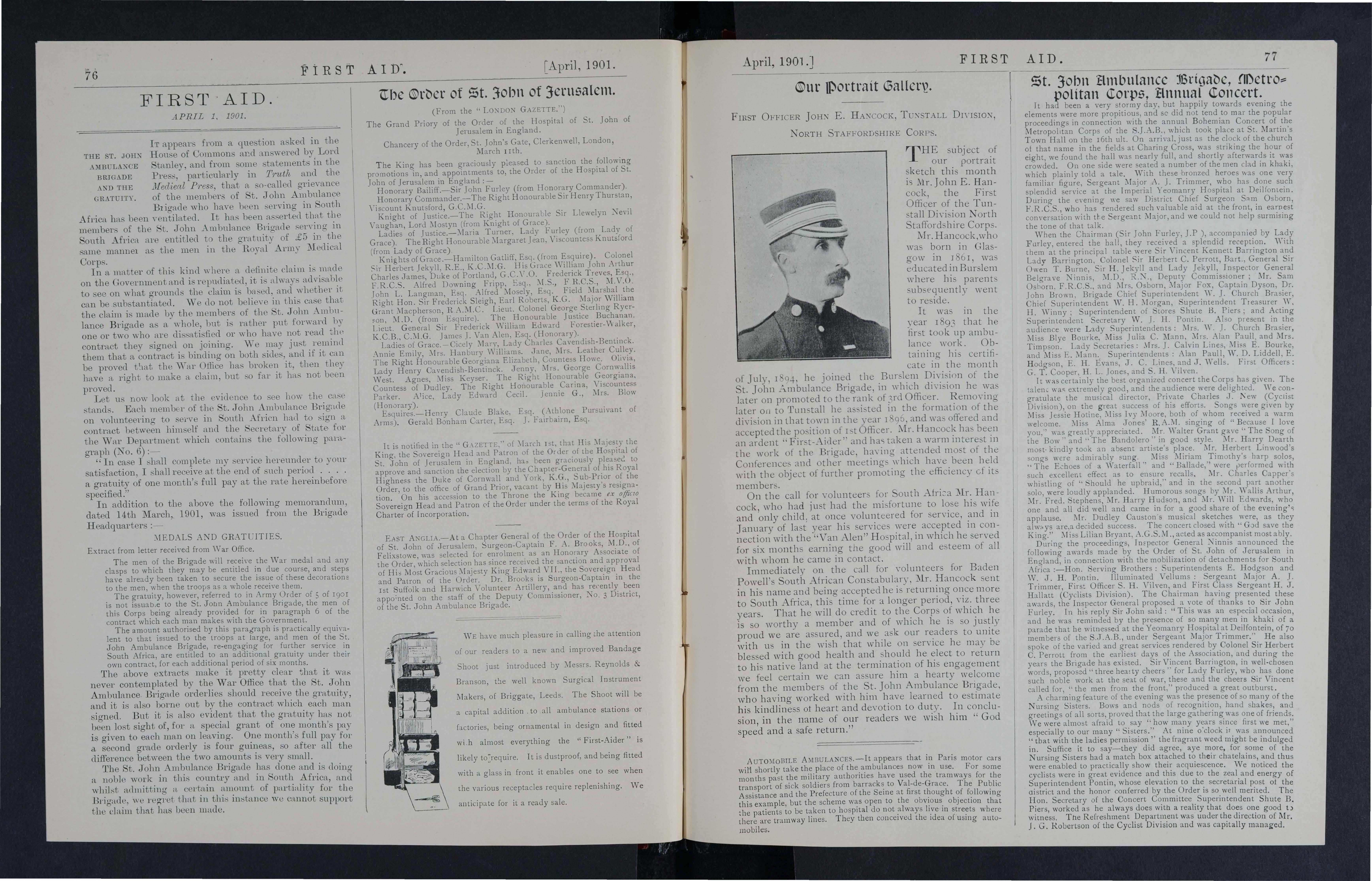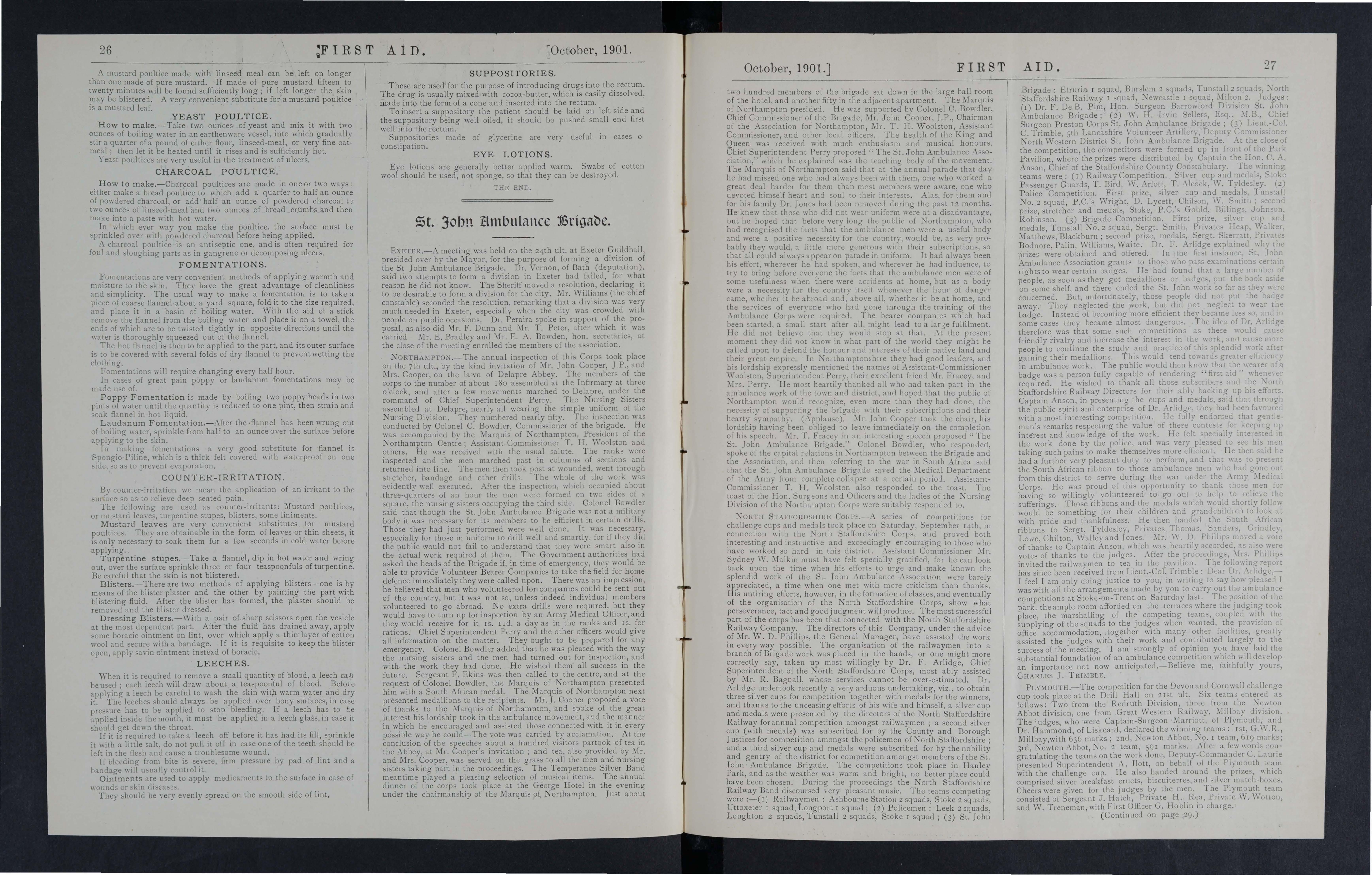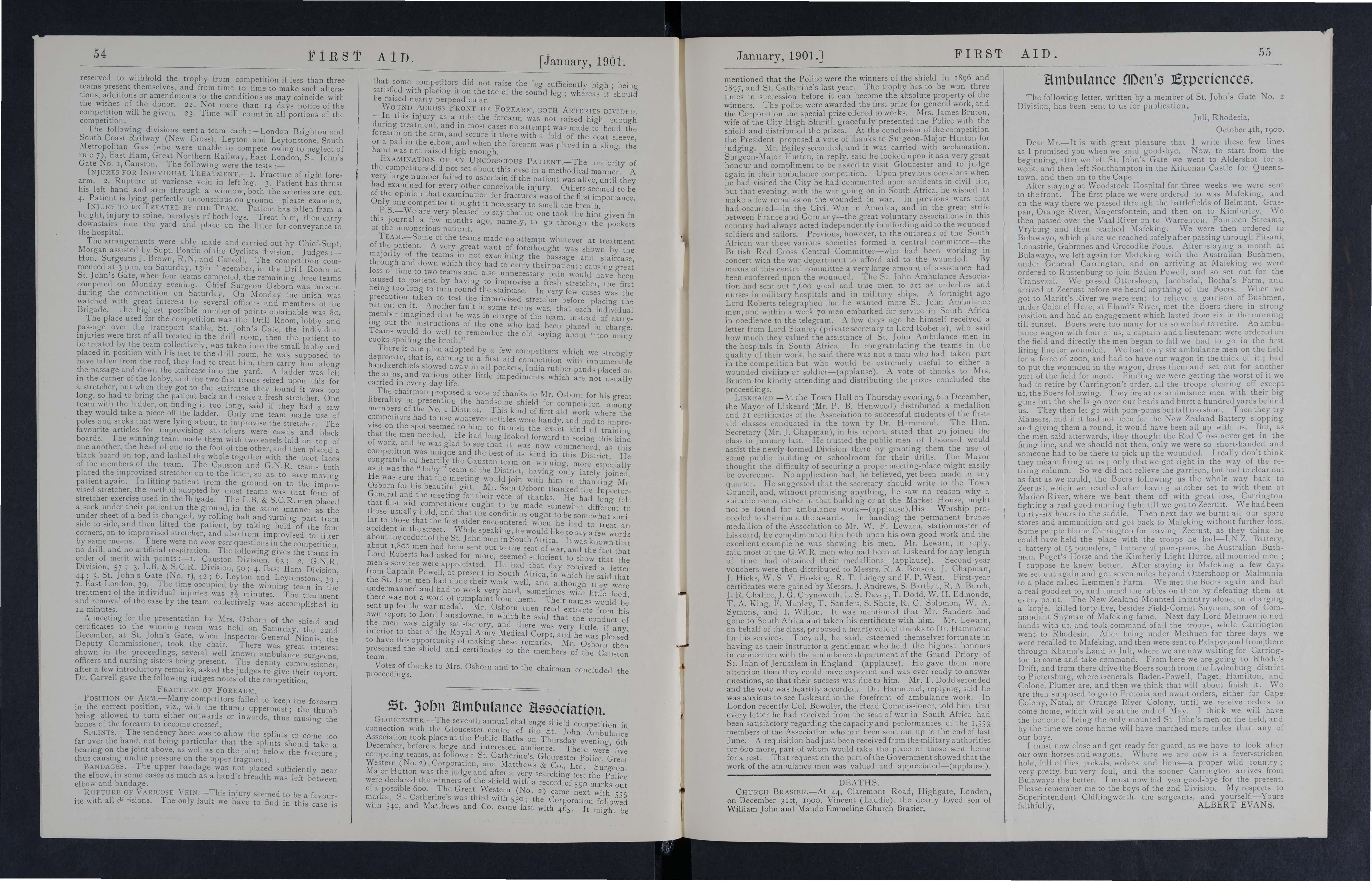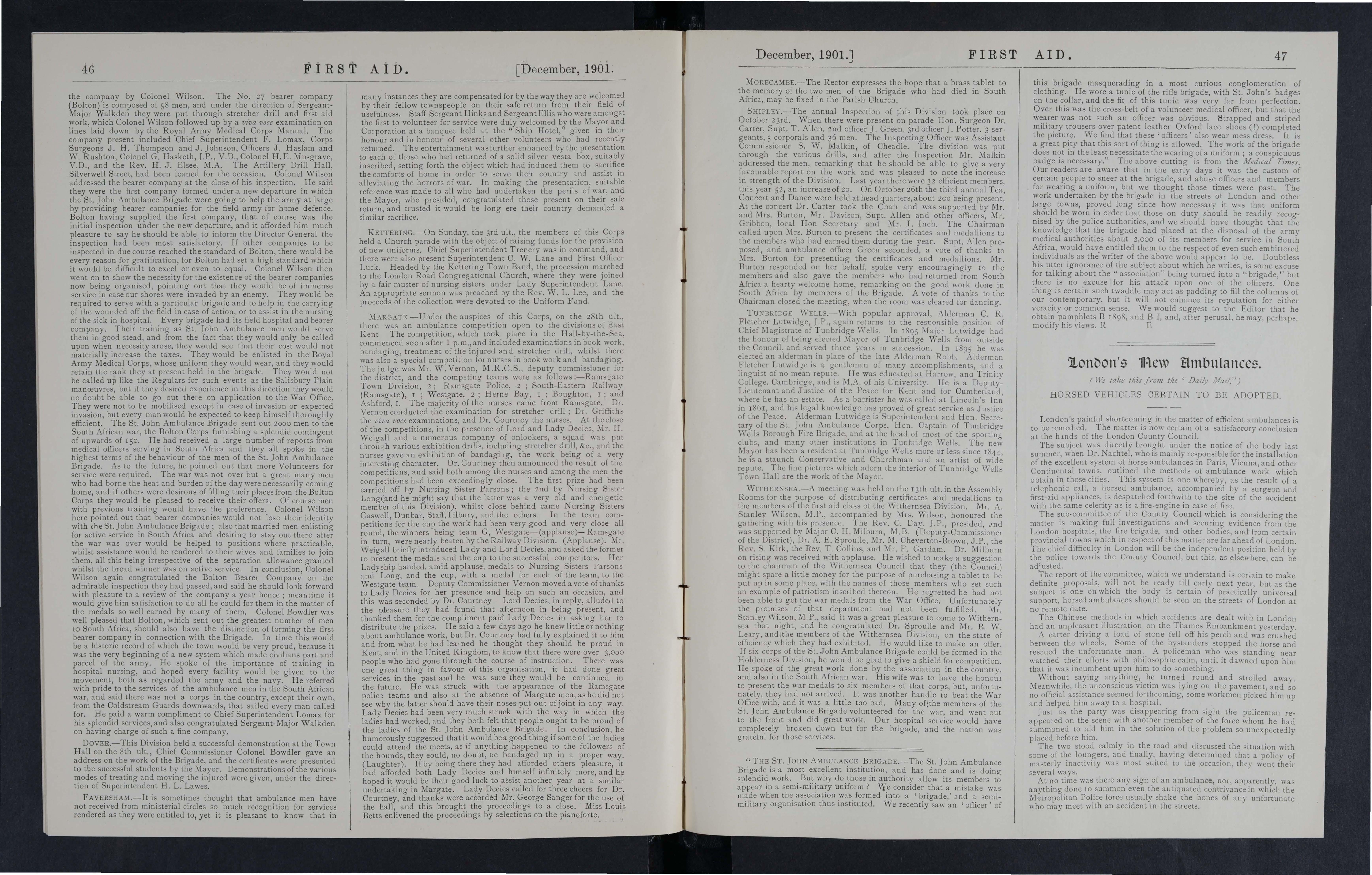 year bas clo eel, a.nd truly it has 1900. been nn eventful one in the annals of ambulnnce organizations. The noble ,york by the members of the St. J ohn Ambulance Brigade who volunteered at once in sucili la.l'ge nUmbel\ when duty caned them to aid their countryUlen at the eat of war will liye in the minds of men and women, not only of our own vast empire, but of all civilized countl·ies of the world. I t has proved no ta k that they undertook, and. t?e cond.itions at time:; have been yery difficult, l'eqUlrmg an ImmenSe amount of endurance It is the opinion of all who ha\-e witnessed the work these men haye done that they are de erving of the highest praise and thanks, and we s incerehr tender our hearty J 0 to those \",ho are once m01'e home. and our sympathy with tho:,e .who the loss of dear ones who haye giyen then' lives fOl' theIr Queen and country and ill the Cl:\use of humanity. We and all ambulance workel's would remembeI' tho e officials at headquarters whose devotion to duty cost them many months of absence from home and short sleep at night-they, too, have performed a tl'uly noble work.