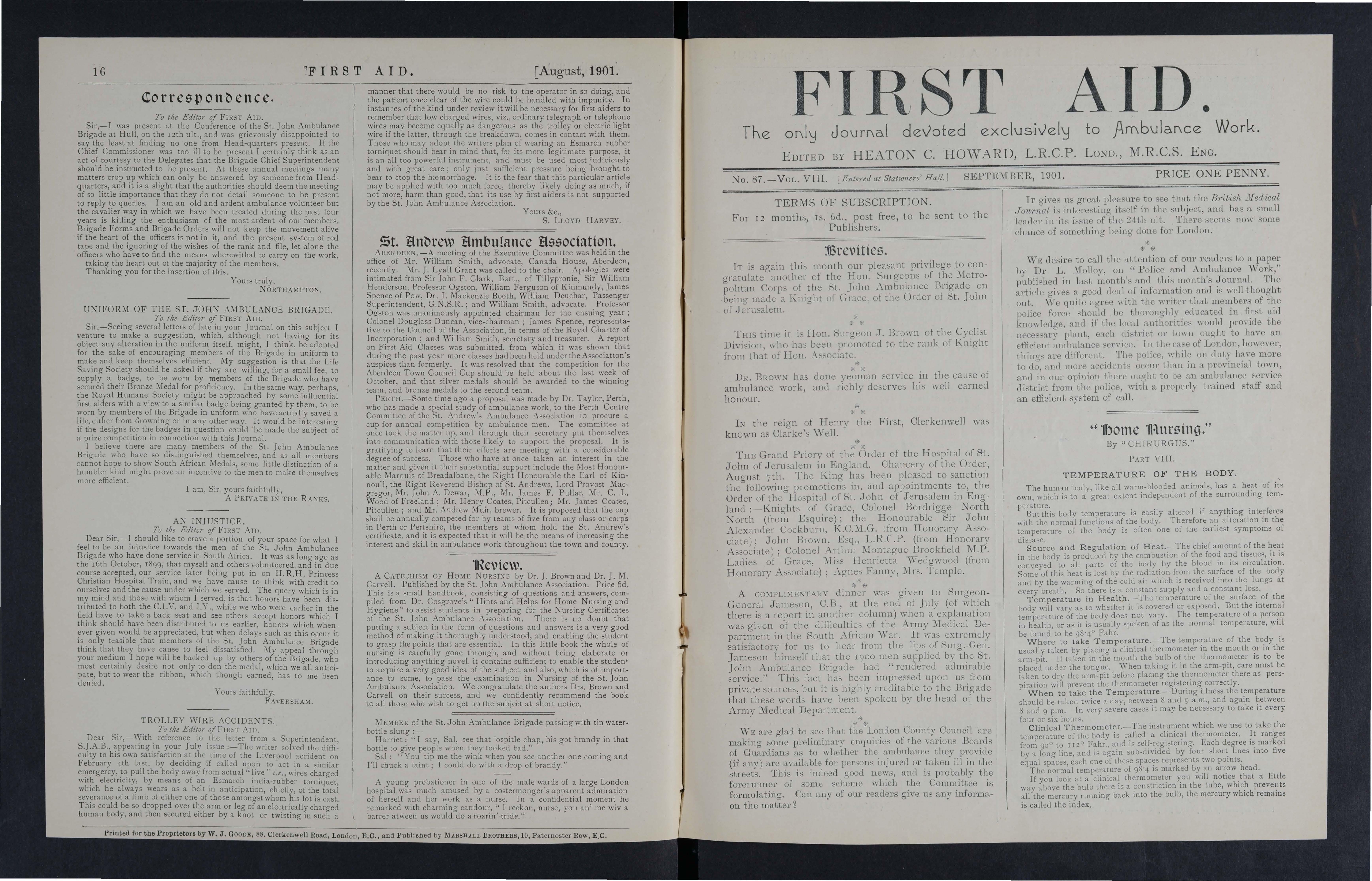 t::lIR.--I read in the daily paper a few days ag-o that a white helmet was under consi::.leration for the :\1e tropolitan police to be worn during the summer months, and that a pattern was likely to be soon settled upon. Tbis eminently sensible plan re calls the cor re sponder.ce which occurred in "First Aid" a few months ago. in which numerous correspondents relieved their feelings upon the subject of the St. Jobn Ambulance BriO'a de uniform. You very kindly at that time found room for a rath;r long letter from me upon the sunject, may I ask you to aO'ain throw open your col um ns to the discussion in the hope that our "authorities may be induced to give the matter serious consideration. Unless some thing is done the poor t. John's man will shve like a niO'O'er all day, but un like the nigger, he will be ciothed in a 1 hick tunic and wear a heavy black cap, under such conditions e\'en our Ethiopian friend would conslJer the labour ardUOLIS. E 'en if the tunic question is t('o big to be attempted, we mig-ht,.as a small concession be allowed a cooler cap. Could not one be deVIsed WI th a white line'n fall beh ind (I do not know the correct name of this arrangement) so as to protect the nape of the neck, judgi ng fro.m illustrations some such arrangement u sed to be worn by tbe troops III India. am a fraid that the real reason or negl ect of th is quest on is that of the expe05e it woula entail, although in many diyisions whir.h pay lor their own uniforms, this outlay would be cheerfully the members as I have good reason to know. In re gard to those in which 'the uni form is supplied tree to members, the difliculty would arise but surely could be o\'ercome. Is the St. John -\mbulance short of money? If so, why does it not announce the lact?