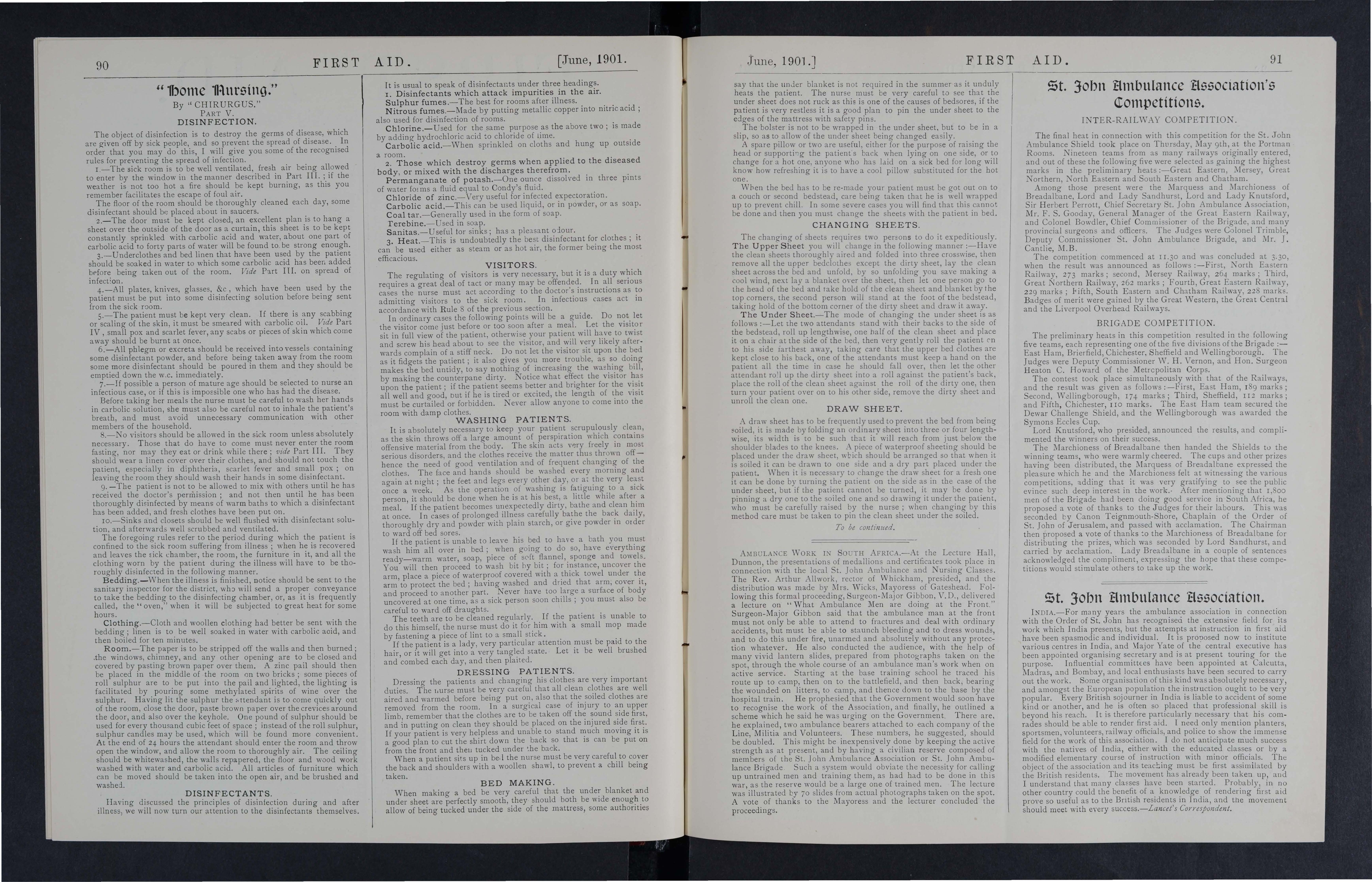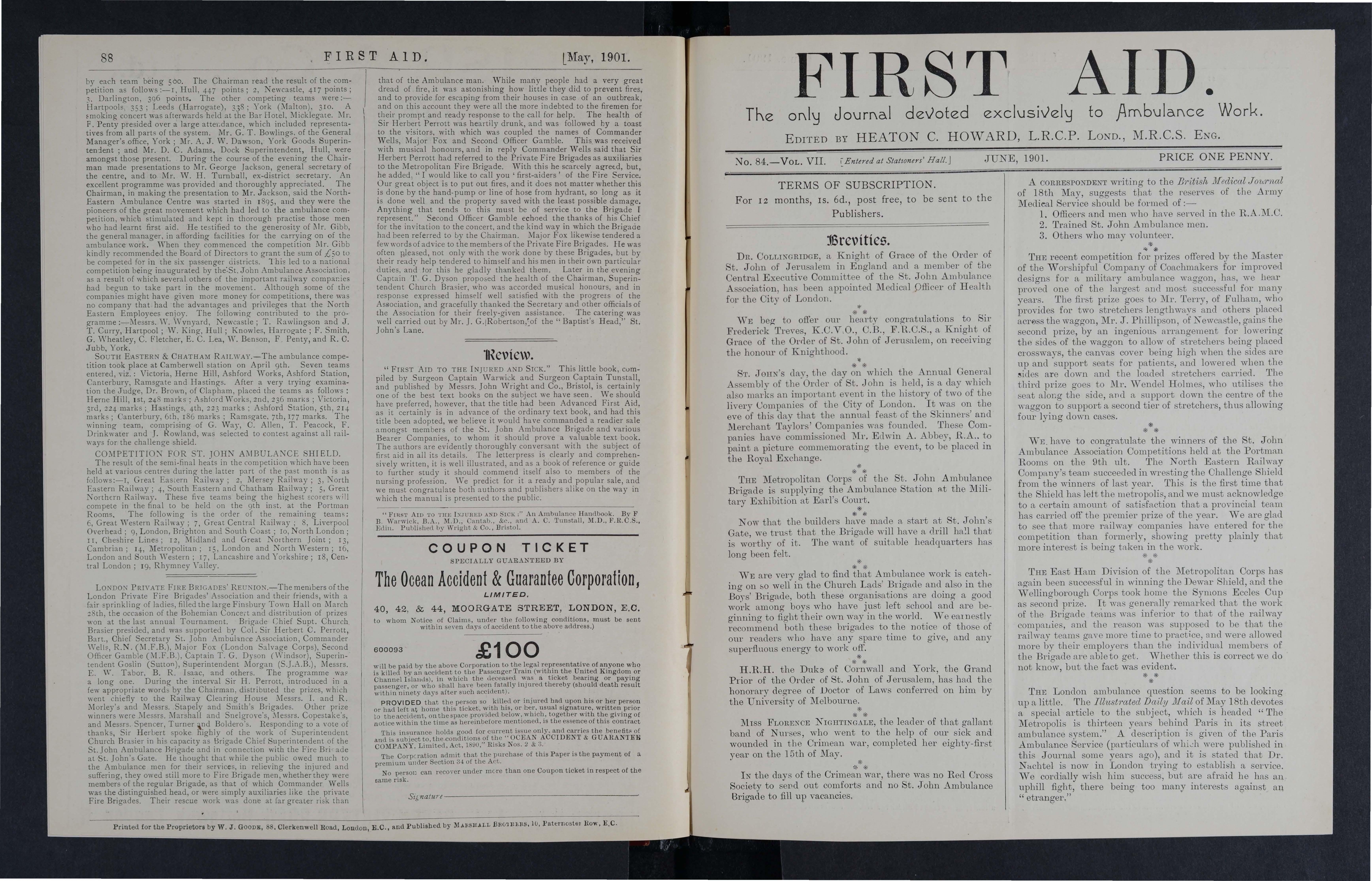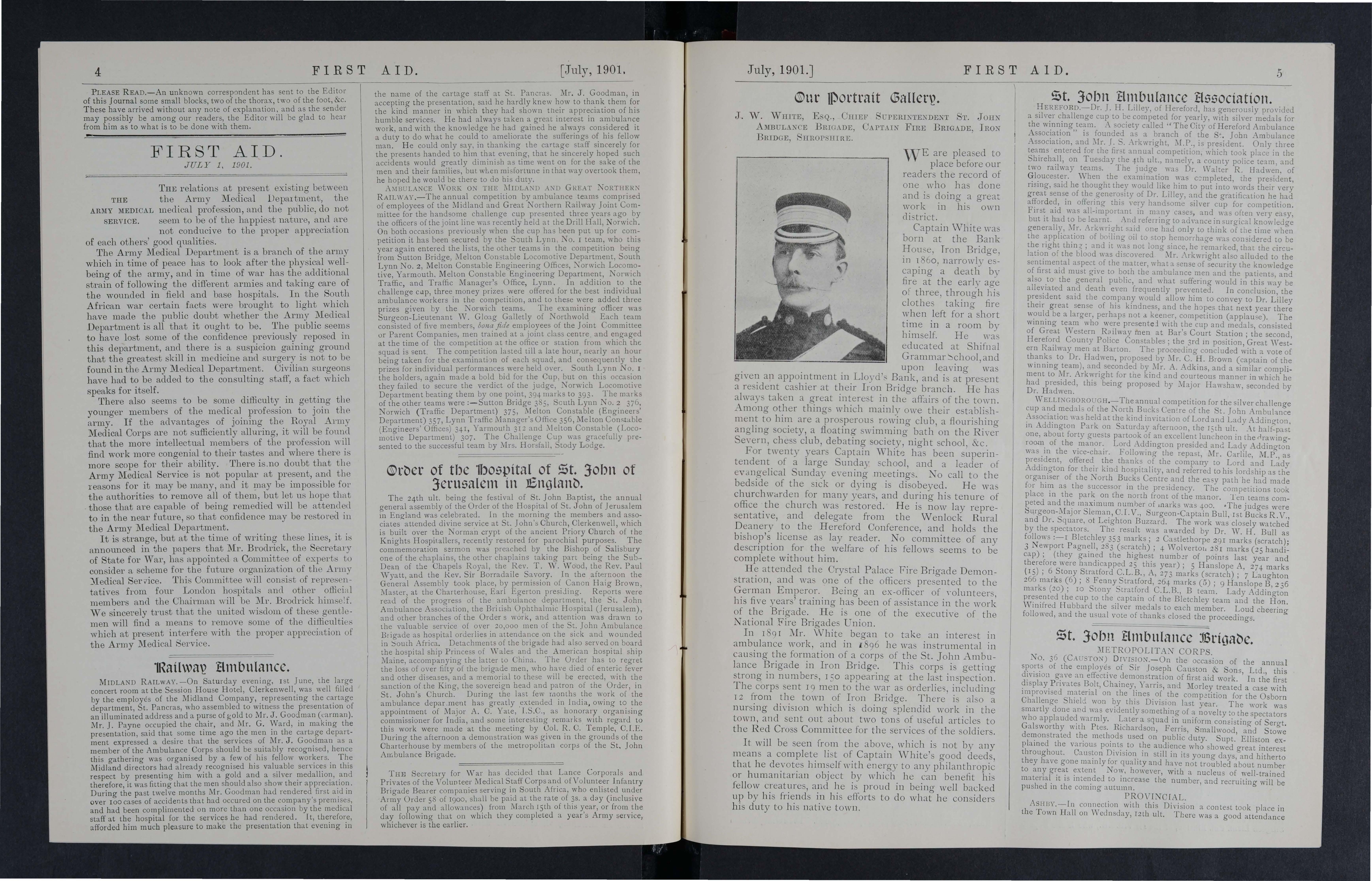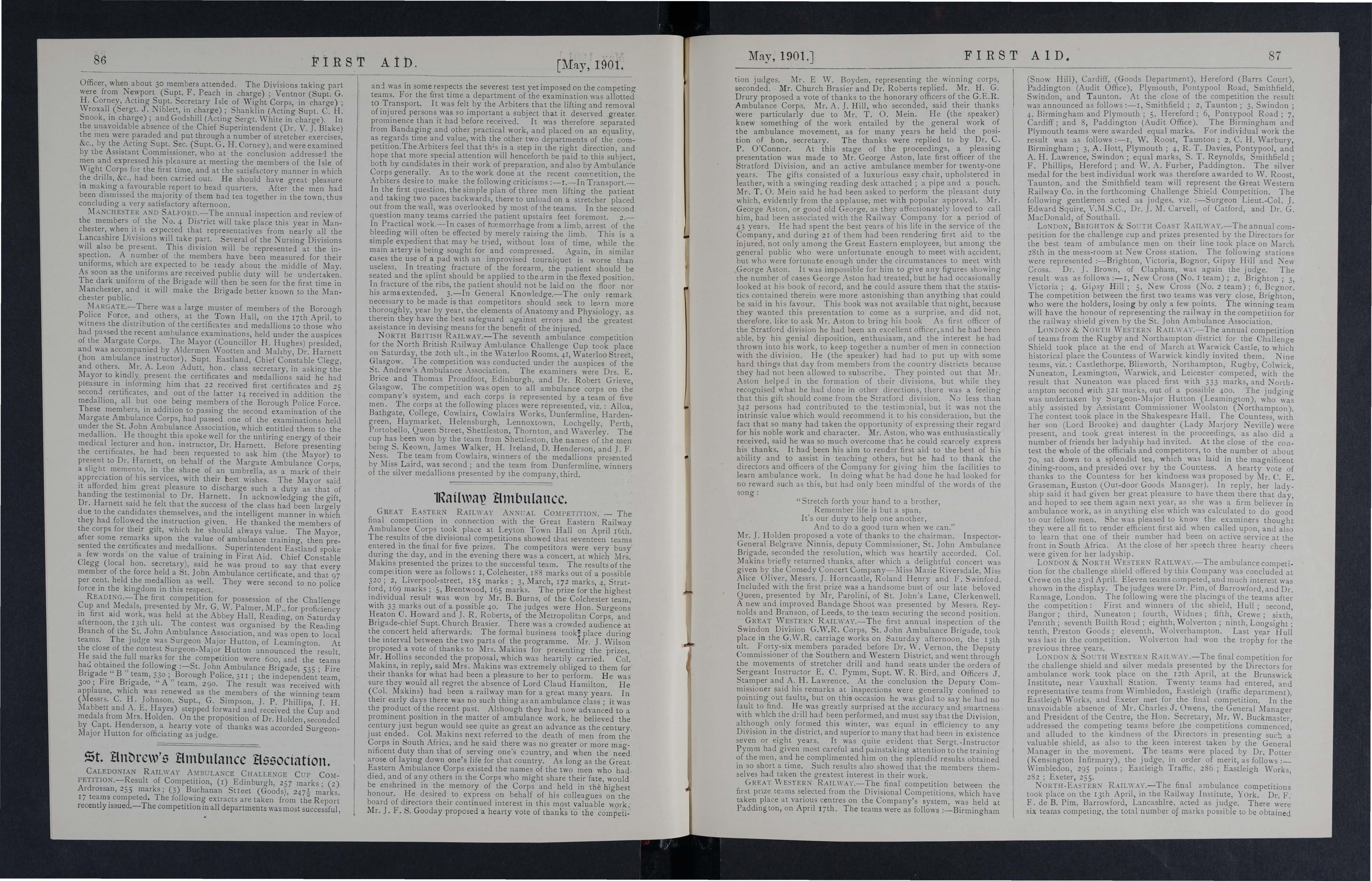 In .Tanuary H.R.H. the Prince of \Vale (Grand PriOlO of the HospItal of St. John of J eru alem in En 0'land) pl'esented the 'erviee medals awarded by the Chapterto the first officers of the St. John Ambulance Hrigac1e. The final heat of the Annual R ailway AUlbulance Uumpetition was held at Portma.n in :May, when the coveted prize fell to the Great .N orthern In.J ULe valuable assistance was rendered by the Great Western Railway Company's Ambulance after the serious a ccident at Slough. The Order of St. John suffered a great 10 by the death of its Secretary General, Capt. Sir Alfred J ephson, R.N. At the Medical As ociation meeting at Ip wich in Augn. t an Important di cu sion on First Aid and 1'1'ans:port of Sick and Injured in Oivil Life and large town took place. About 1,100 cases wiere dealt ,,,itll by the St. John Ambulance Brigade on the day the C.I.V.'s arrived in London.in adobeI'. Dl1l'ing the year the various railway cOl1'lpame have vied with each ot.her in training their men in first aid methods.