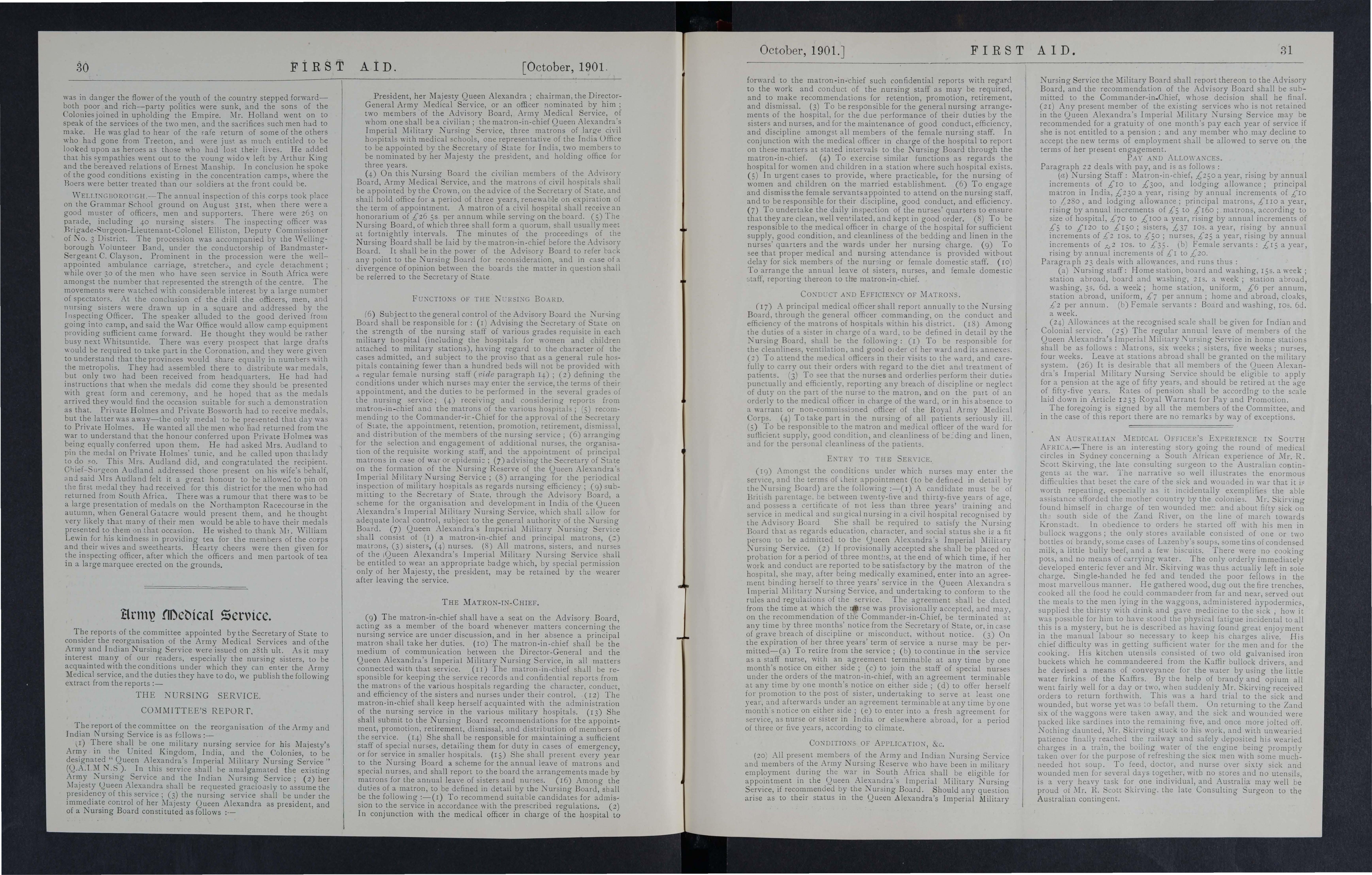 :'Iledi c;tl ervices, \\,illlllEet fornightly, and will report to the 'ecretary of State for W ar upon all concerned witn medicine, surgery, sanitation, and epidemi:: diseases as they affect the milItary ser\'lces," and upon the provision and of h?spitals, and ., upon whate\'er concerns the well ?emg of and wounded; wIll p repare" a sch'i!me the e,;panslOn of the Sel'vl.c e tOr needs of war o r serious epIdemiCS, ancl among other thll1gs 101 employment in the serv'ce of civilidn surgeons, nurses, a nd o rd erlIes, and the uti l isation of all voluntary effort for the relief of the sick and wounded." This body will also eport on plans for hospita ls, barracks, and standing camps, and .on SUIt able clt'Li hospItals as places study for surO'eons and of tralllll1g for nurses of fJueen Alexandra s I mpenal i\ ! ihtary Nursing t::lervice.. The Board will appoint a for the annual inspection, WIthout notice, of mIlItary medIcal establIshments. It will supervise the admission of candidates to the R oyal Army i\Iedical Corps,. and aIrange for examinations for promotion;, whi ch th e y wIll conSIder belon: any names are submitted by the :.v redical DIre, :tor- General to the Commander-in-Chief. Lastly, the B oar d will exercise I. a general control ,. over the nursing service, and "in consultation with the Nursing Board, snail submit to the Secretary of Dtate a scheme to develop th e training of orderlies as attendants upon the sick and \\'ounded " From th ese brief details it will be seen tbat the future efficiency of the Army Medical Servic.es will depend i.n on .the tions of this body, III who se conStItutIOn five dIstII1glllshed CIVIlIan medical O'entlemen have been inclu ded, one being for Ireland and one for This was t he feature of the sc hem e whi ch was most praised at the time of the presentati o n of th e report six weeks ago, an d the Secretary for War has chosen ead ing members of the med ical proto fill th ese posit ions, of whom f\J r. A. D. Fripp and ::;ir Freder ick Treves served in S ou th \frica, and we r e members of ;Ur. Brodrick's Co mmittee. The se five gentlemen are appointed for a period of three year5, renewable on ex piry, except when the age limit of sixty years has reached. E:ach will r eceive" an honorarium. of £200 per annum, III addltlon to hIS out-of-pocket expenses for dULles performed beyond a radius of four miles from Charing-cross."