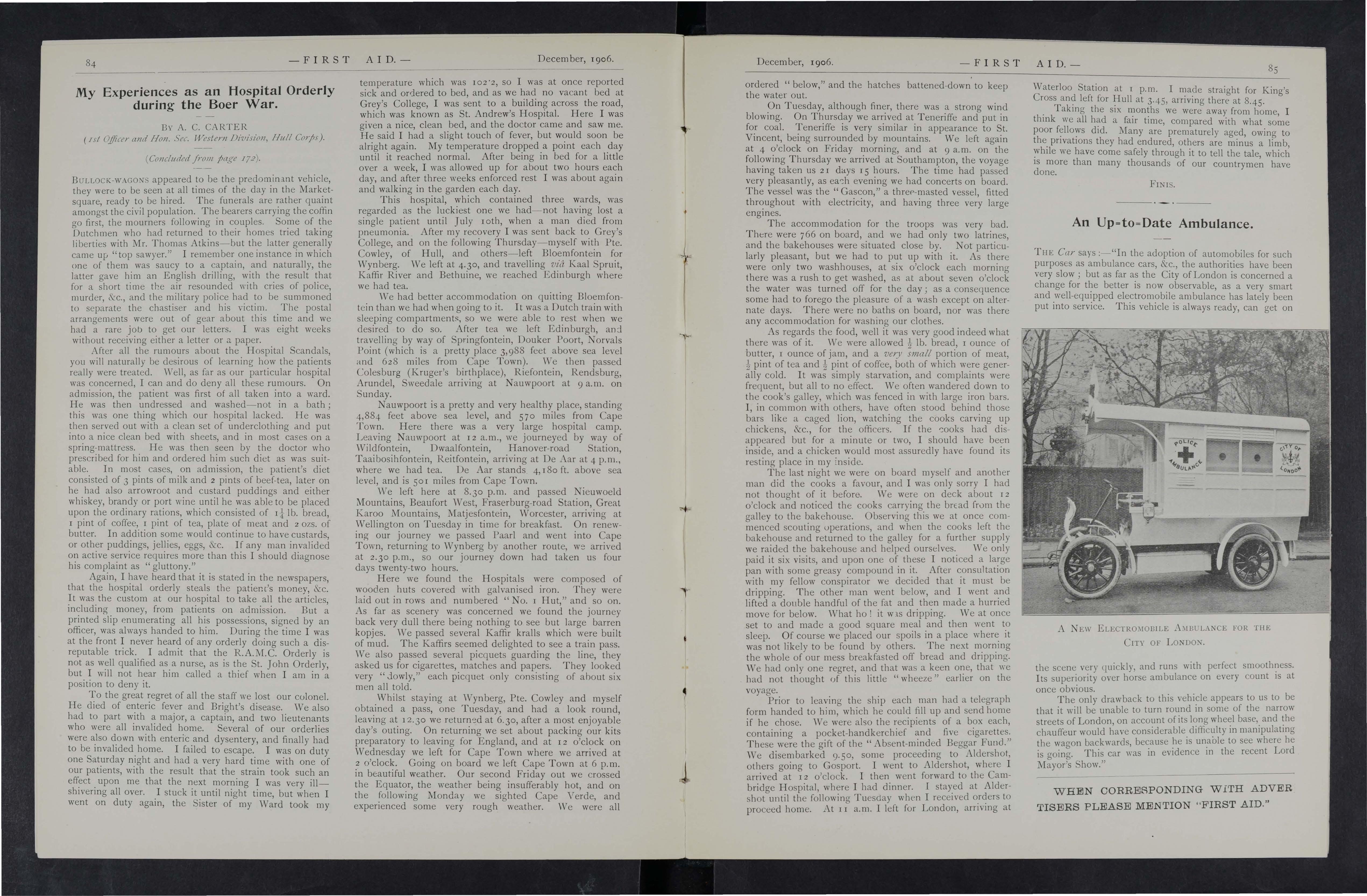 As a consequence of the extensive ex;:>eriments with motor ambulance wagons which have been cond.ucted at Aldershot the 'Var Office is about to place a fairly large order for fhese, as it is now thought that a suitable type of vehicle has been discovered. Those ,\ bo have seen these ambulances at work are agreed that they would be of great service in action, especially in a country where roads were good. Protection is to botb patients drivers by steel shields that are said to proof. agamst rifle fire while the Red Cross, of course, IS conspicuously displaye'd. During the tests at Aldershot the wagons were taken over very rough country with success" whlle they are said to be very economical in the consumptlOn of fuel and water.