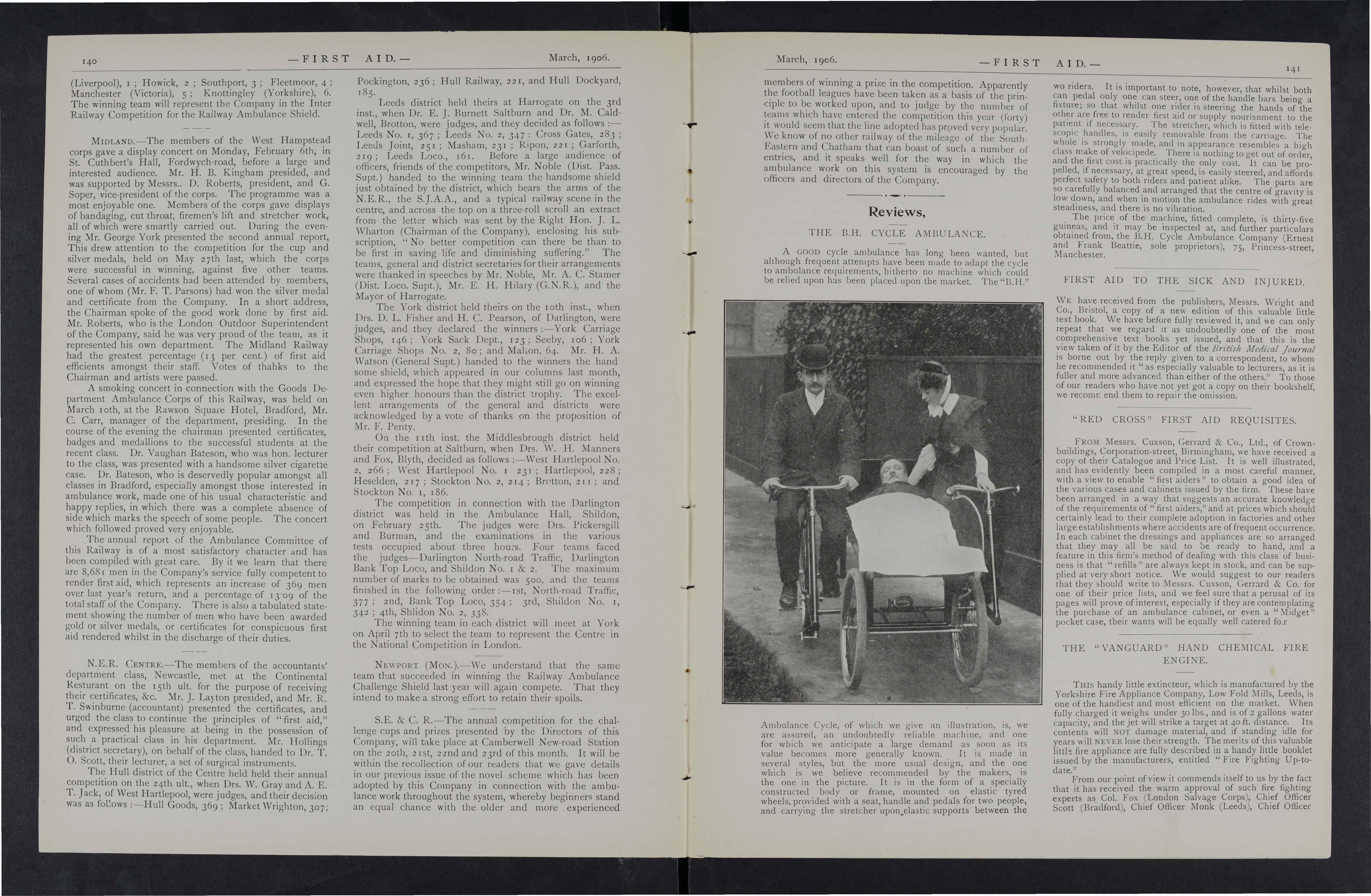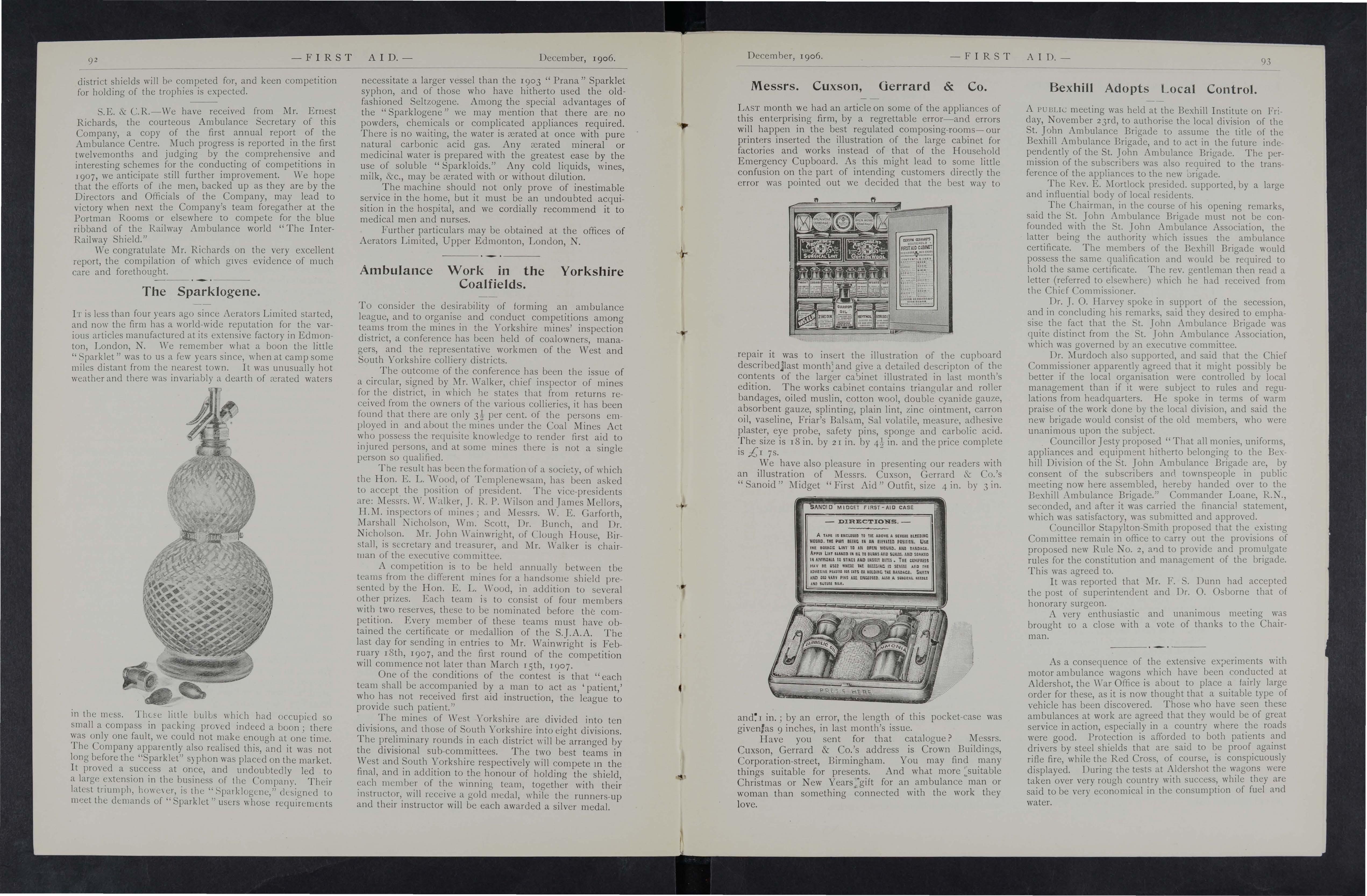 first aid implements, so that an injur ed person could be treated at once, and thus much pain and suffering would be saved before the arrival of the amhulance van.