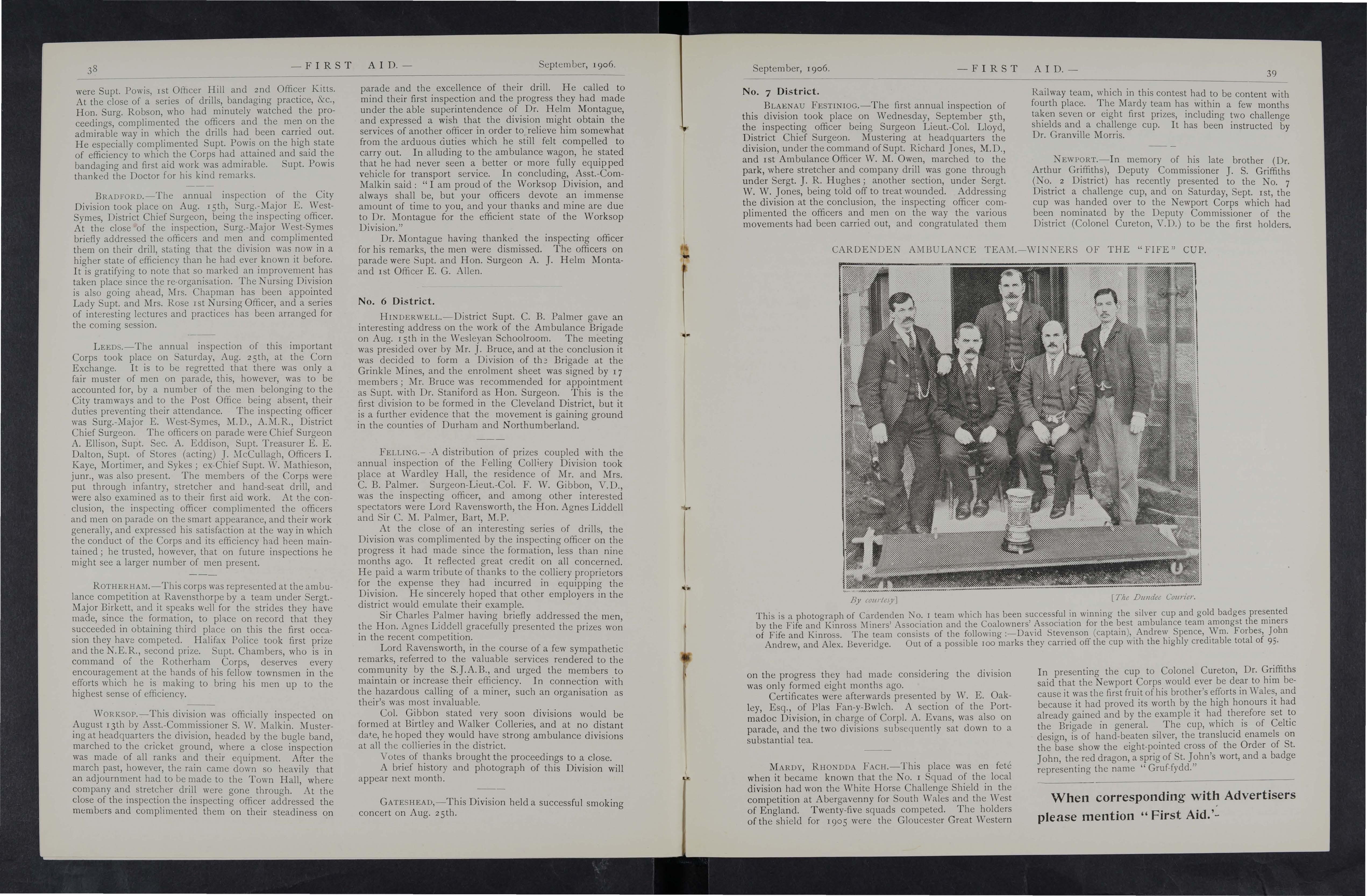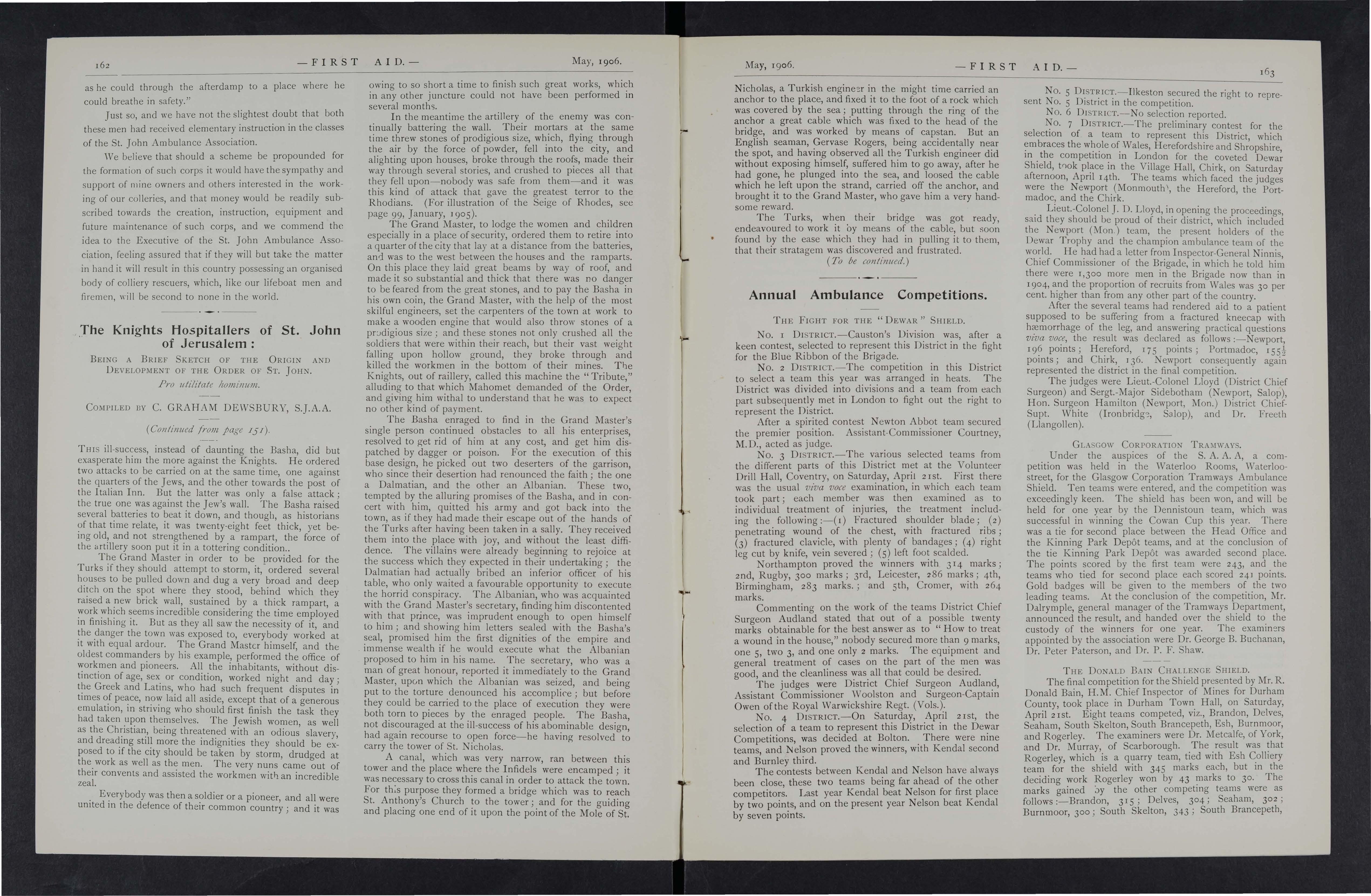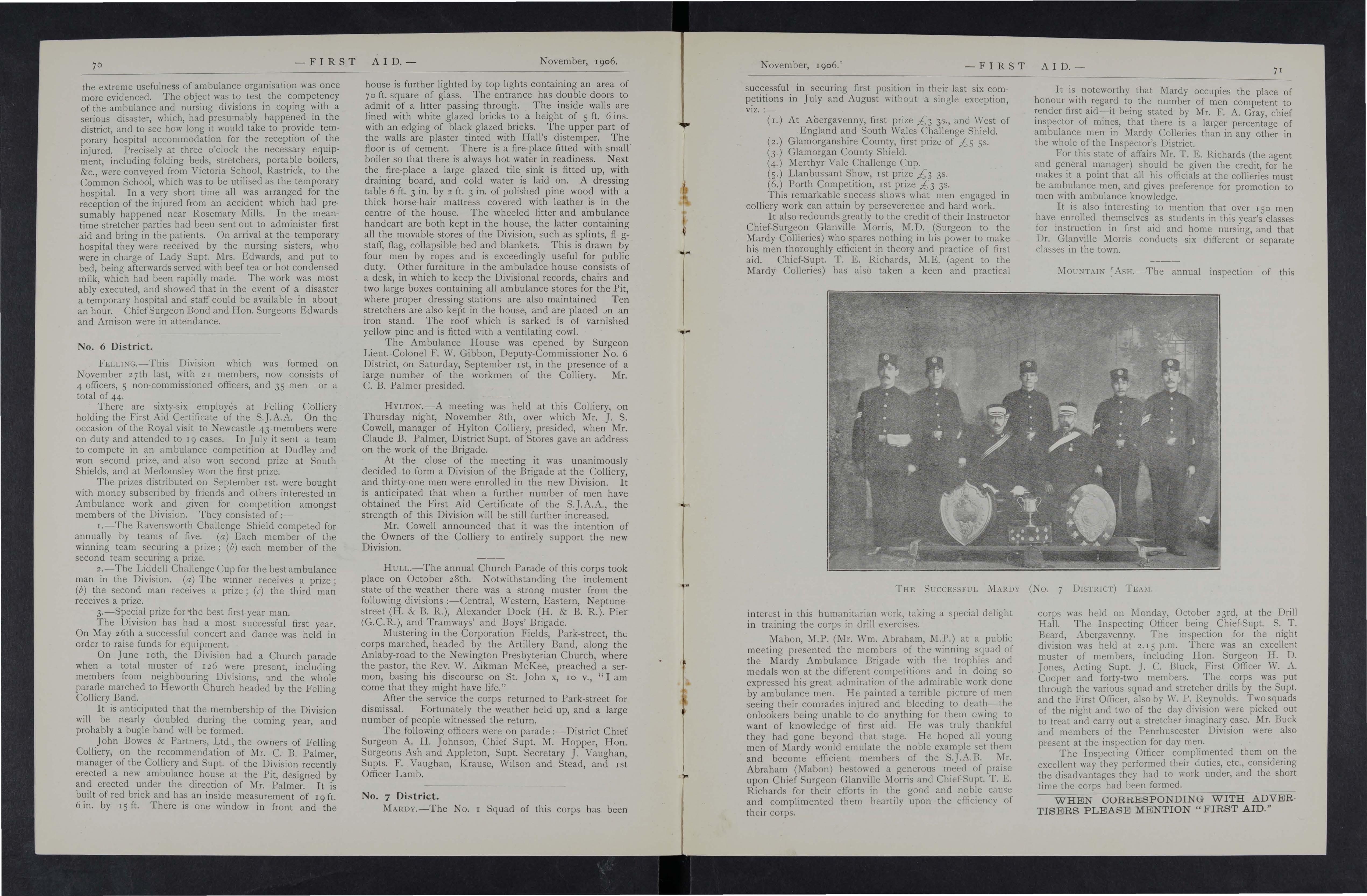 A competition is to be held annually between tbe teams from the mines for a handsome sh ield presented by the Hon. E L. Wood, in addition to seve ral other prizes. Each team is to consist of four mem bers with two reserves, these to be nominated before the competition. Every member of these teams must have obtained the certificate or medallion of the S.J.A.A. The last day for sending in entries to Mr. Wainwright is February 18th, I907, and the first round of the competition will commence not lat er tban March 15th, 19 0 7.