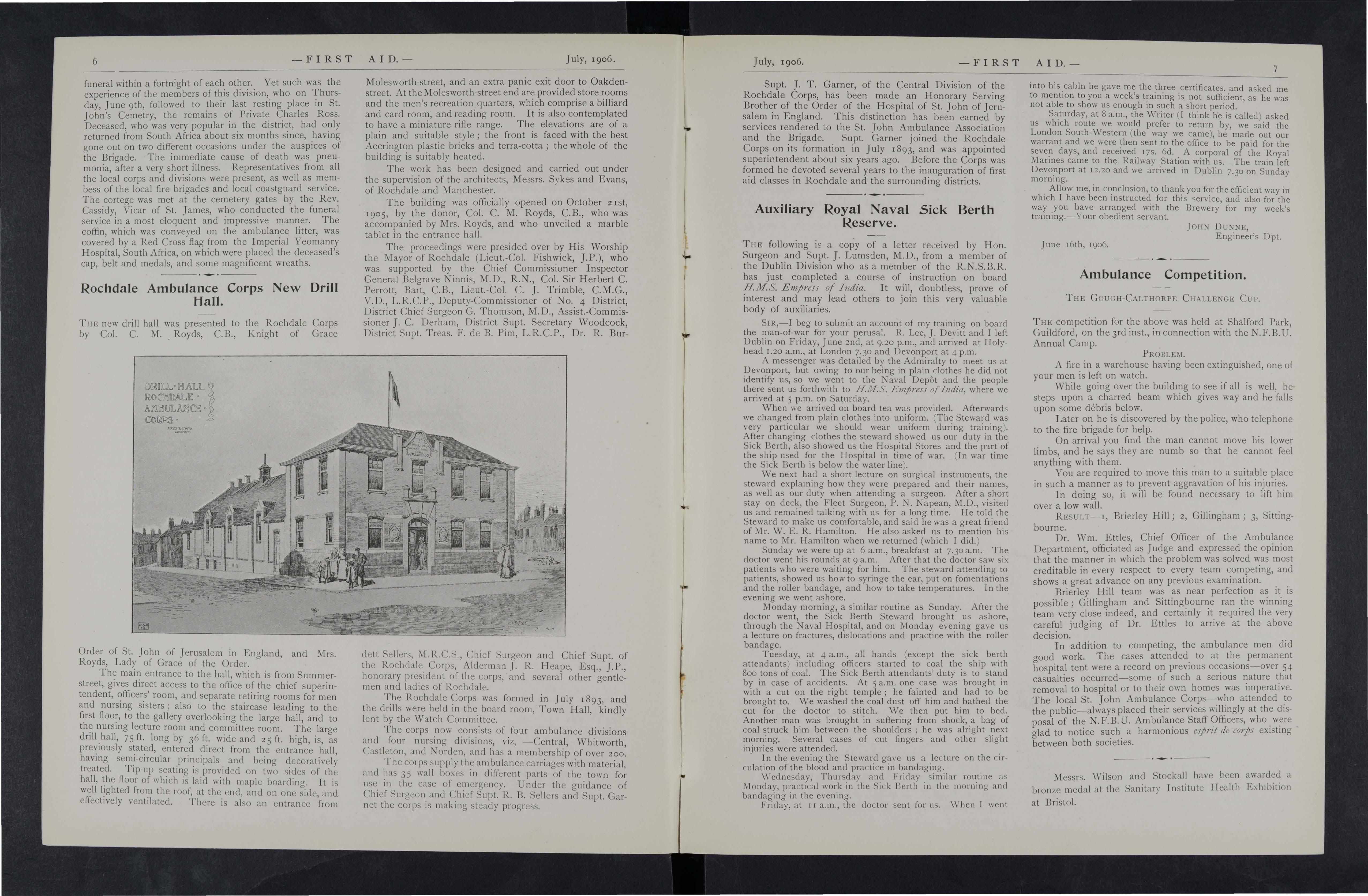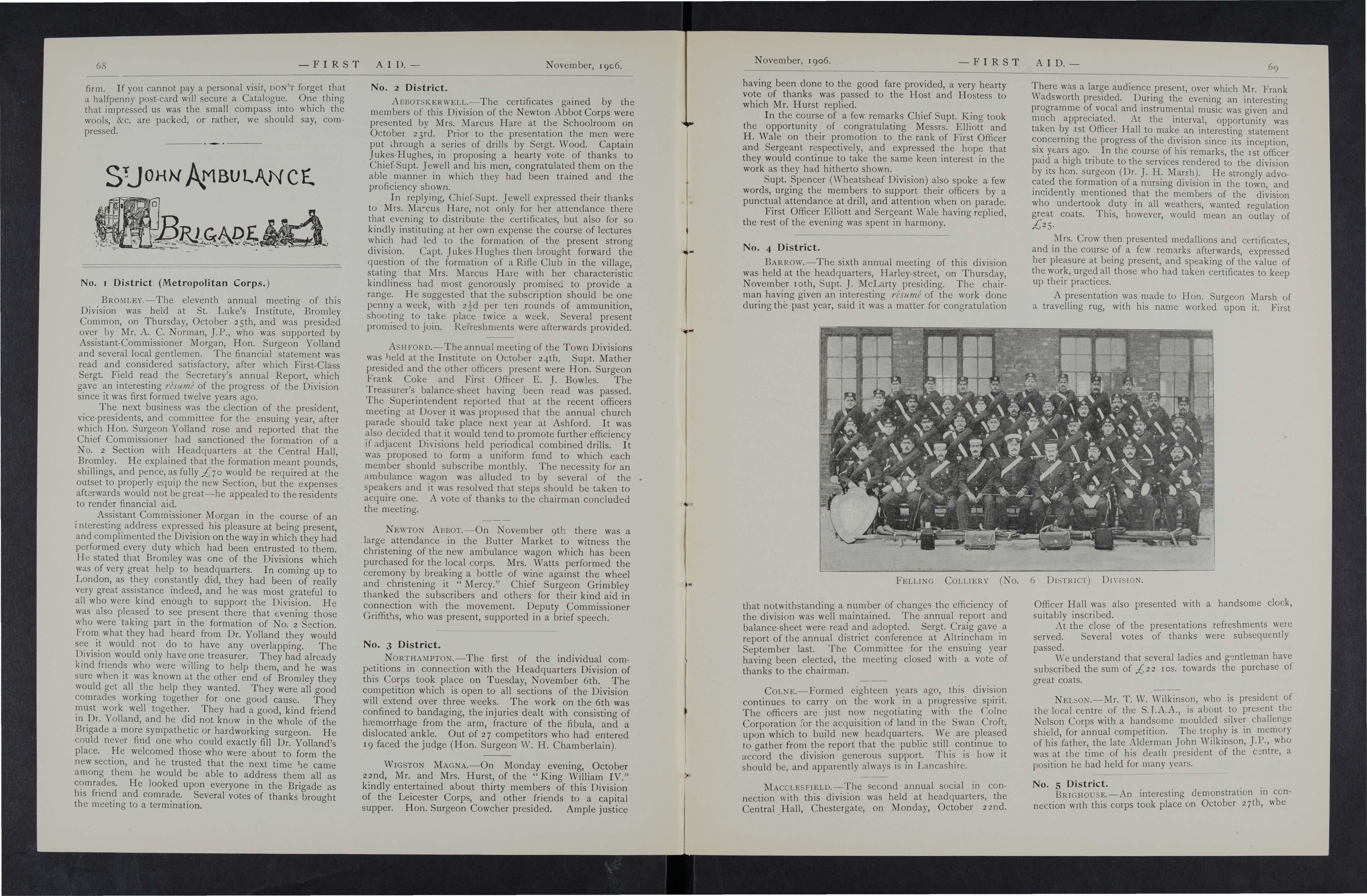 BACUP.- The annua l public tea and social in connection with the Ambulance and Nursing Divisions was held in the Drill Hall, King-street, on Saturday, December 16th, and was well supported. About 80 sat down to tea, at the conclusion of which a concert was held, Hon. Surgeon F. W. Rigby presiding. In addition to a well arranged musical programme, during the evening and dancing were taken part in by thqse present, and the affair, which was promoted with the object of raising funds towards clearing off the debt on the new drill hall, was a very successful one. At the conclusion a hearty vote of thanks was accorded to the Chairman, and to the artists, &c., for their services, on the motion of Supt. W. G. Lambert, seconded by Officer N. Woodhouse.