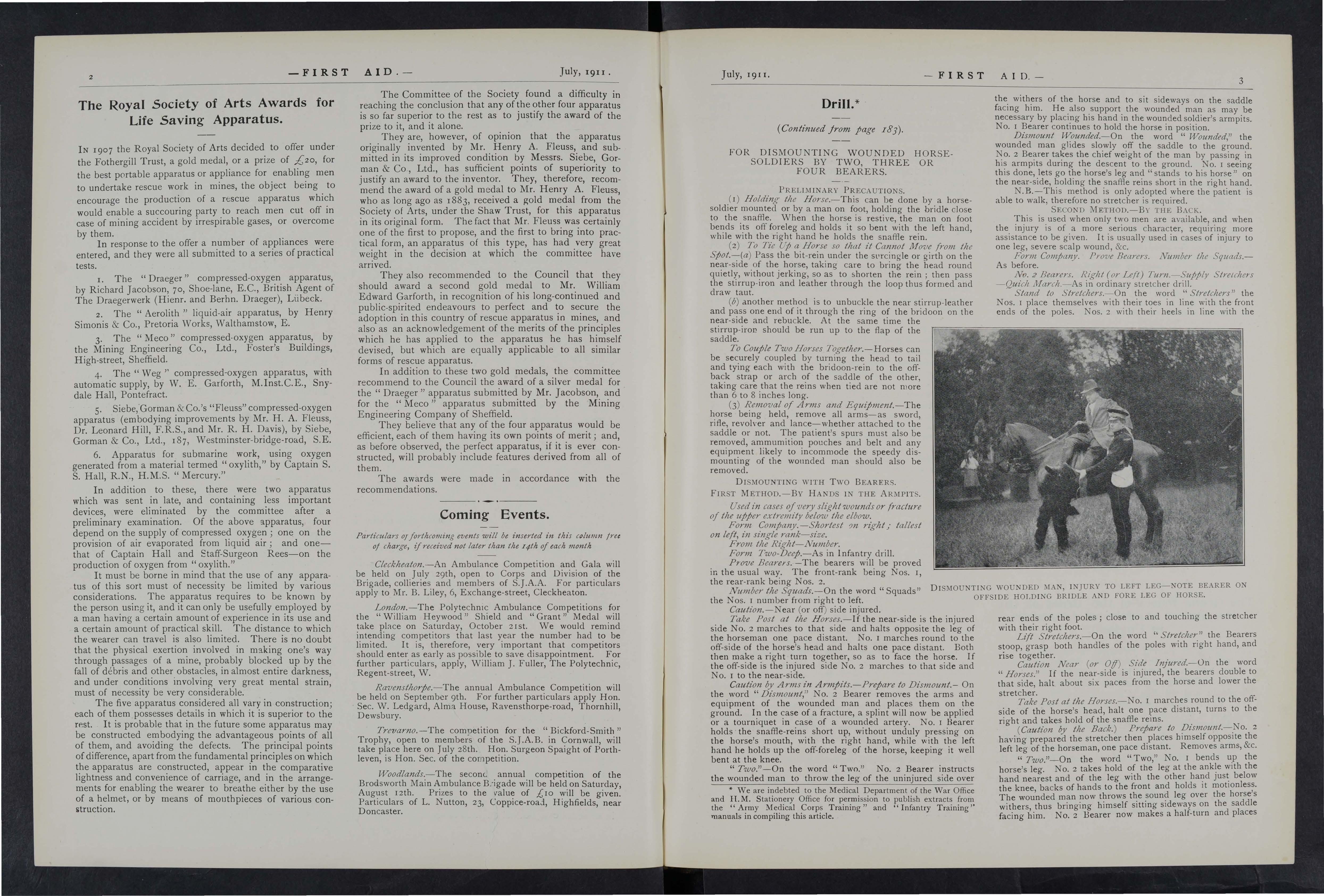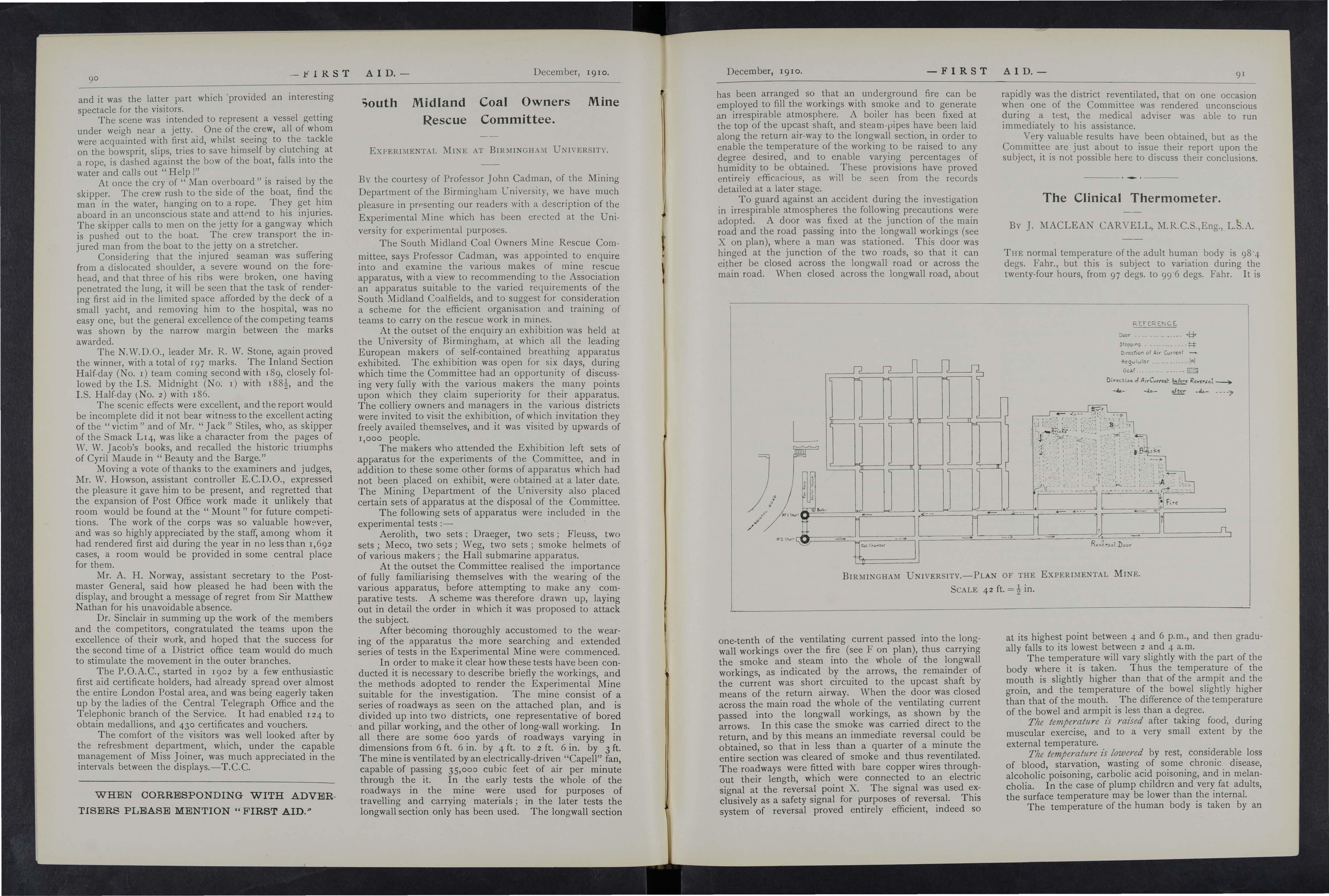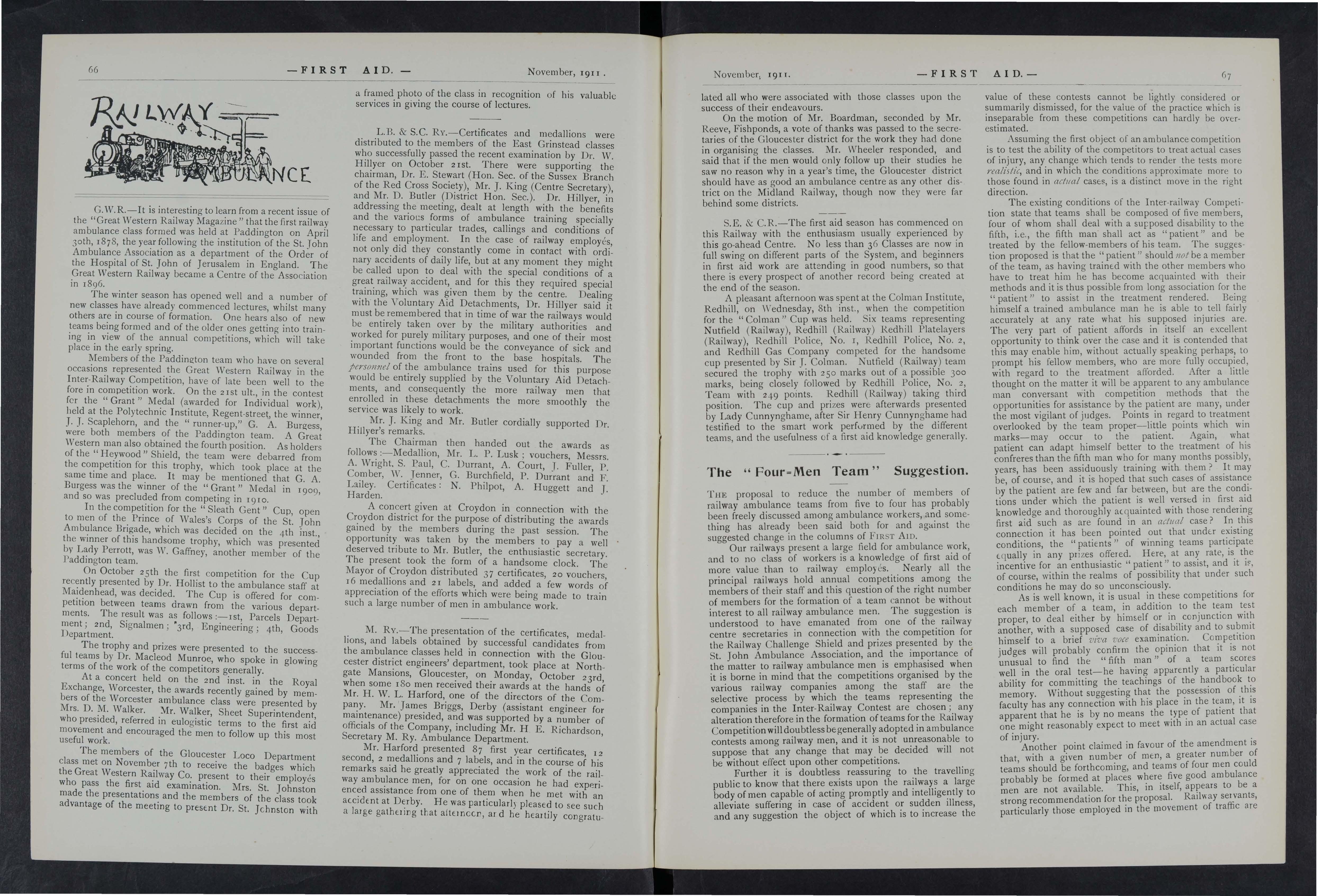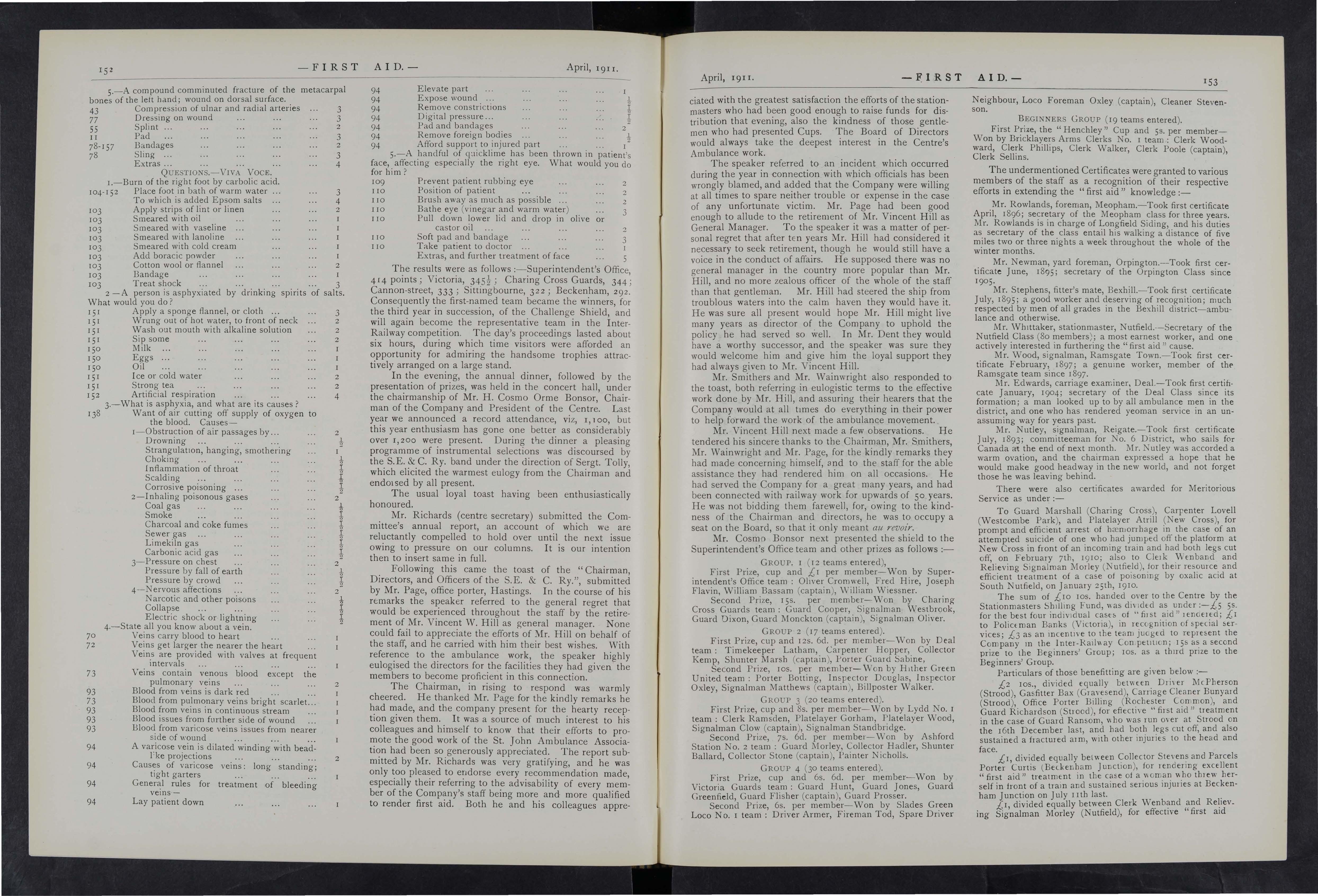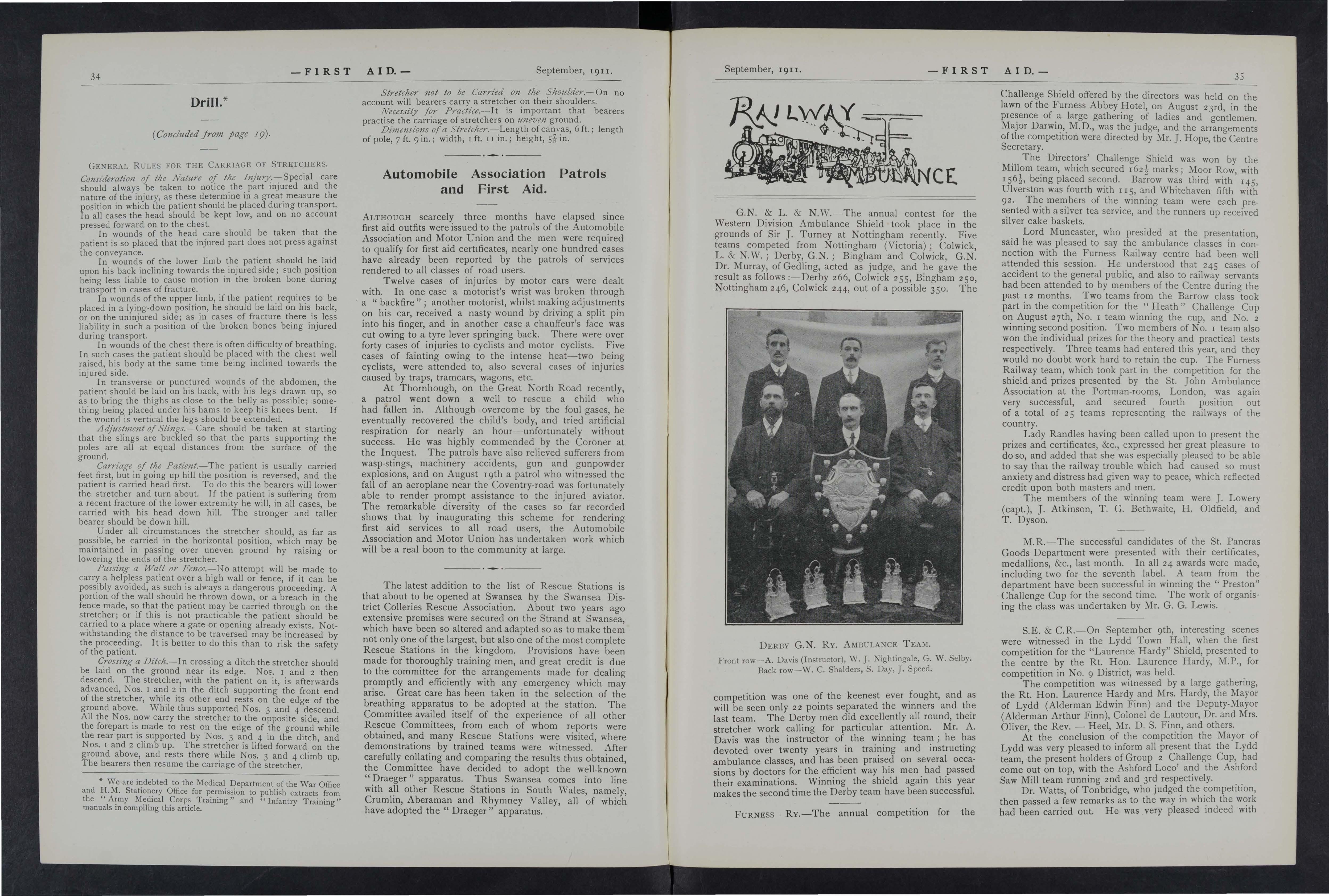 It is gratifying to place on record that dunng the past year several instances of valuable first aid, rendered by the Company's ambulance men have been reported and recognised. In many cases the doctors have reported that the treatment rendered gave evidence of a high standard of proficiency. In some instances first aid was rendered under requiring not only promptitude, but self possession, and courage and an aptitude to intelligently grasp the difficulties of the