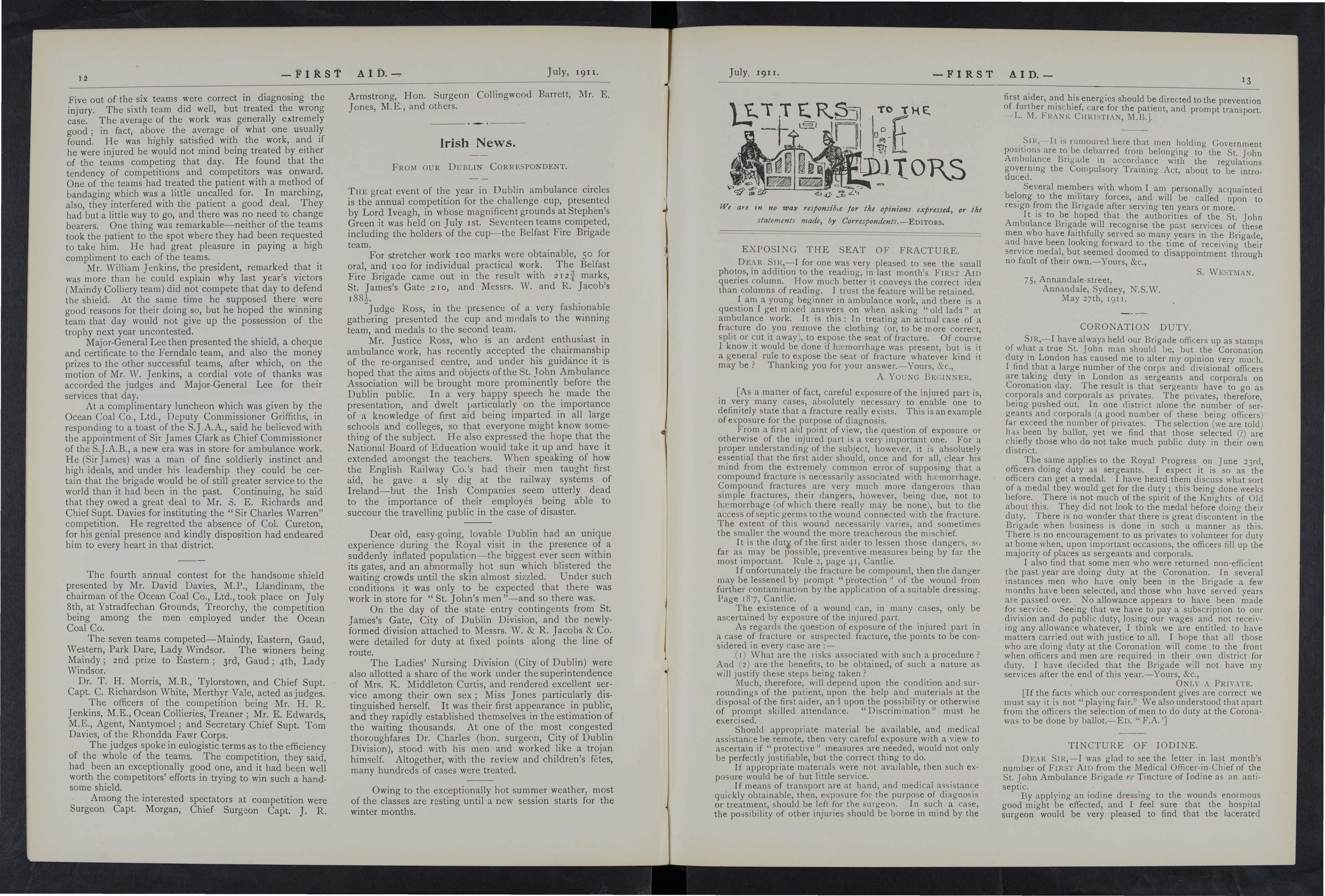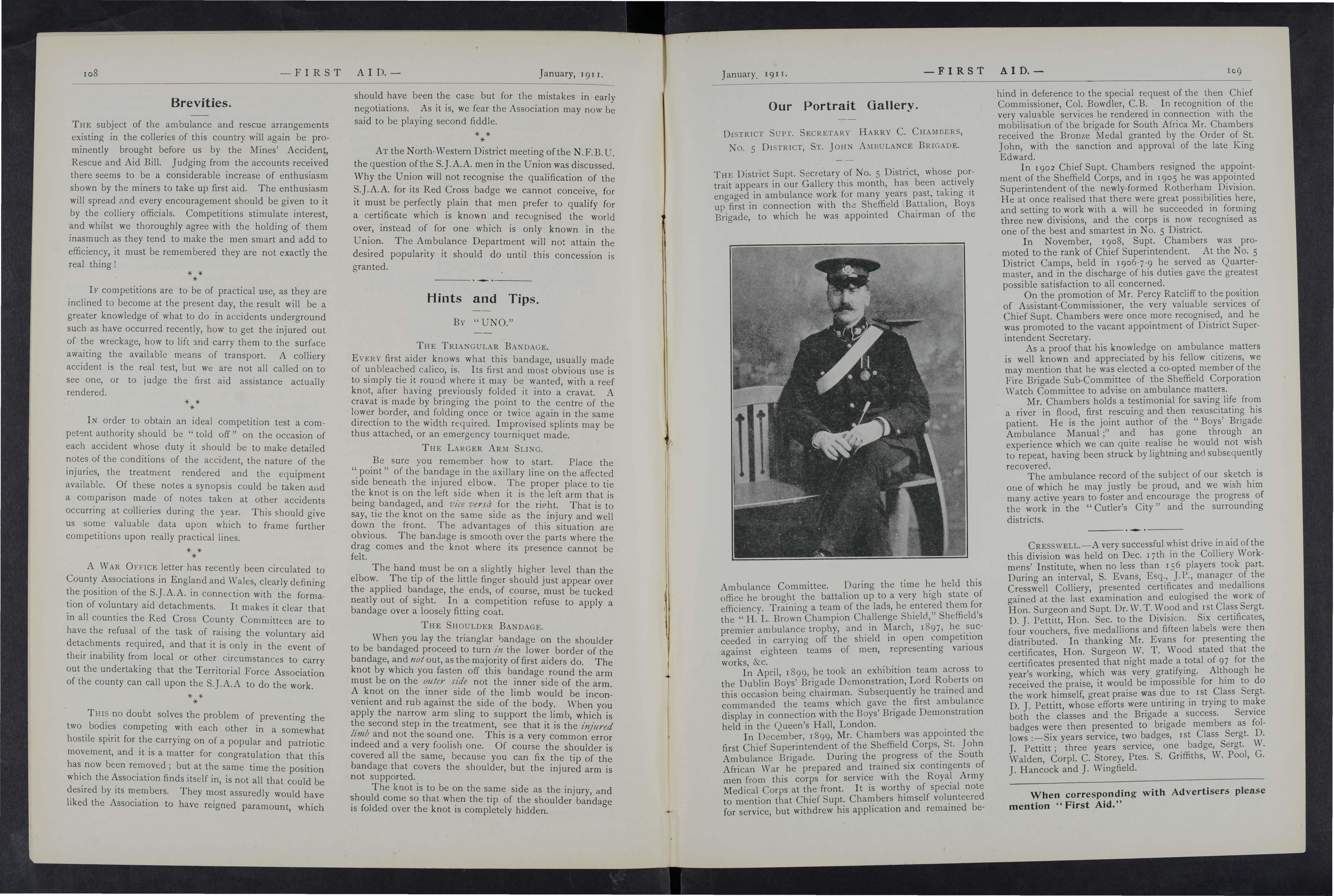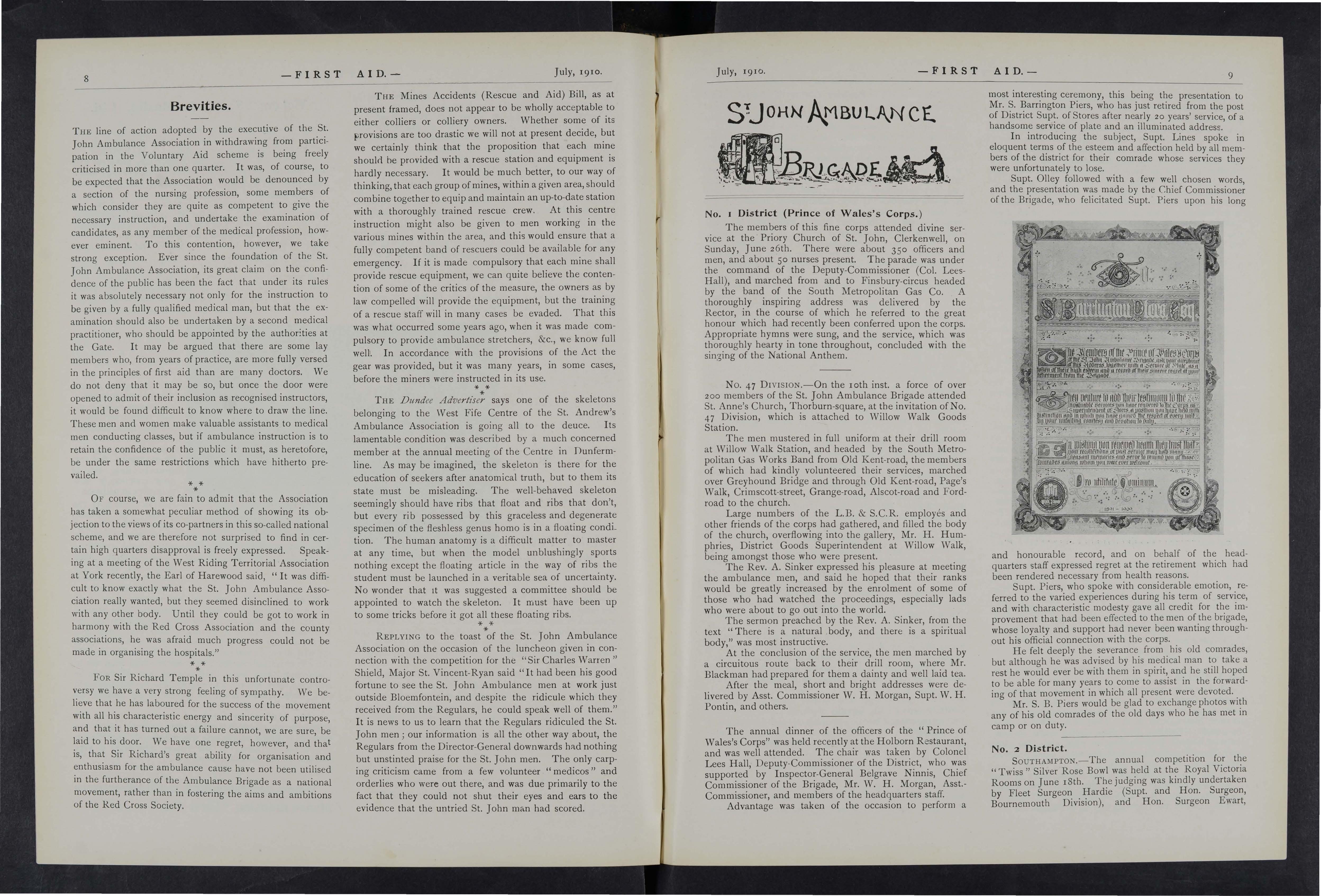 As far as our local press is concerned, I hold that the St. John Ambulance Association and Brigade is deeply indebted to them, as they most obligingly publish any matter sent them on the subject, and thus help to disseminate a knowledge of first aid whi ch individuals cannot possibly do.