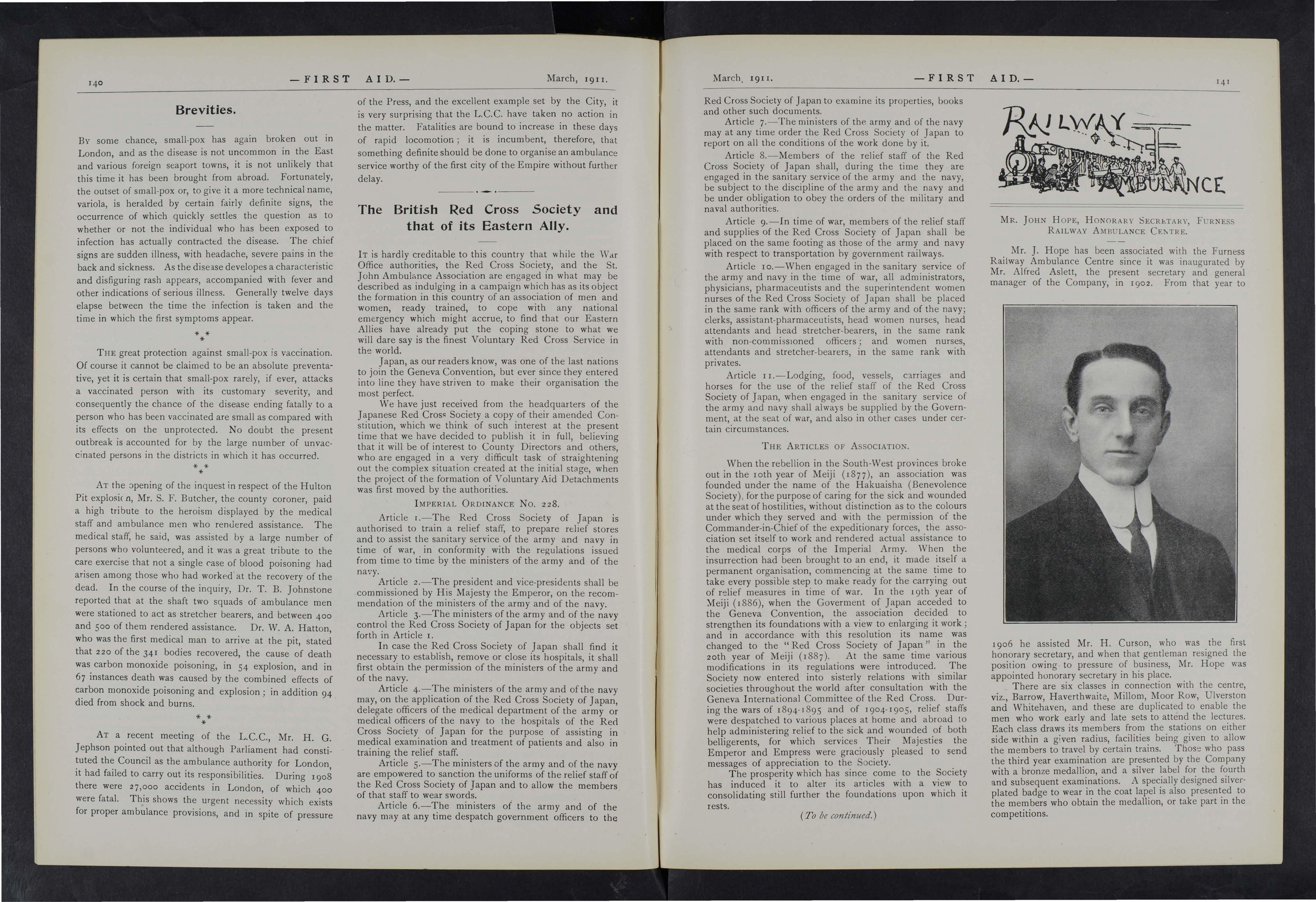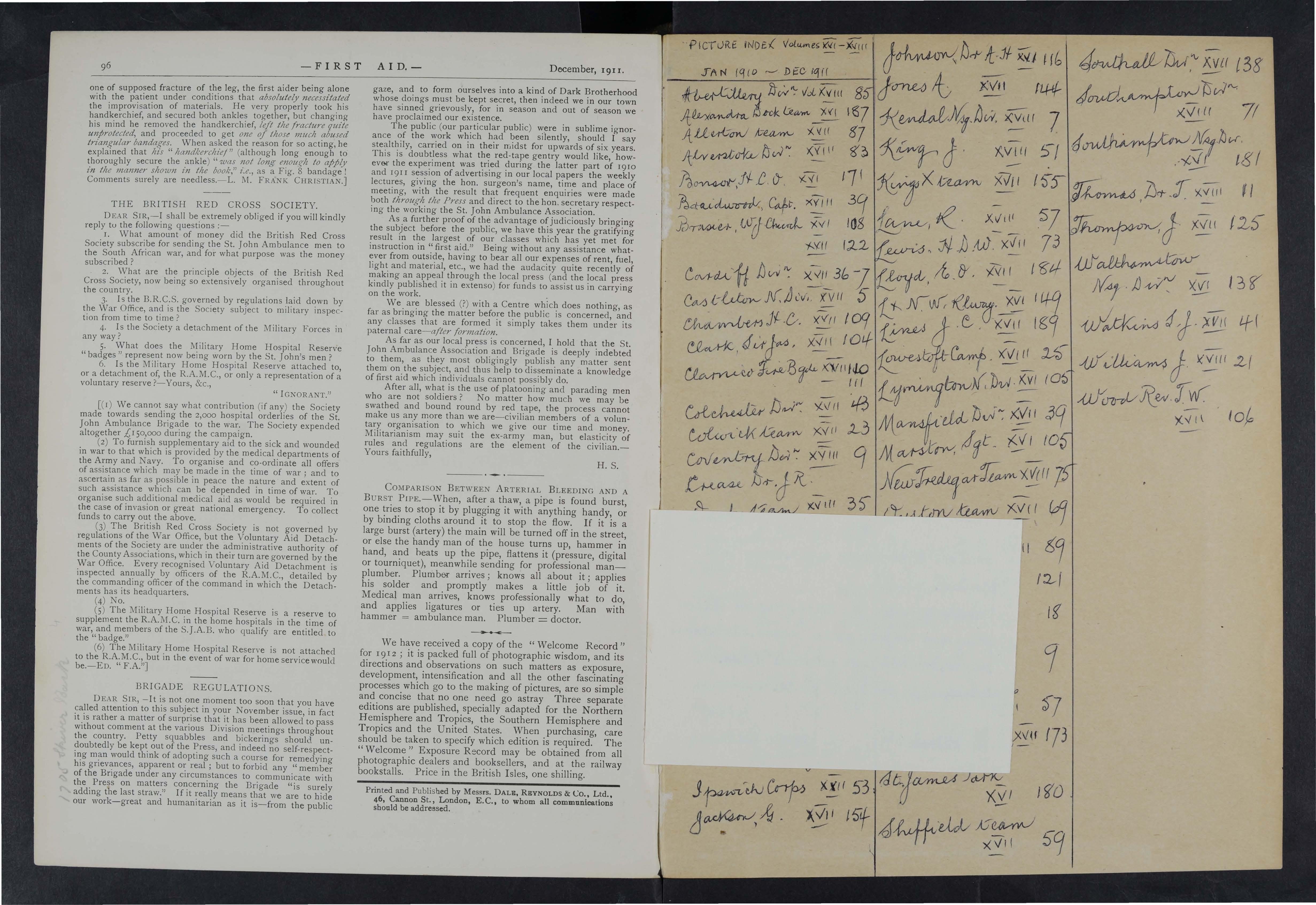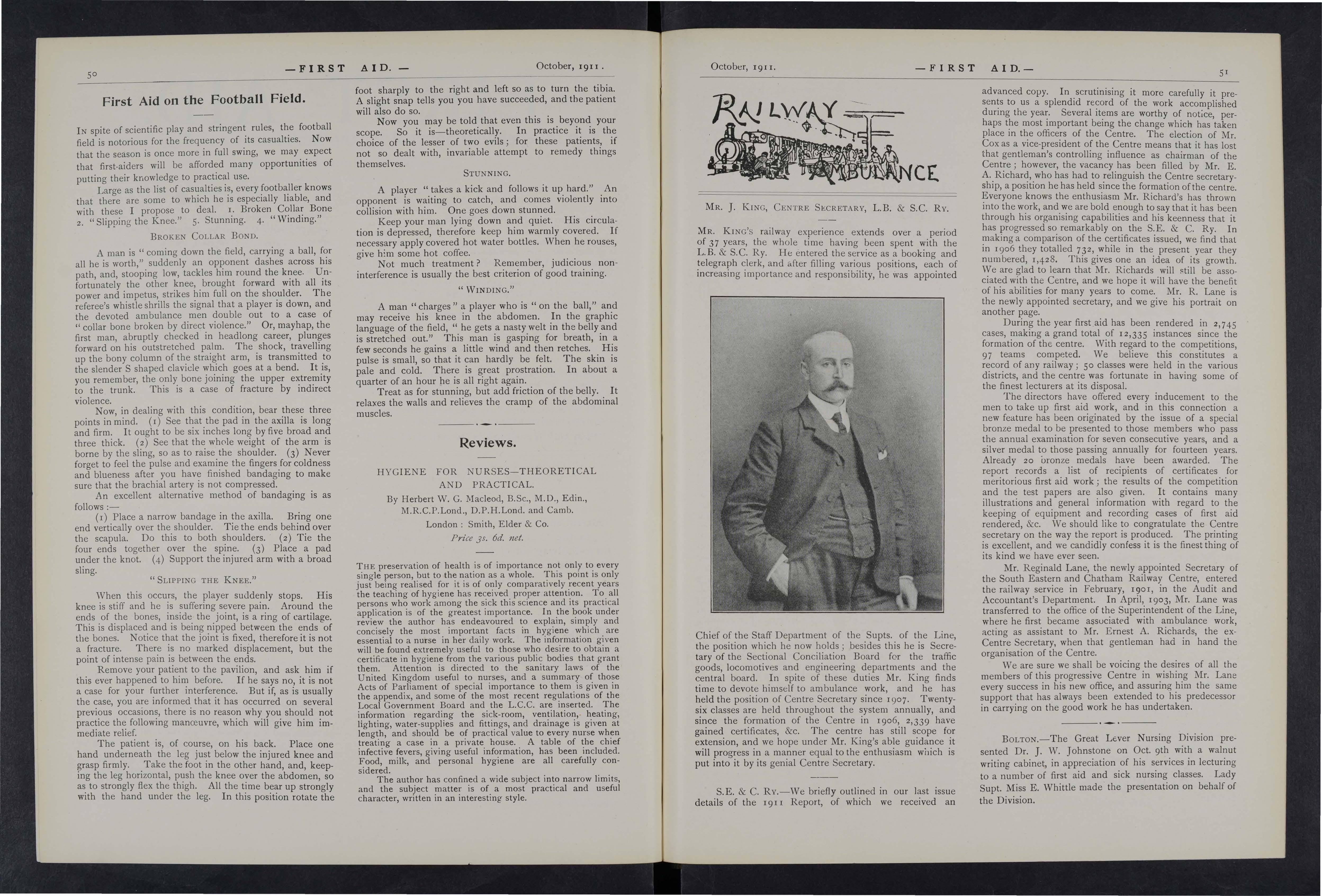 The public (our particular public) in sublime ignorance of the work which had been silently, should I say stealthily, carried on in their midst for upwards of six years. This is doubtless what the red-tape gentry would like, howev& the experiment was tried during the latter part of 19IO and I9I I session of advertising in our local papers the weekly lectures, giving the hon. surgeon's name, time and place of meeting, with the result that frequent enquiries were made both through the Press and direct to the hon. secretary respecting the working the St. John Ambulance Association.