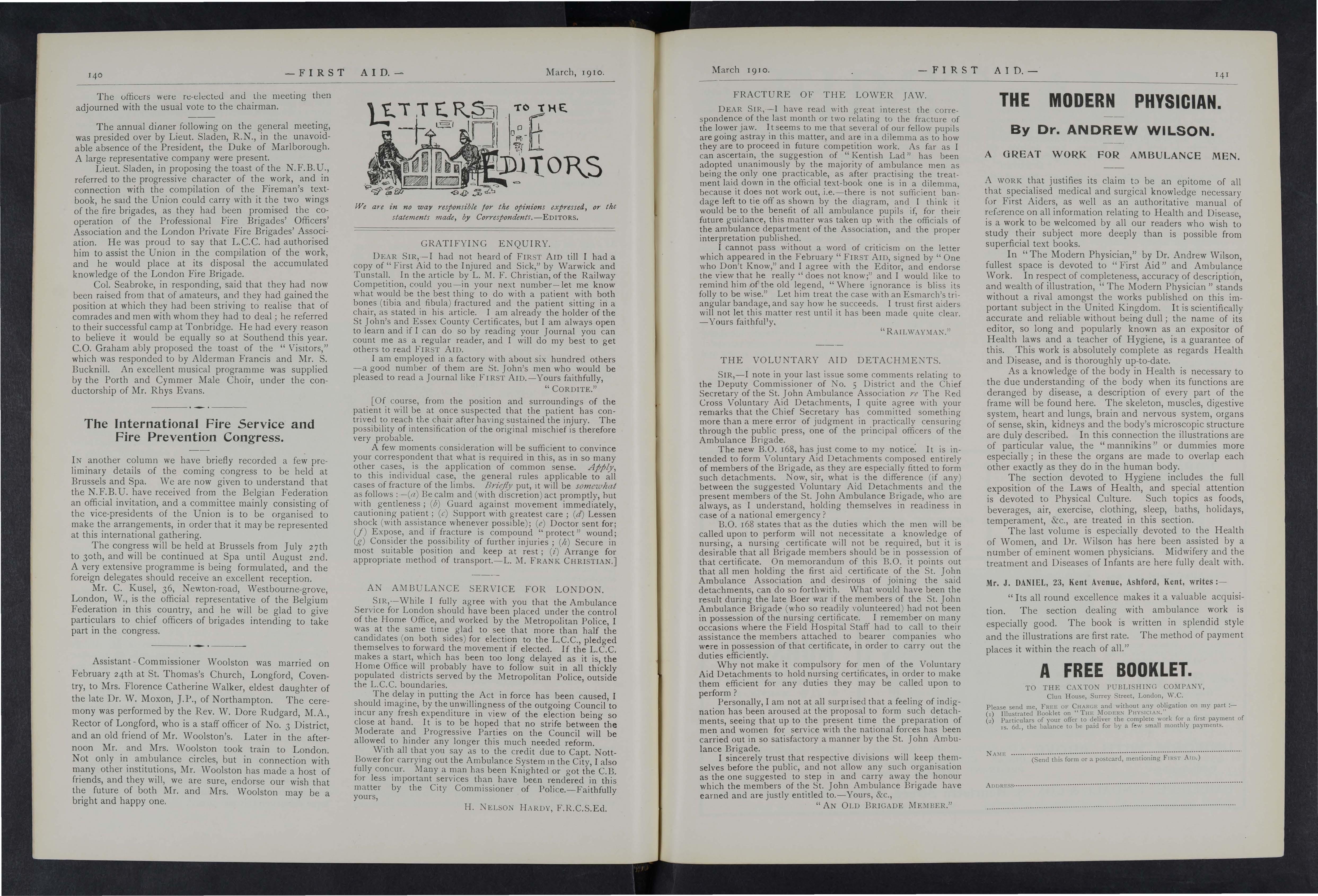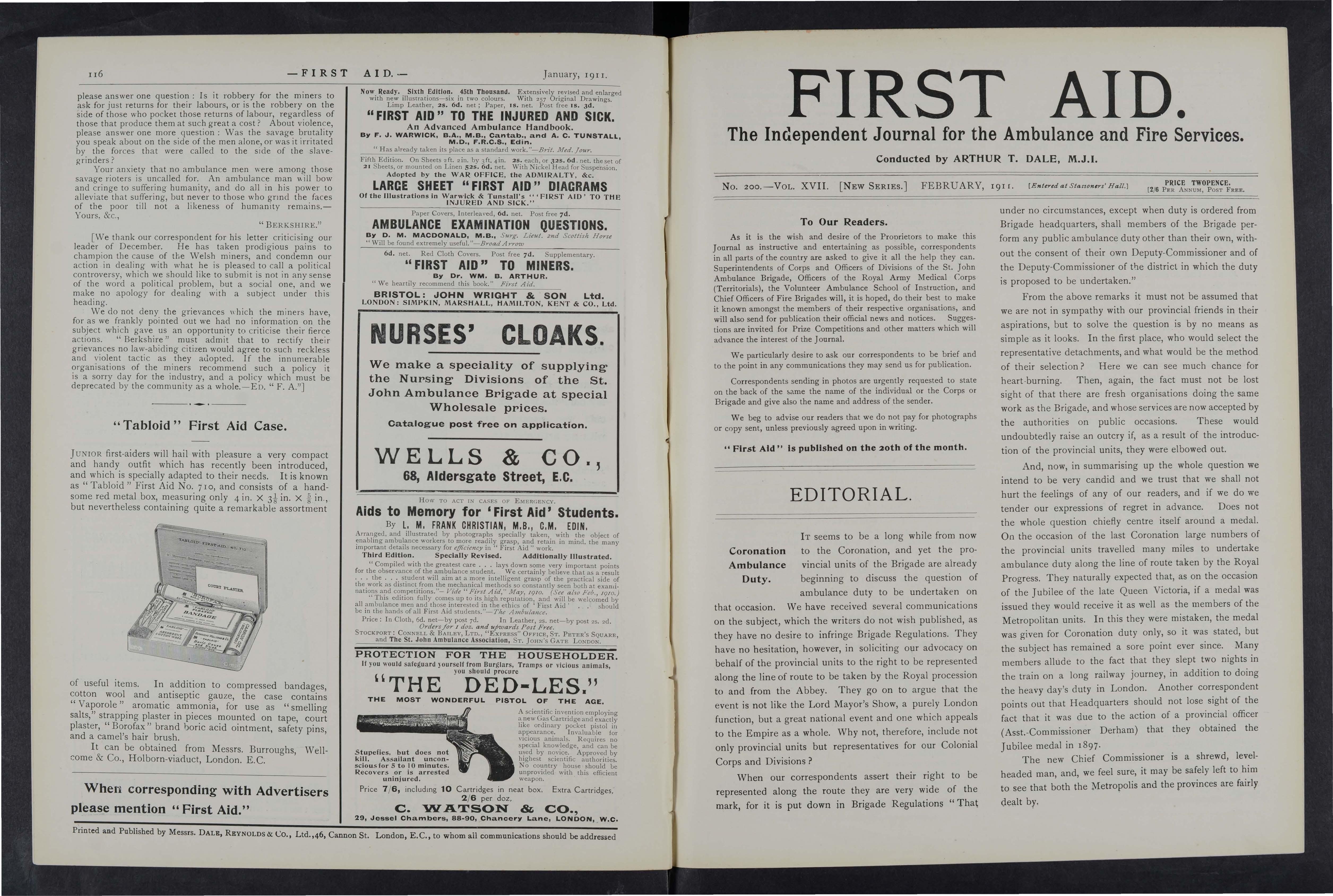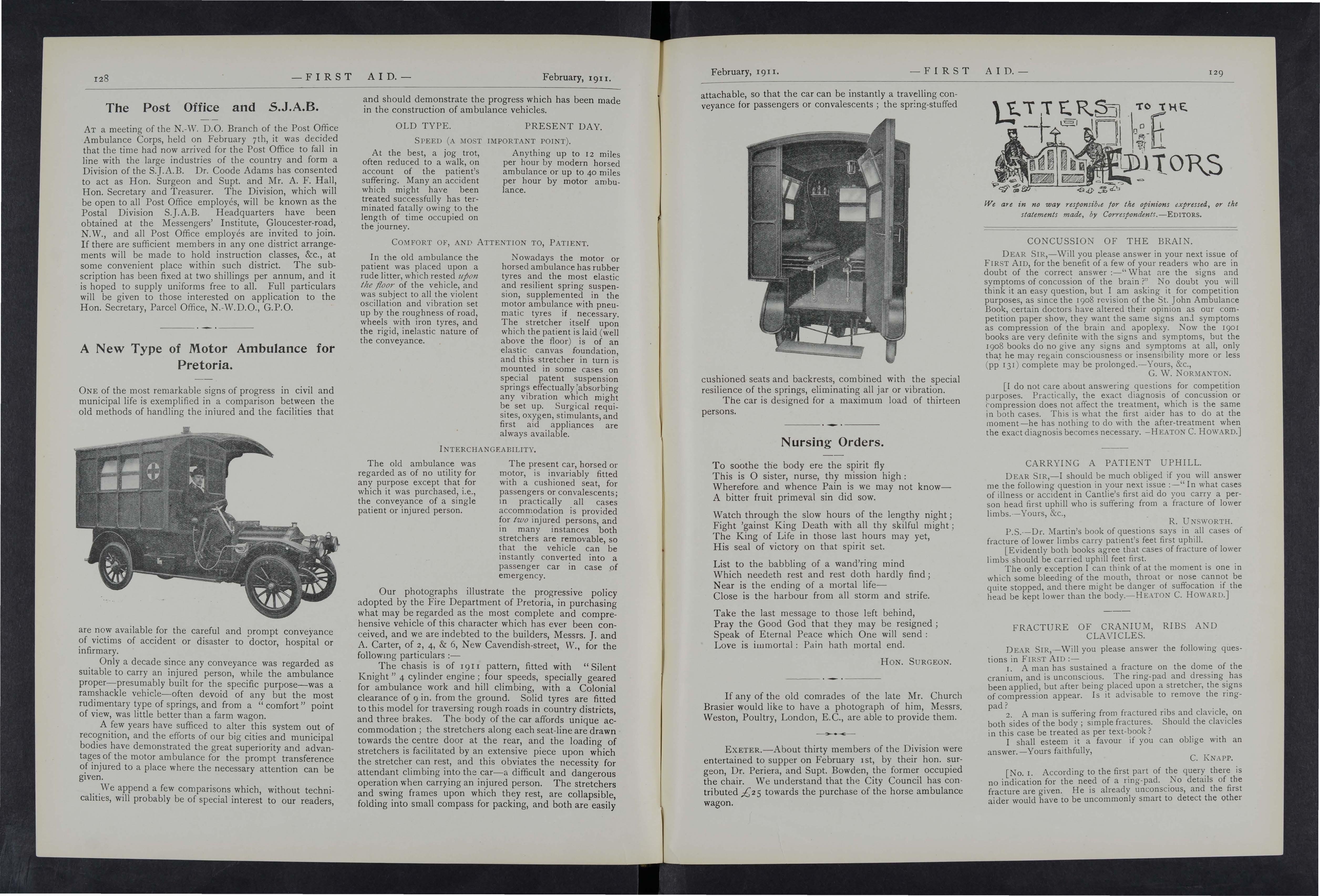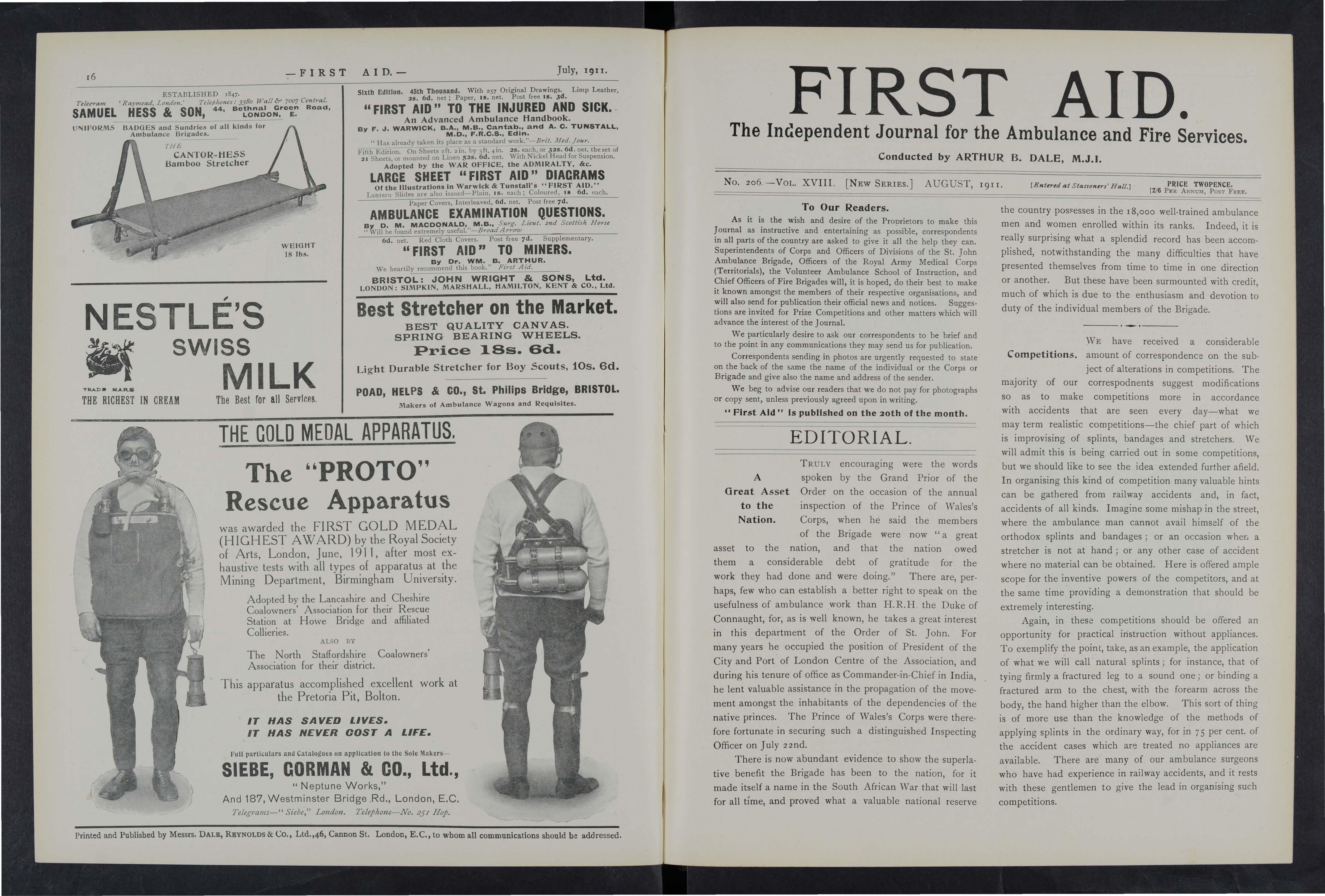 As it is the wish and desire of the Proprietors to make this Joumal as instructive and entertaining as possible, correspondents in all parts of the country are asked to give it all the help they can Superintendents of Corps and Officers of Divisions of the St. John Ambulance Brigade, Officers of the Royal Army Medical Corps (Territorials), the Volunteer Ambulance School of Instruction, and Chief Officers of Fire Brigades will, it is hoped, do their best to make it known amongst the members of their respective organisations, and will also send for publication their official news and notices. Suggestions are invited for Prize Competitions and other matters which will advance the interest of the] oumal.