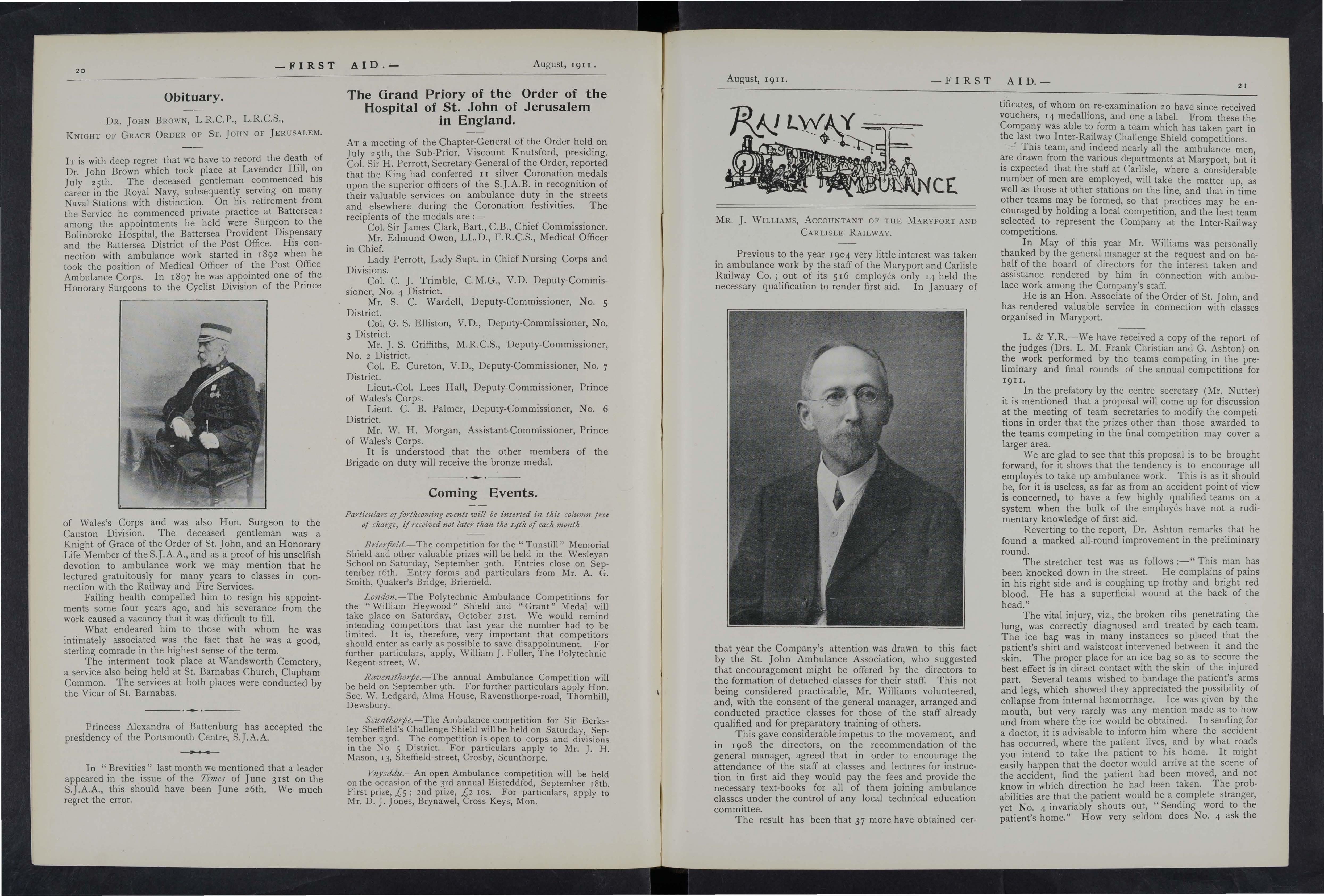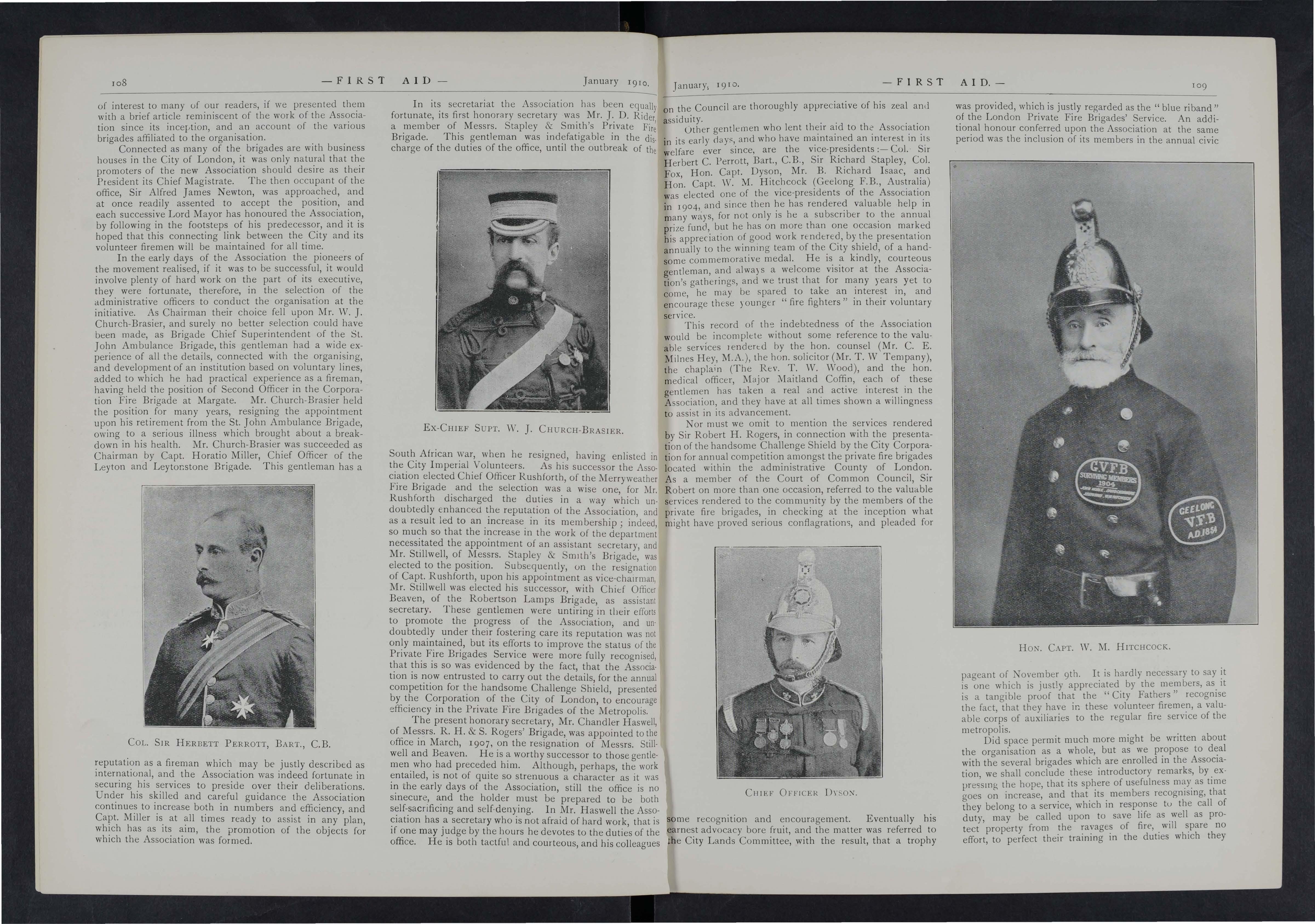 Death has removed from our midst several prominent men connected with the Ambulance Movement and the Fire Service, among whom may be mentioned Lord Amherst, of Hackney. His lordship was for some years Secretary General of the Order and during that period proved a warm friend to St. John Am bulance Brigade. Another equally staunch supporter has passed away in the person of General Sir Owen Tudor Burne. During the South African War,