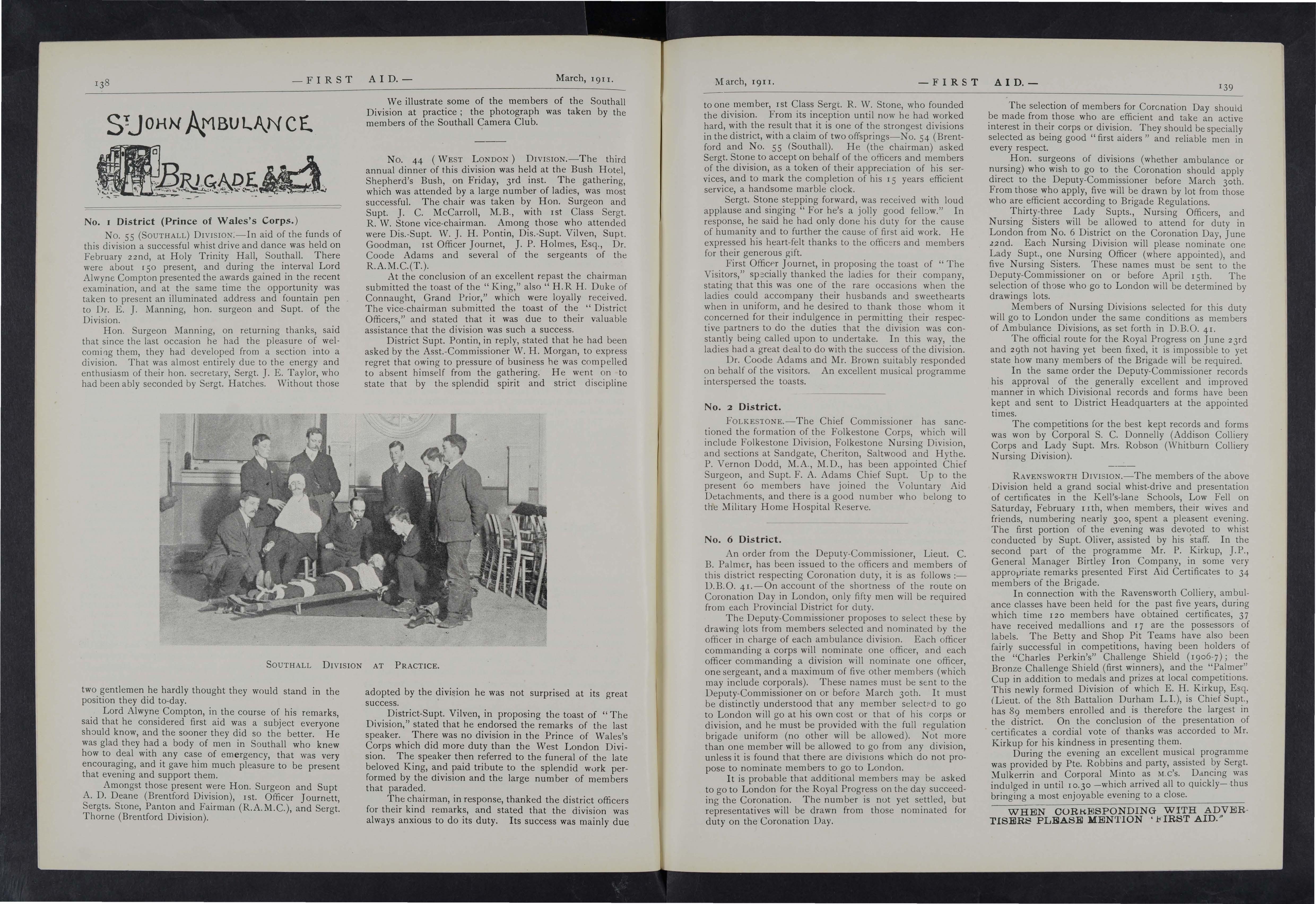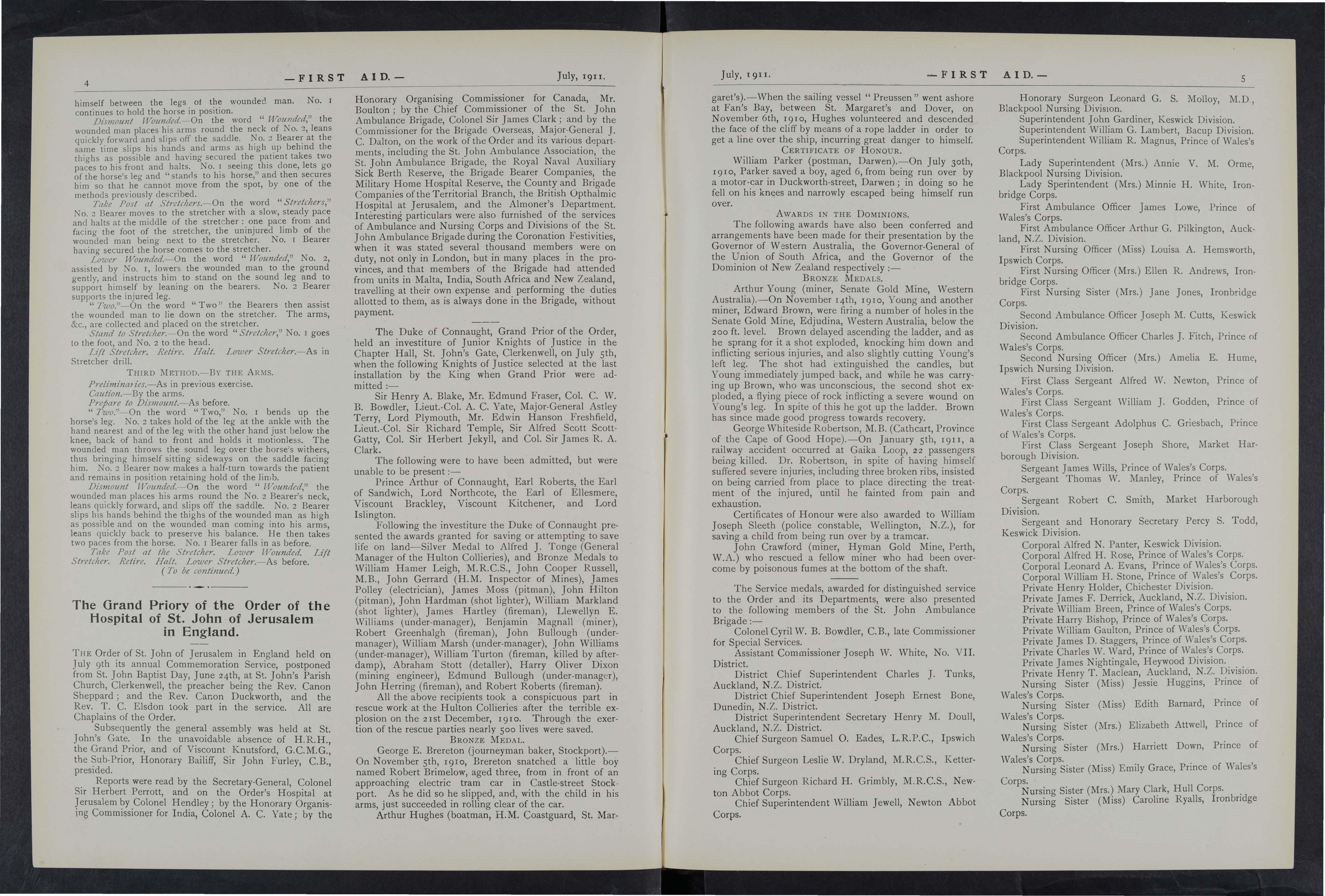 As a proof that the members of the Brigade are ready and willing to take their part in connection with the defence of the Empire, we have only to point to the patriotic response which they have made to the call for volunteers for the Military Home Hospitals Reserve and the Royal Naval Auxilliary Sick Berth Reserve. The efficiency of the several districts never stood so high, and the Deputy Commissioners report a continued increase in numbers. Public duty again has been undertaken on all occasions of large gatherings, and many complimentary references have been passed in high quarters on the splendid services rendered to the community. Perhaps the highest compliment which has ever been bestowed upon it is the permission which has graciously been accorded to the Metropolitan Corps by H.R.H. the Prince of Wales, that the Corps shall in future be known as "The Prince of Wales Corps," with the right to wear the Prince of Wales Feathers on the collar of the tunic. This is a distinction which will be much appreciated by not only the Metropolitan mem bers but by those in the Provinces as well, implying, as it does, Royal recognition of the work of the Brigade as a whole. Another recognition by Royalty which has given much satisfaction to ambulance workers in the Welsh District was the visit of H. R. H. Princess Louise, Duchess of Argyle, on the occasion of the annual competition for the" Sir Charles Warren Shield Il when Her Royal Highness graciously presented the trophy and prizes to the winning teams. Two prominent officers resigned during the year under review, ;viz., Colonel Gibbon, V.D., Deputy Commissioner, No. 6 District, and District Supt. of Stores Shute B. Piers, of the No. 1. District. In connection with the work in British Dominions beyond the Sea, it is gratifying to place on record the splendid progress and useful work the various Brigades are carrying on in the Colonies, especially so in Australia and New Zealand.