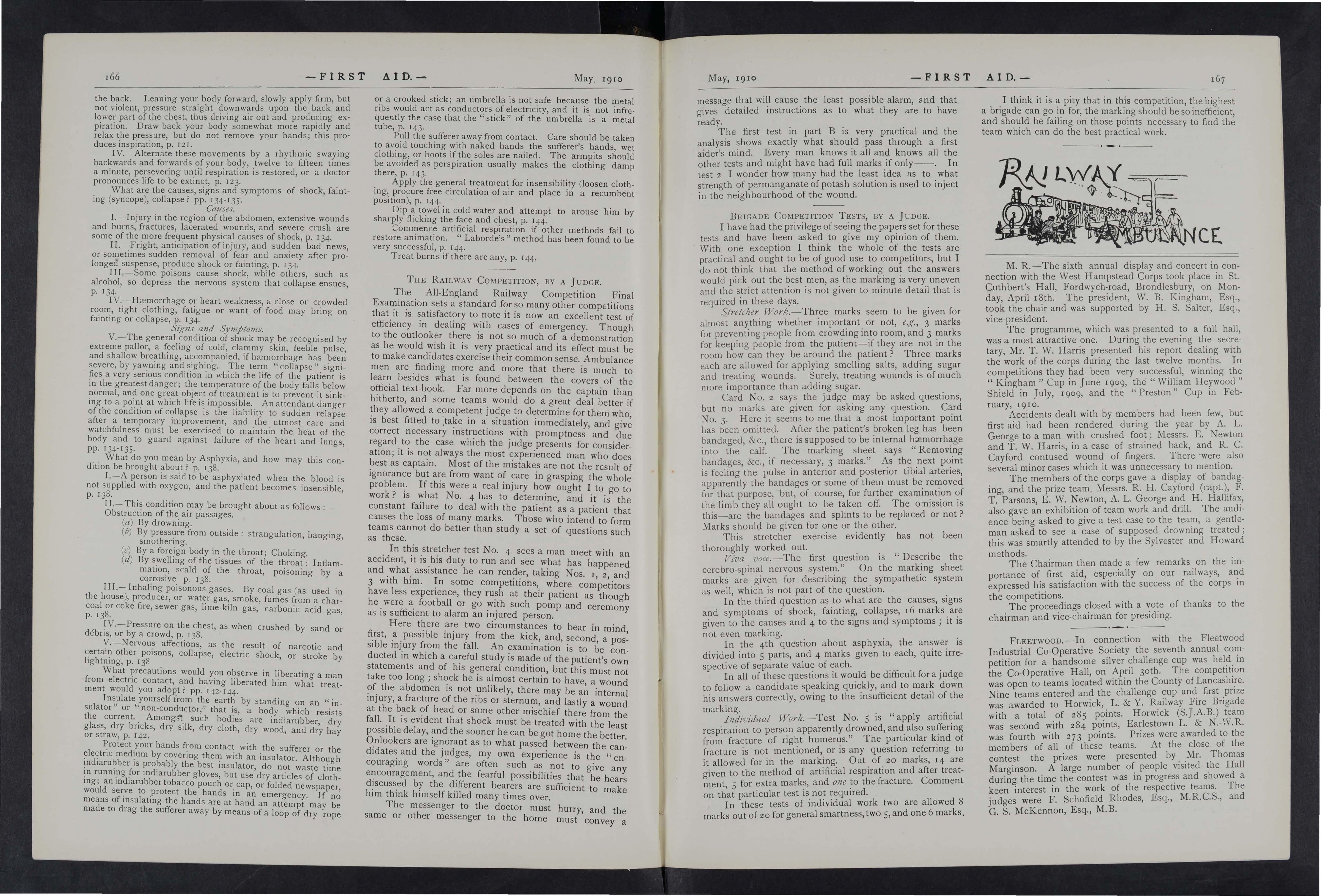 (b) WOUNDS AND HiEMORRHAGE. Patients may be wounded from splinters, or by being violently thrown against the sides, or on the floors of the carriages, and these wounds may be accompanied by severe hremorrhage.