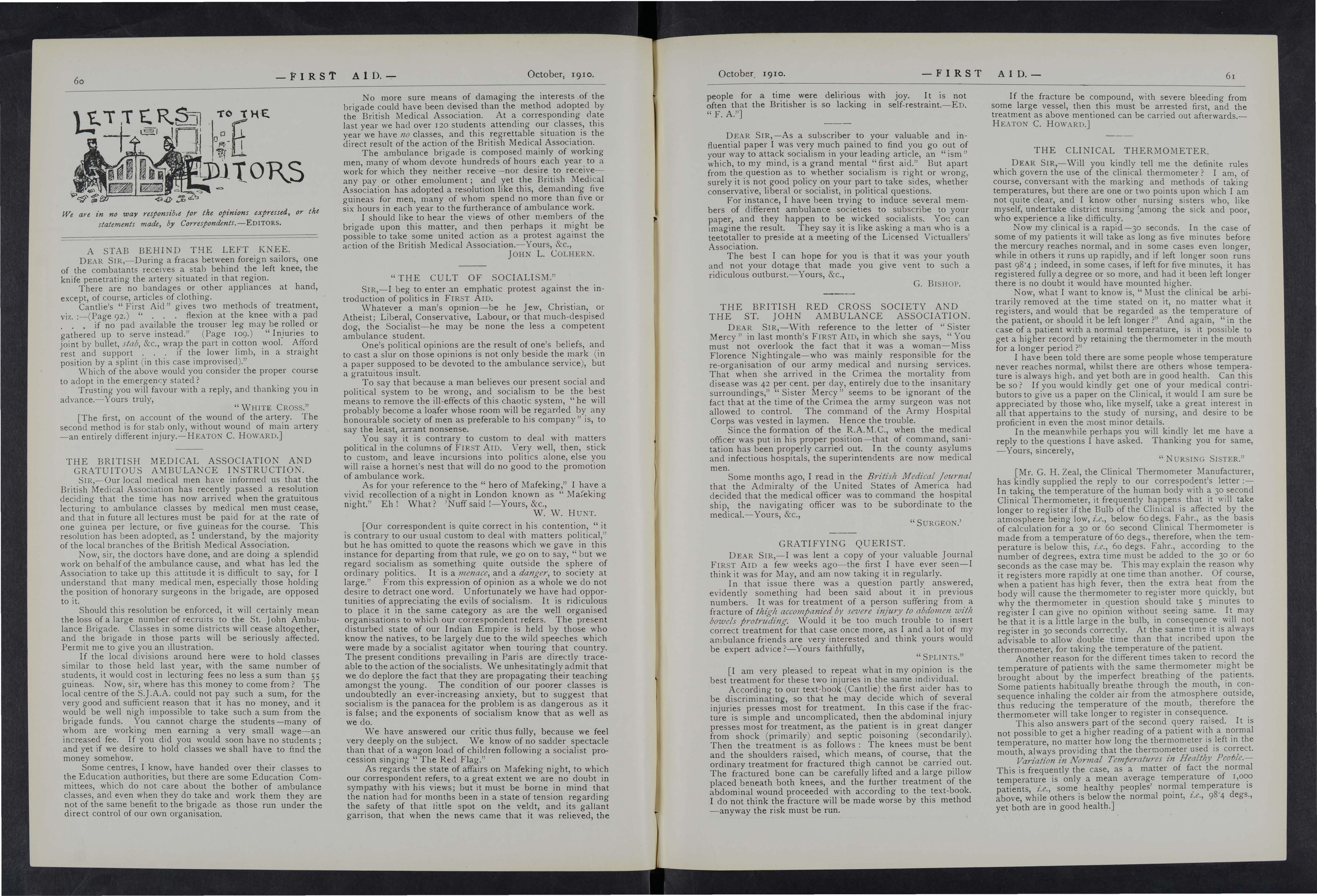 As far as our local press is concerned, I hold that the St. John Ambulance Association and Brigade is deeply indebted to them, as they most obligingly publish any matter sent them on the subject, and thus help to disseminate a knowledge of first aid which individuals cannot possibly do.