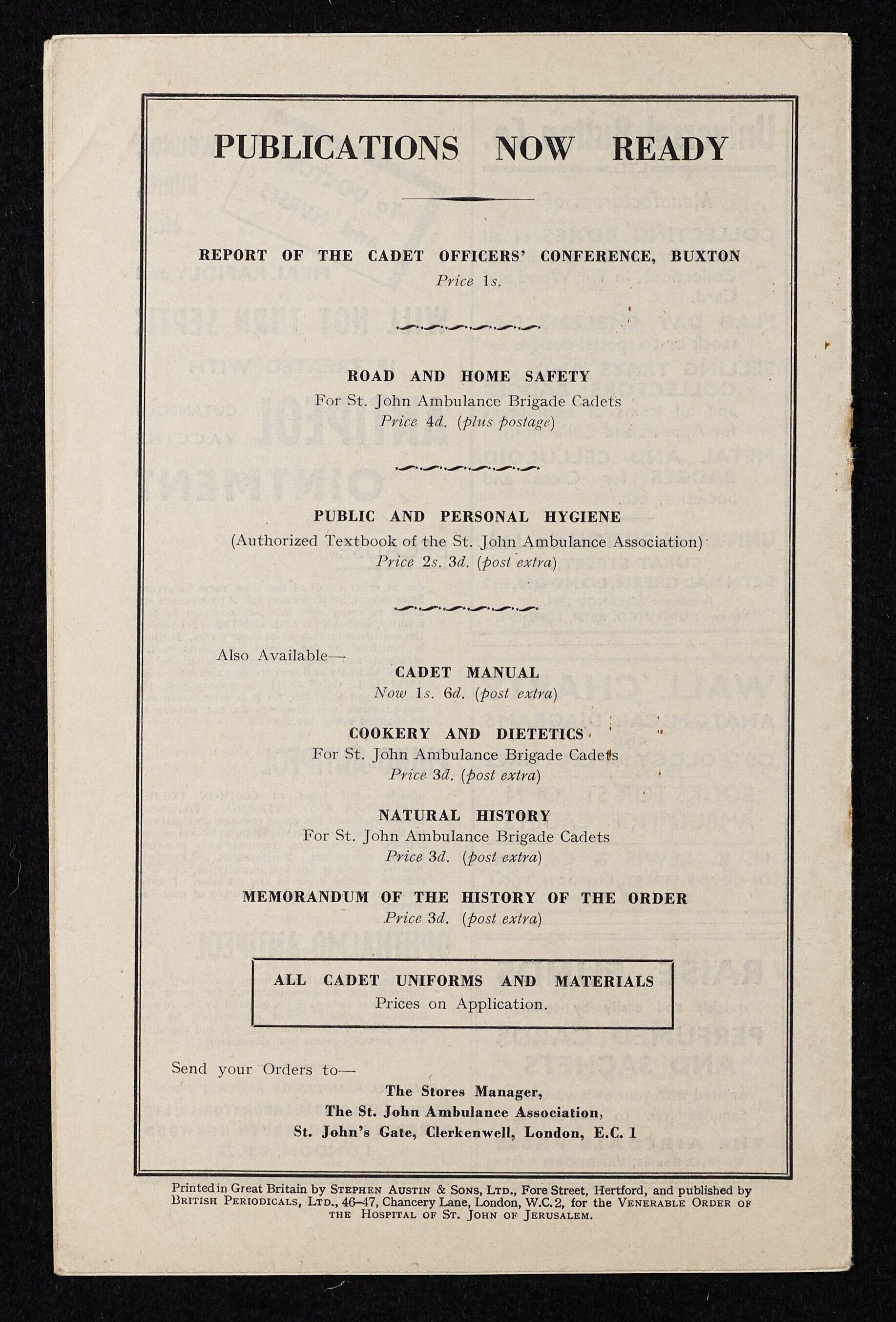 CHARTS ANATOMICAL DIAGRAMS AND OSTEOLOGY for LECTURES BOOKS FOR ST. JOHN AMBULANCE CADETS H. K. LEWIS & Co. Ltd. 136 GOWER STREET, LONDON, W.C.1! EUSton 4282 (5 lines) RAISE FUNDS quickly and easily by selling PERFUMED CARDS AND SACHETS printed with your own wording. secretaries. THE AIREDALE PRESS P.O. Box 60, BRADFORD Samples free to WOUNDS, BURNS, HEAL RAPIDLY and WILL NOT TURN SEPTIC IF TREATED WITH ANTIPEOL CUTANEOUS VACCINE OINTMENT
