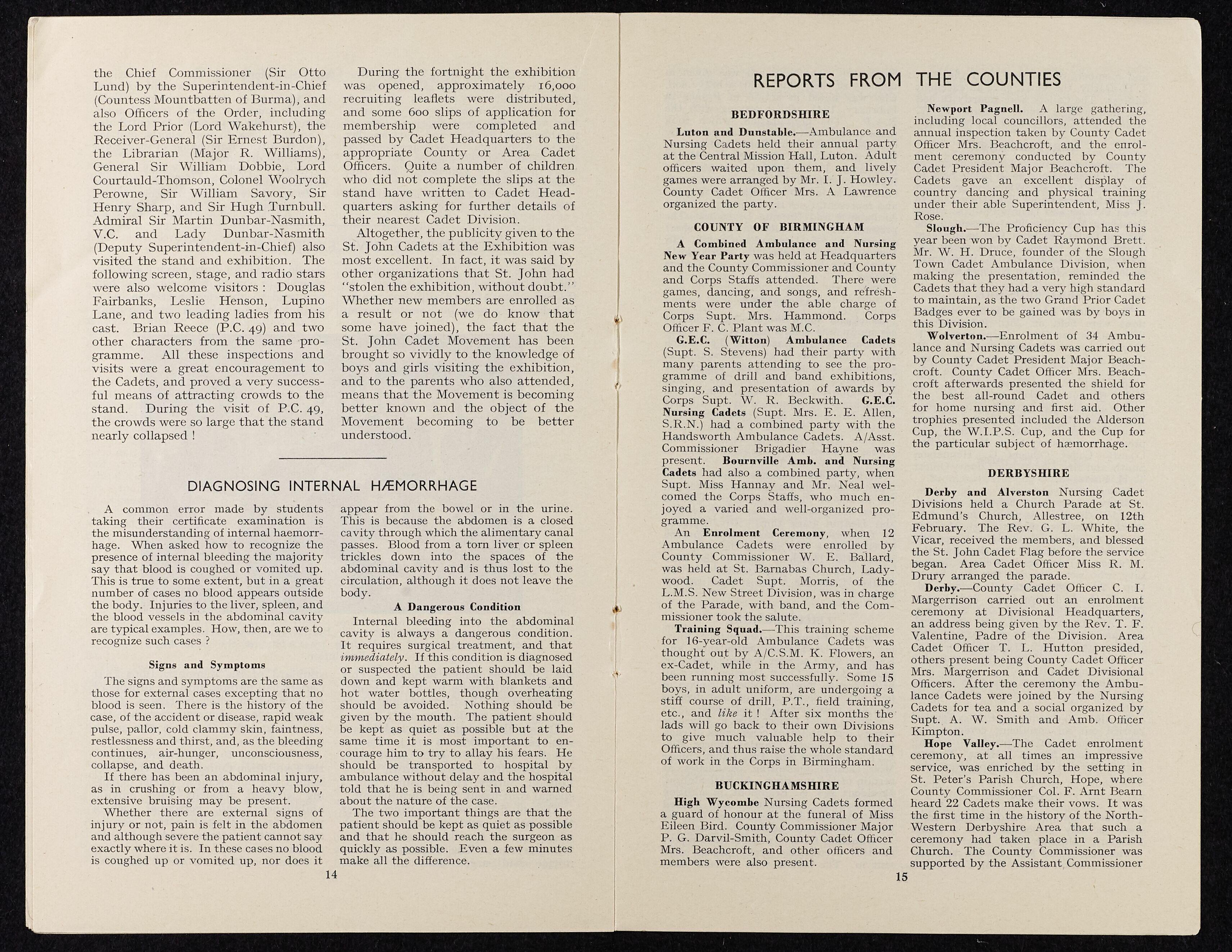 Mr. Moir made special mention of Derbyshire, which had had a Ambulance Cadet increase of 250 during the year ; Cheshire, which had run 8 training courses for Officers and N.C.O.s in Camp Craft, Leadership, etc. Plymouth, which had doubled its total numbers of Ambulance Cadets; Leicestershire, where 28 Ambulance Cadets had joined the Medical Services of the Armed Forces during the year; Birmingham, where an ex-Cadet