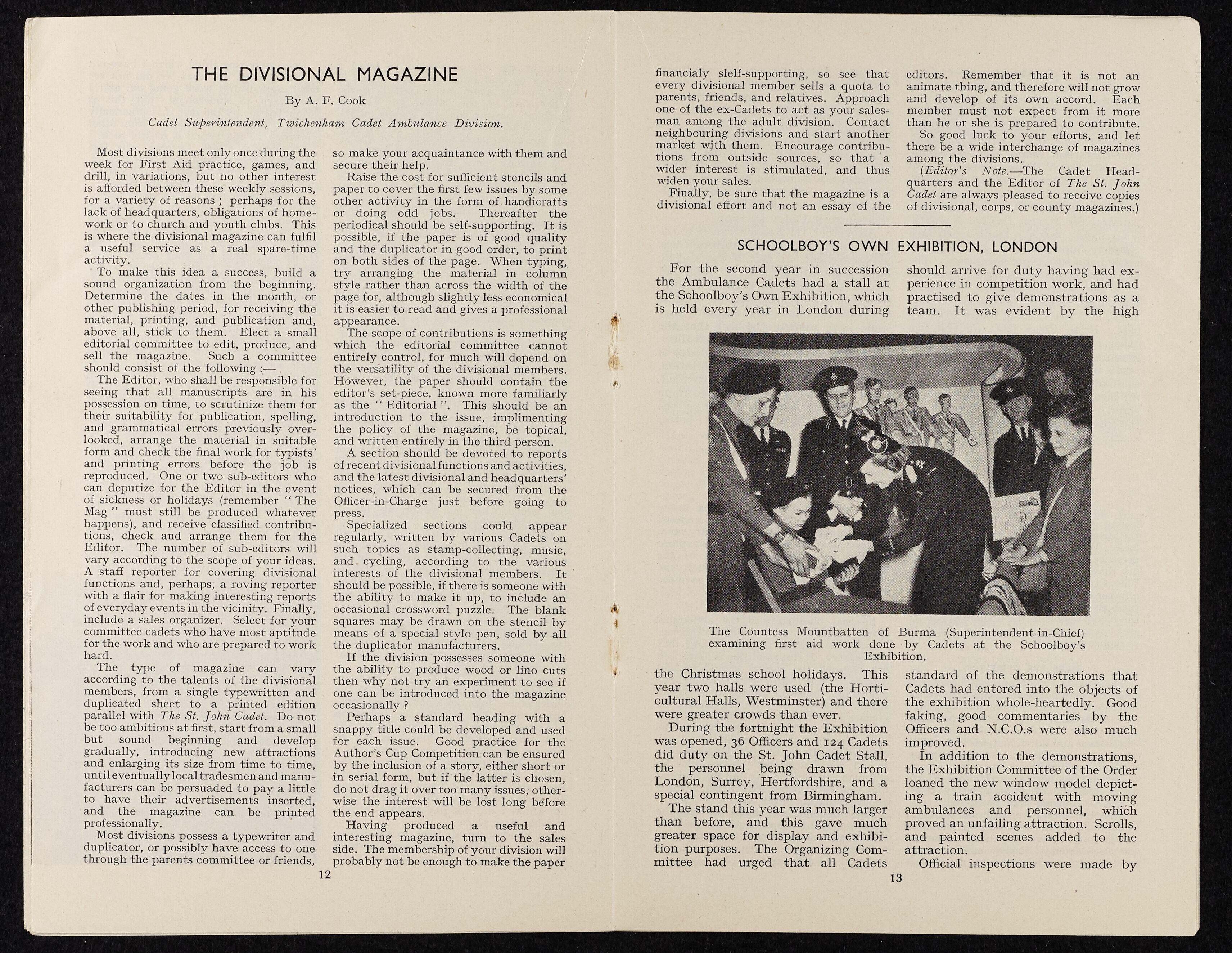 The Ambulance Cadet Department had once again organized a very successful Stall at the Schoolboys Own Exhibition in January, 1950. The Stall had been much larger than that of the previous year, and a great many recruiting leaflets and application slips had been distributed.