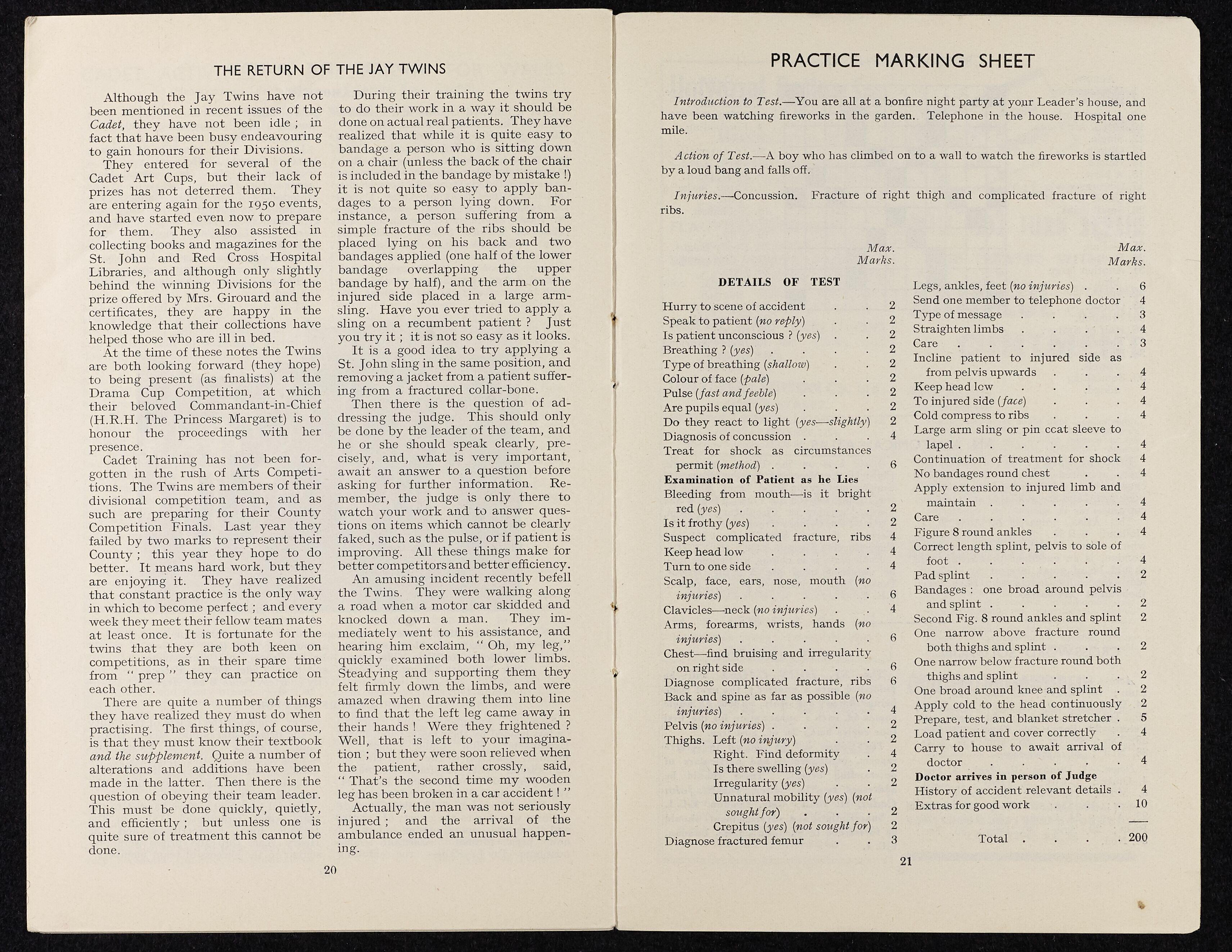 Cadet Training has not been forgotten in the rush of Arts Competitions. The Twins are members of their divisional competition team, and as such are preparing for their County Competition Finals. Last year they failed by two marks to represent their County; this year they hope to do better. It means hard work, but they are enjoying it. They have realized that constant practice is the only way in which to become perfect and every week they meet their fellow team mates at least once. It is fortunate for the twins that they are both keen on competitions, as in their spare time from prep they can practice on each other.