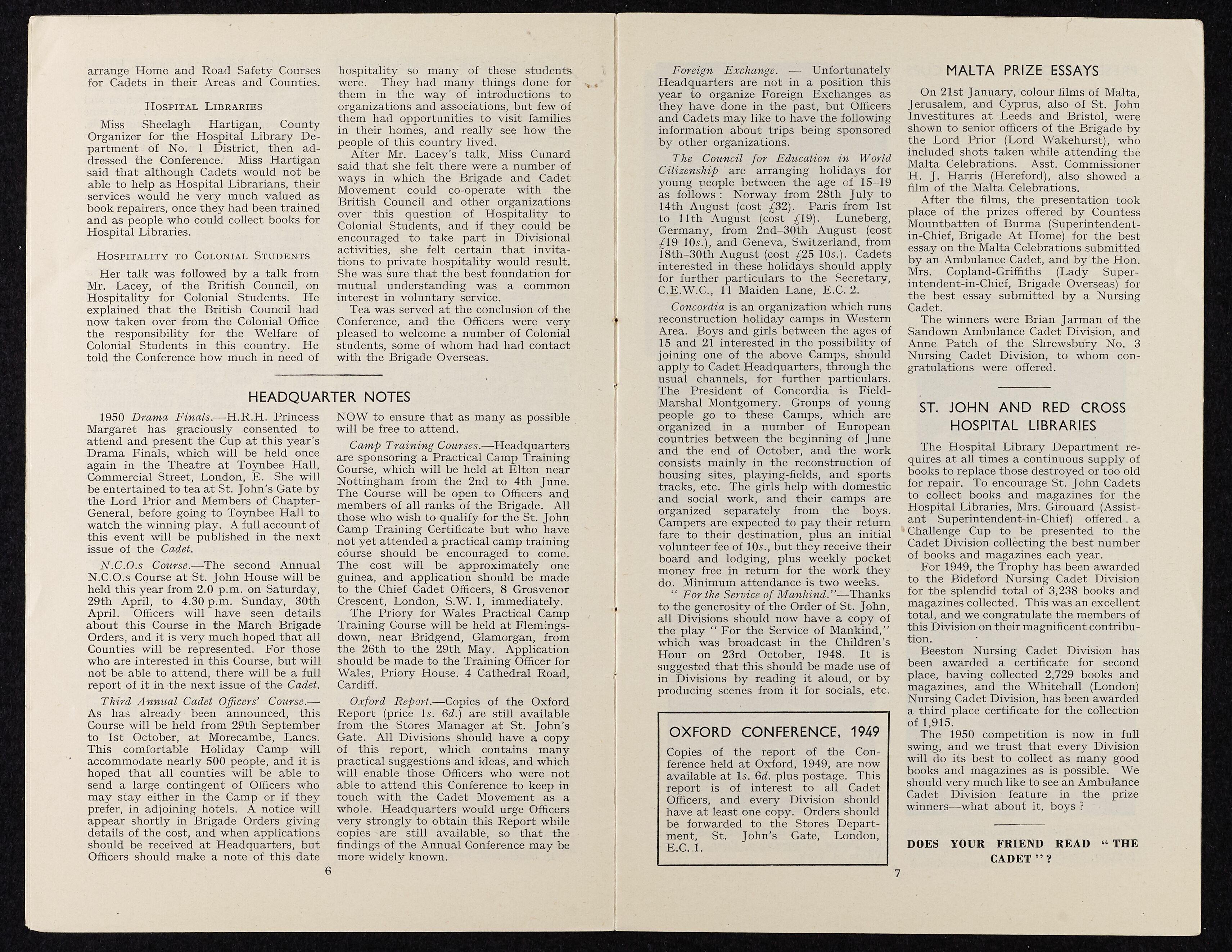 The number of Cadets who had taken up general nursing training had been very satisfactory, and out of these quite a high percentage had been awarded special prizes by Hospitals for their efficiency. Nursing Cadets had put in about 26,000 hours voluntary work in Hospitals, and about 6,000 in Nursing Homes, which she thought very creditable. 1949, said Miss Cunard, had been a very lucky year for Cadets, both individually and collectively. Grand Prior Cadet Margaret Knowler, of the Bexley Nursing Cadet Division of No. District had visited Southern Rhodesia on the Princess Elizabeth Birthday Fund Exchange scheme; Cadet Patricia Slawson, of the East Brierley Nursing Cadet Division, W.R. Yorks, had won the second prize in the UNESCO Essay Competition, Together we build a new World, for which there had been 45,000 entries the American Trophy for Gallantry had been won by Cadet Betty Ives, of the Andover Nursing Cadet Division. The Malta celebrations, of course, had been the highlight of the year, and 75 Cadets had been able to attend. Total recorded numbers of Cadets who attended Camp during 1949 had been just over 2,000. Miss Cunard