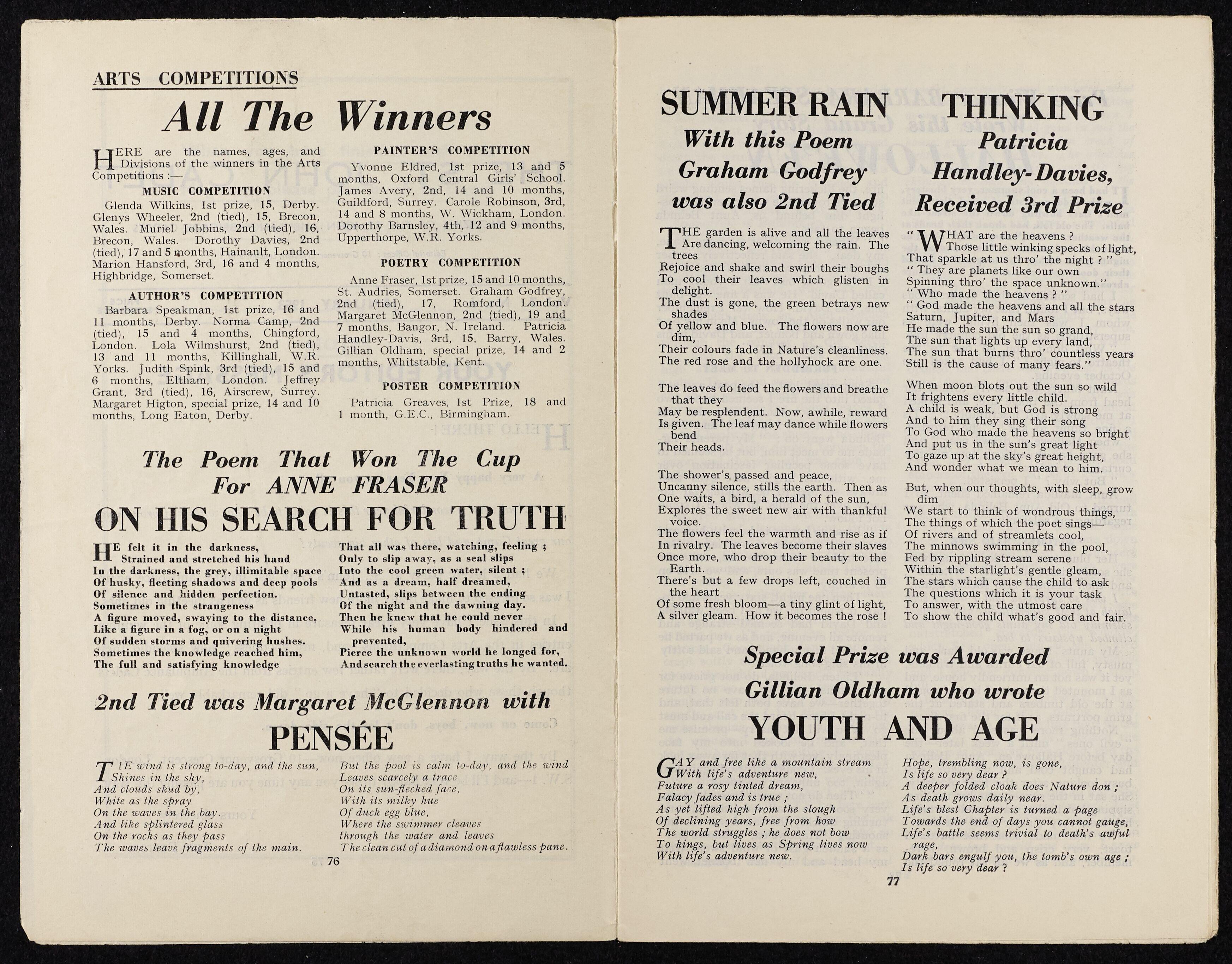 Barbara Speakman, Ist prize, 16 and 11 months, Derby. Norma Camp, 2nd (tied), 15 and 4 months, Chingford, London. Lola Wilmshurst, 2nd (tied), 13 and 11 months, Killinghall, W.R. Yorks. Judith Spink, 3rd (tied), 15 and 6 months, Eltham, London. Jeffrey Grant, 3rd (tied), 16, Airscrew, Surrey. Margaret Higton, special prize, 14 and 10 months, Long Eaton, Derby.