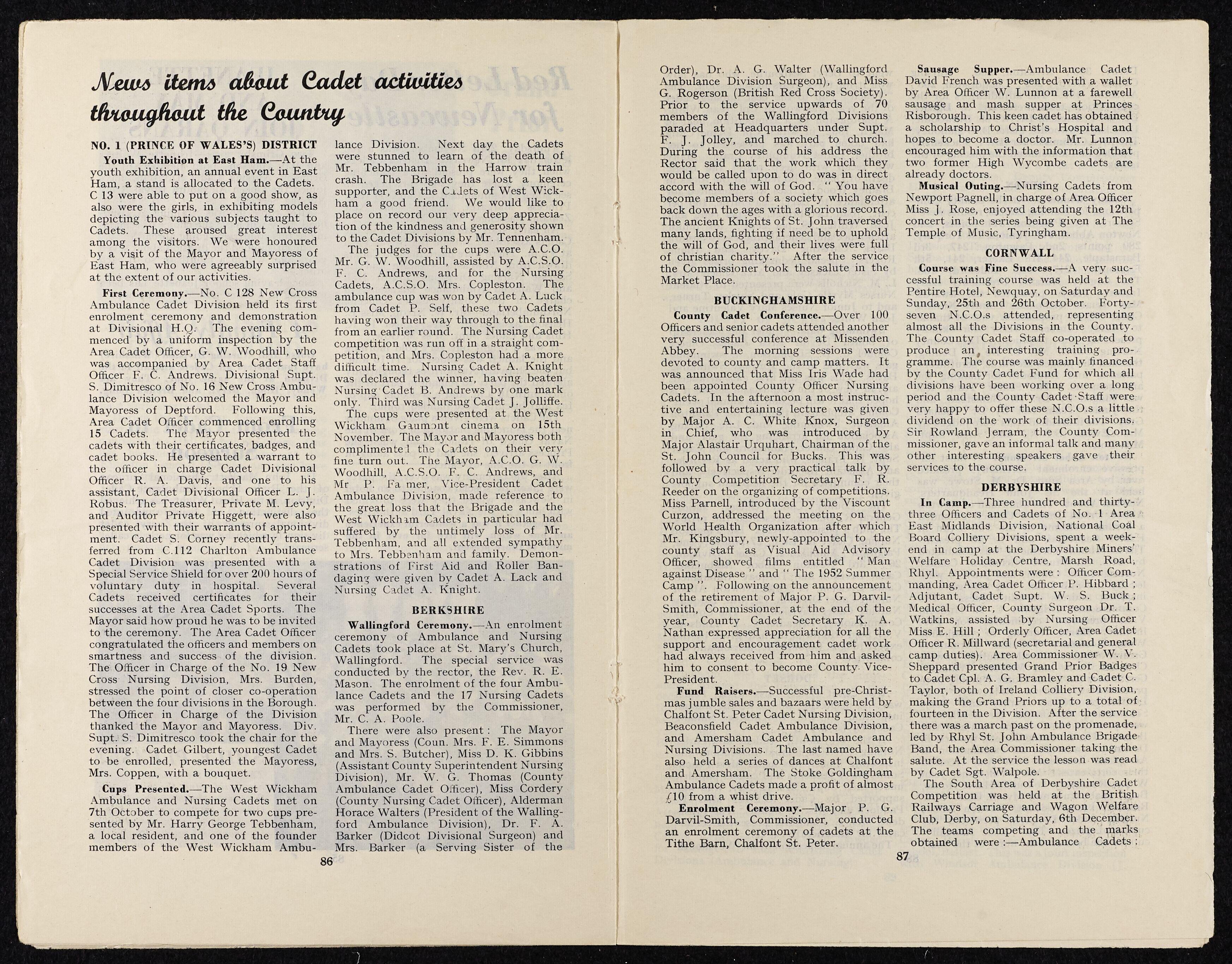 Harwich Enrolment. An enrolment ceremony was held at Harwich, when there were present the Mayor and Mayoress of Harwich and the Deputy Mayor, and Div. Supt. Bowden. The County Cadet Officer, Lt.-Col. A. I. Sheringham, who conducted the enrolment, stressed the importance of the occasion, saying they were about to enrol the lads before them in an honourable association which dated back hundreds of years, and had members all over the British Commonwealth and Empire. The vows and promises they were about to make would, if they lived up to them, make them useful citizens. He thanked the Mayor and Deputy Mayor and Mr. Bowden for their presence and support. After the ceremony a social evening was held by both Ambulance and Nursing Cadets. Great credit is due to Mr. Bowden for raising two such flourishing Cadet Divisions (Ambulance and Nursing).