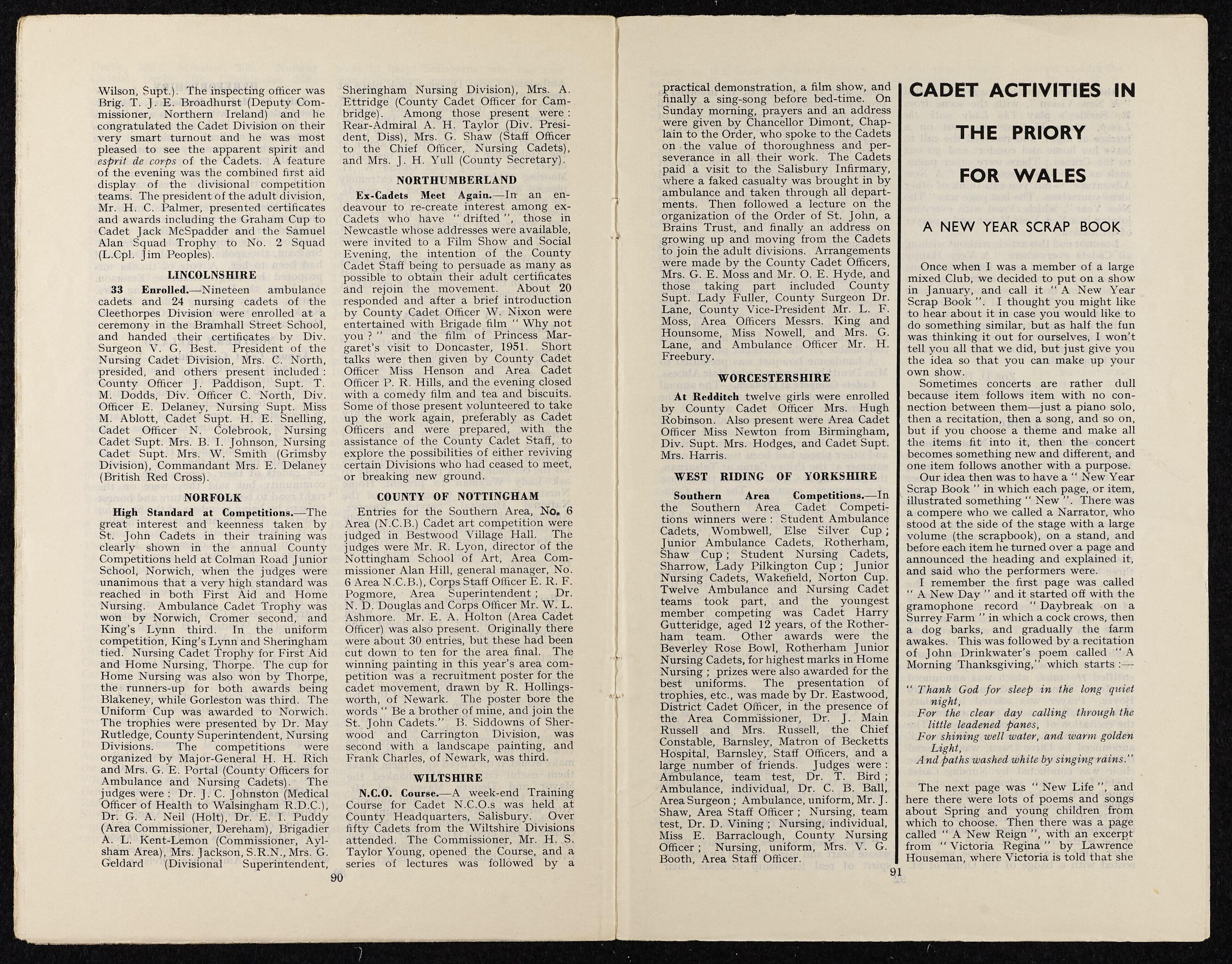 High Standard at Competitions. The great interest and keenness taken by St. John Cadets in their training was clearly shown in the annual County Competitions held at Colman Road Junior School, Norwich, when the judges were unanimous that a very high standard was reached in both First Aid and Home Nursing. Ambulance Cadet Trophy was won by Norwich, Cromer second, and King s Lynn third. In the uniform competition, King s Lynn and Sheringham tied. Nursing Cadet Trophy for First Aid and Home Nursing, Thorpe. The cup for Home Nursing was also won by Thorpe, the. runners-up for both awards being Blakeney, while Gorleston was third. The Uniform Cup was awarded to Norwich. The trophies were presented by Dr. May Rutledge, County Superintendent, Nursing Divisions. The competitions were organized by Major-General H. H. Rich and Mrs. G. E. Portal (County Officers for Ambulance and Nursing Cadets). The judges were: Dr. J. C. Johnston (Medical Officer of Health to Walsingham R.D.C.), Dr. G. A. Neil (Holt), Dr. E. I. Puddy (Area Commissioner, Dereham), Brigadier A. L. Kent-Lemon (Commissioner, Aylsham Area), Mrs. Jackson, S.R.N., Mrs. G. Geldard (Divisional Superintendent,