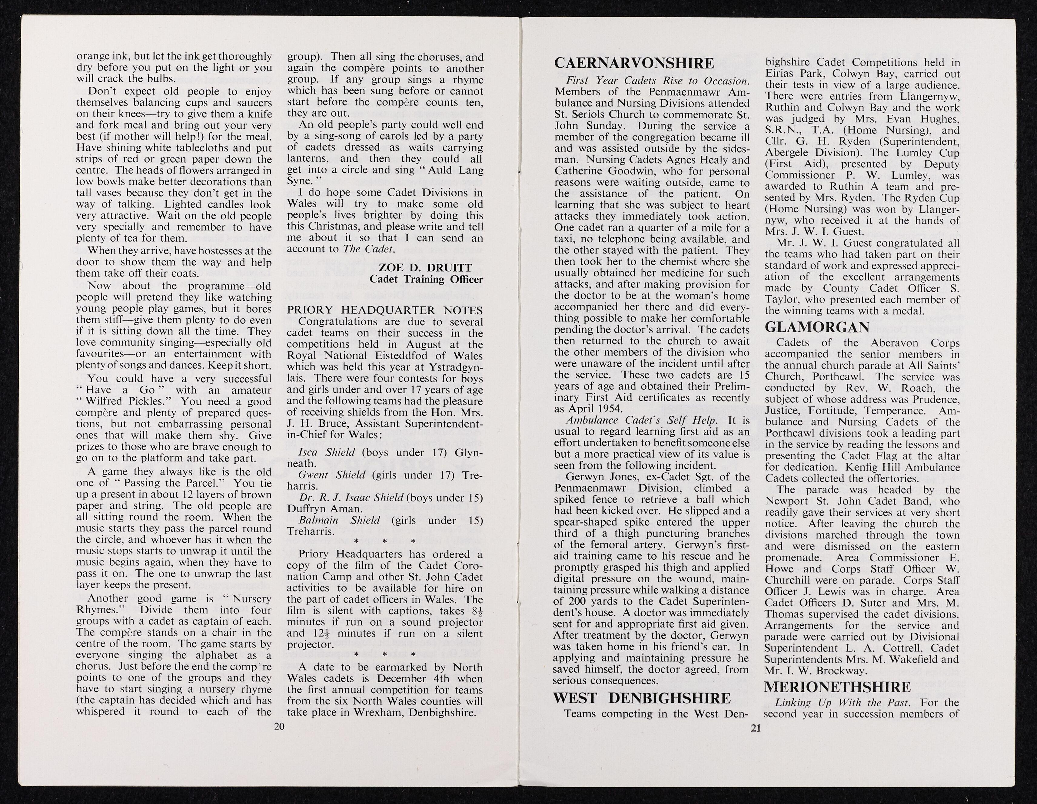 ZOE D. DRUITT Cadet Training OfficerCongratulations are due to several cadet teams on their success in the competitions held in August at the Royal National Eisteddfod of Wales which was held this year at Ystradgynlais. There were four contests for boys and girls under and over 17 years of age and the following teams had the pleasure of receiving shields from the Hon. Mrs. J. H. Bruce, Assistant Superintendentin-Chief for Wales: