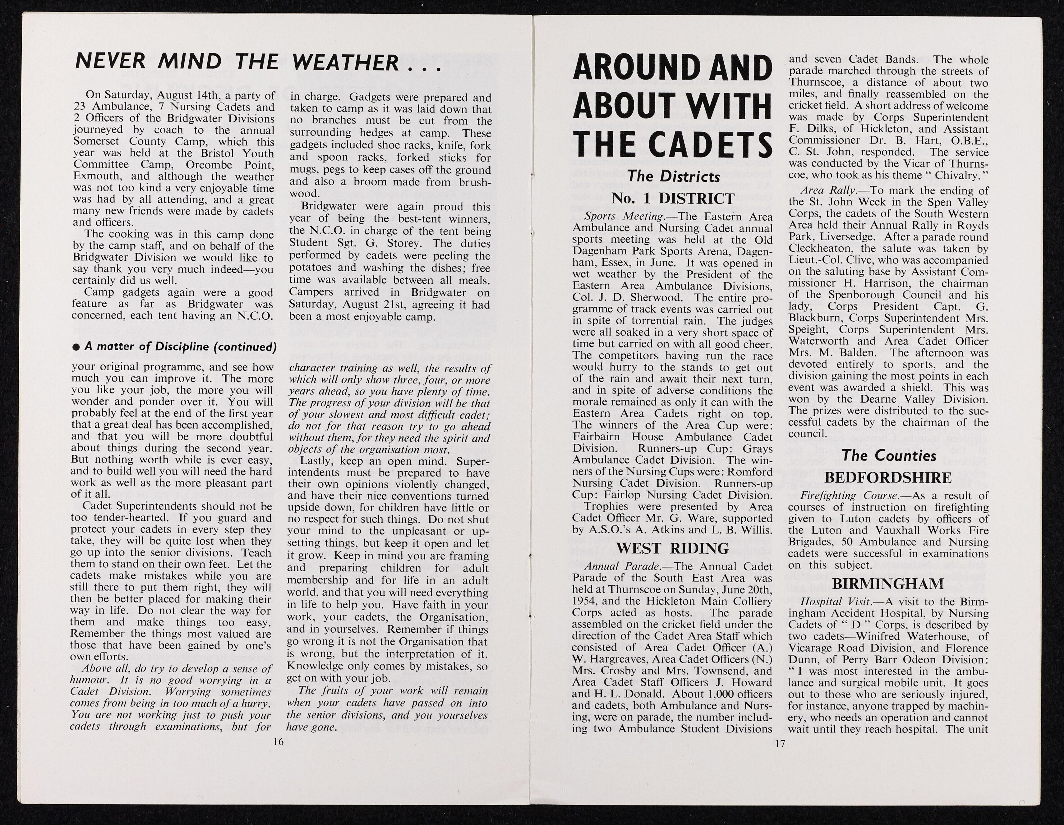 Sports Meeting The Eastern Area Ambulance and Nursing Cadet annual sports meeting was held at the Old Dagenham Park Sports Arena, Dagenham, Essex, in June. It was opened in wet weather by the President of the Eastern Area Ambulance Divisions, Col. J. D. Sherwood. The entire programme of track events was carried out in spite of torrential rain. The judges were all soaked in a very short space of time but carried on with all good cheer. The competitors having run the race would hurry to the stands to get out of the rain and await their next turn, and in spite of adverse conditions the morale remained as only it can with the Eastern Area Cadets right on top. The winners of the Area Cup were: Fairbairn House Ambulance Cadet Division. Runners-up Cup: Grays Ambulance Cadet Division. The winners of the Nursing Cups were: Romford Nursing Cadet Division. Runners-up Cup: Fairlop Nursing Cadet Division. Trophies were presented by Area Cadet Officer Mr. G. Ware, supported by A.S.O. s A. Atkins and L. B. Willis.