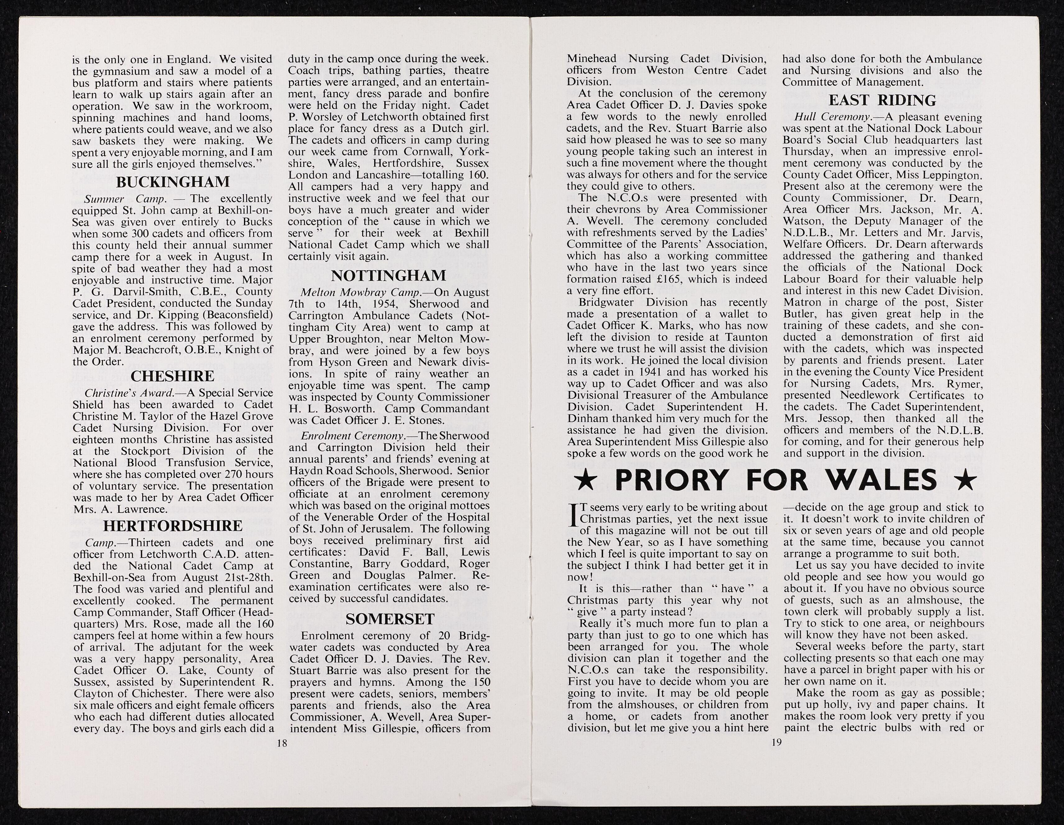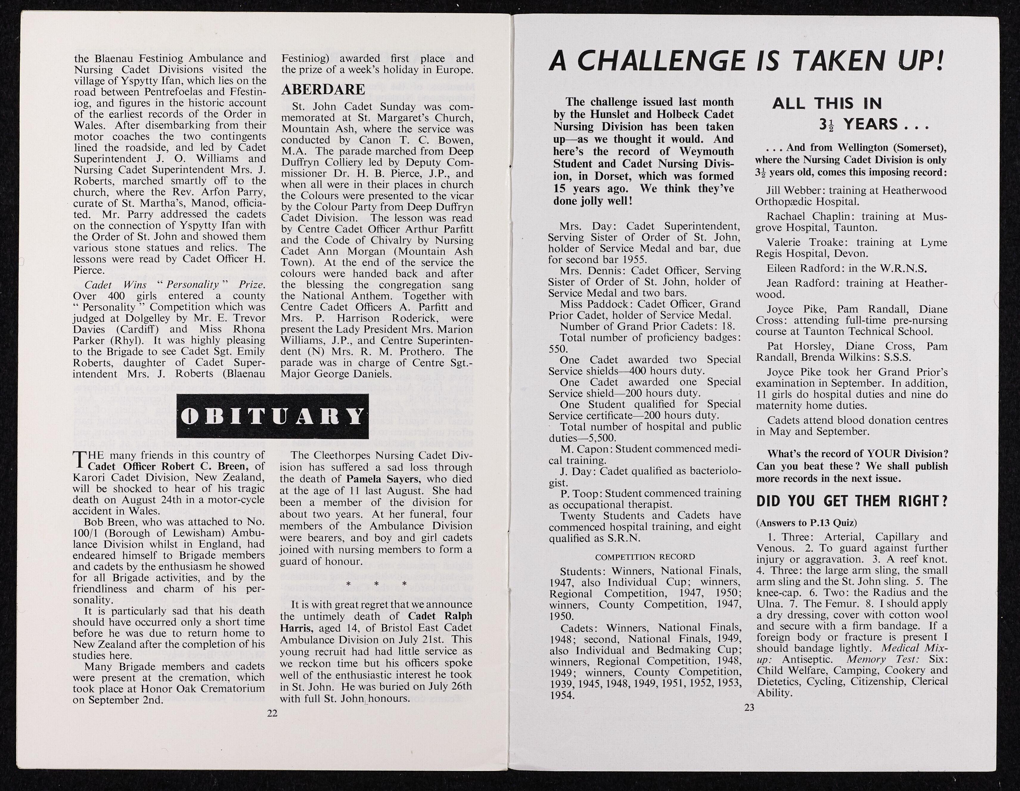 First Year Cadets Rise to Occasion. Members of the Penmaenmawr Ambulance and Nursing Divisions attended St. Seriols Church to commemorate St. John Sunday. During the service a member of the congregation became ill and was assisted outside by the sidesman. Nursing Cadets Agnes Healy and Catherine Goodwin, who for personal reasons were waiting outside, came to the assistance of the patient. On learning that she was subject to heart attacks they immediately took action. One cadet ran a quarter of a mile for a taxi, no telephone being available, and the other stayed with the patient. They then took her to the chemist where she usually obtained her medicine for such attacks, and after making provision for the doctor to be at the woman s home accompanied her there and did everything possible to make her comfortable pending the doctor s arrival. The cadets then returned to the church to await the other members of the division who were unaware of the incident until after the service. These two cadets are 15 years of age and obtained their Preliminary First Aid certificates as recently as April 1954.