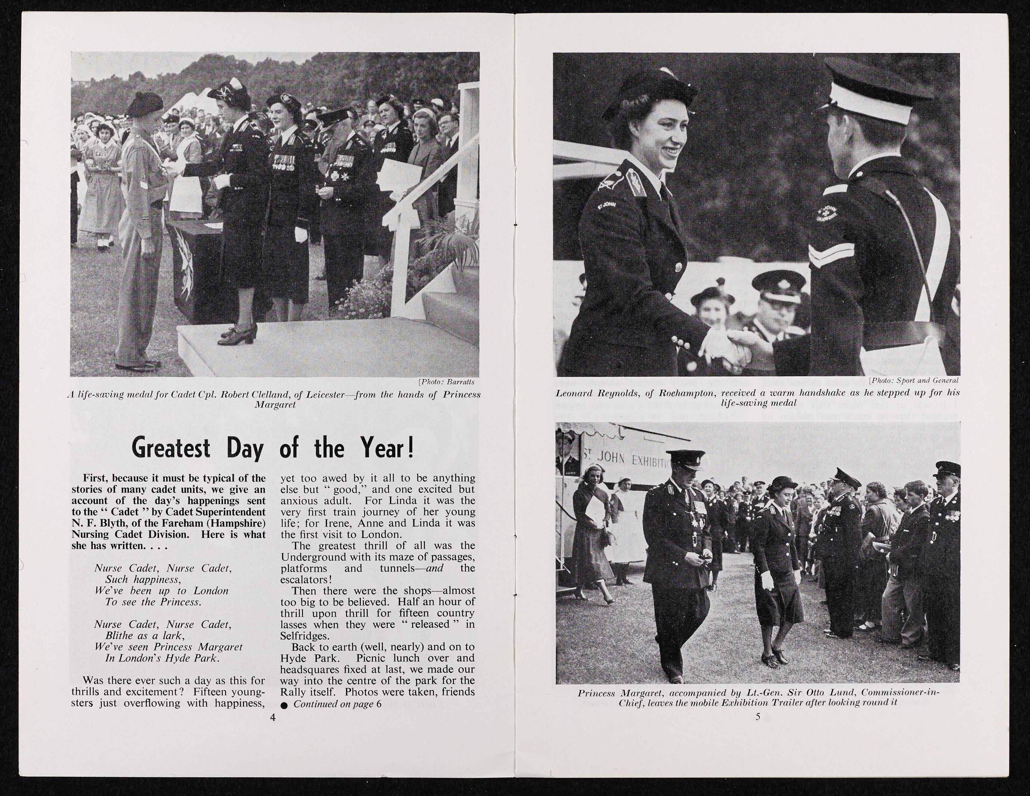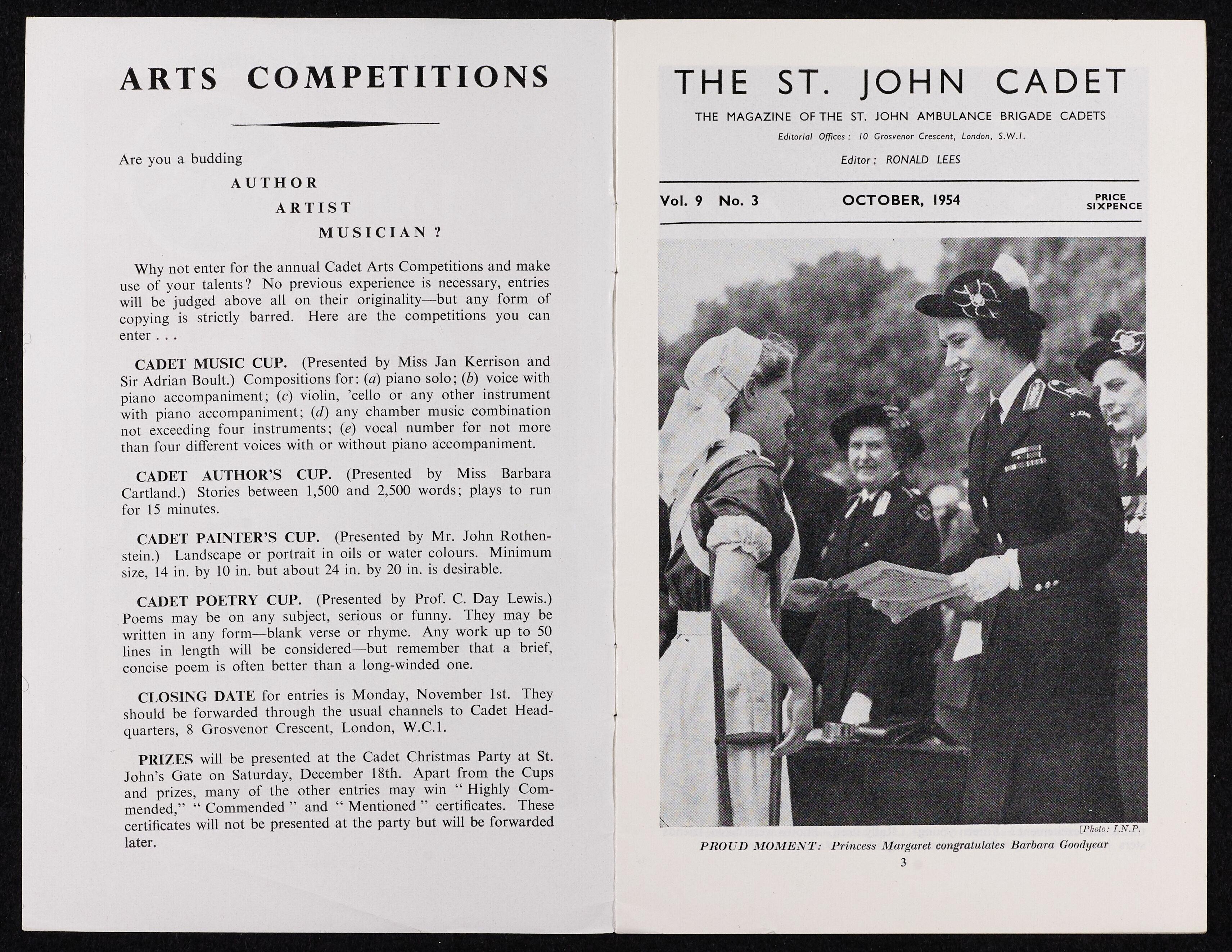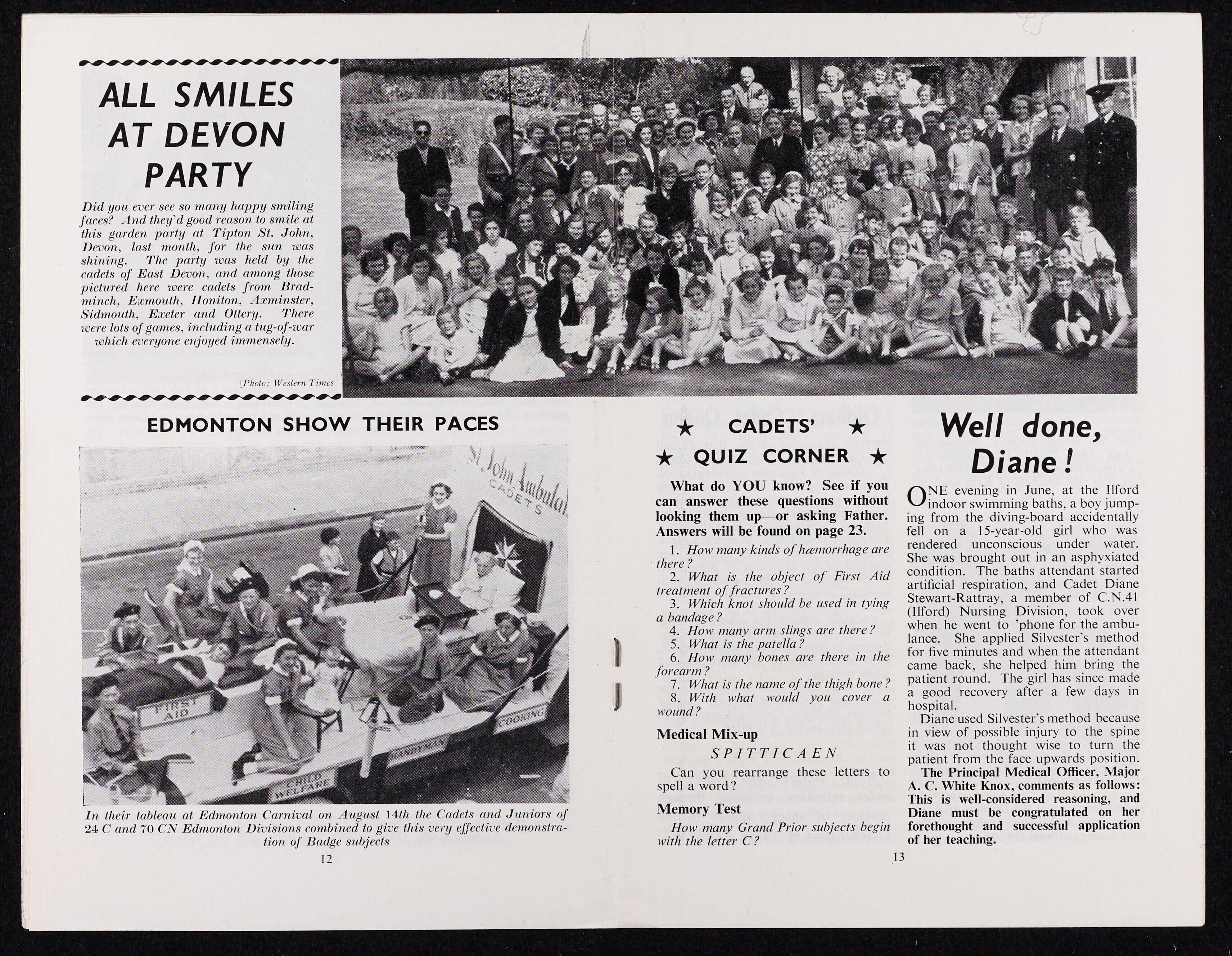 Cadet Meritorious Certificate: Cadet Jacqueline Bird of Rochester Nursing Cadet Division, Kent. Cadet Patricia Wright of 134 Manor Park Nursing Cadet Division, London. Aged 13. Cadet Margaret Foster of Scunthorpe Nursing Division, Lincolnshire. Aged 16. Cadet Barbara Goodyear, of Heysham Nursing Cadet Division. Probationary Cadet Mary Cheshire of Briley Hill Nursing Cadet Division. Aged 11. Student Member Marie Armitage, of Elland Nursing Cadet Division, West Riding, Yorkshire. Cadet Dennis Robins, of Donisthorpe Ambulance Cadet Division. Leicestershire. Aged 15.