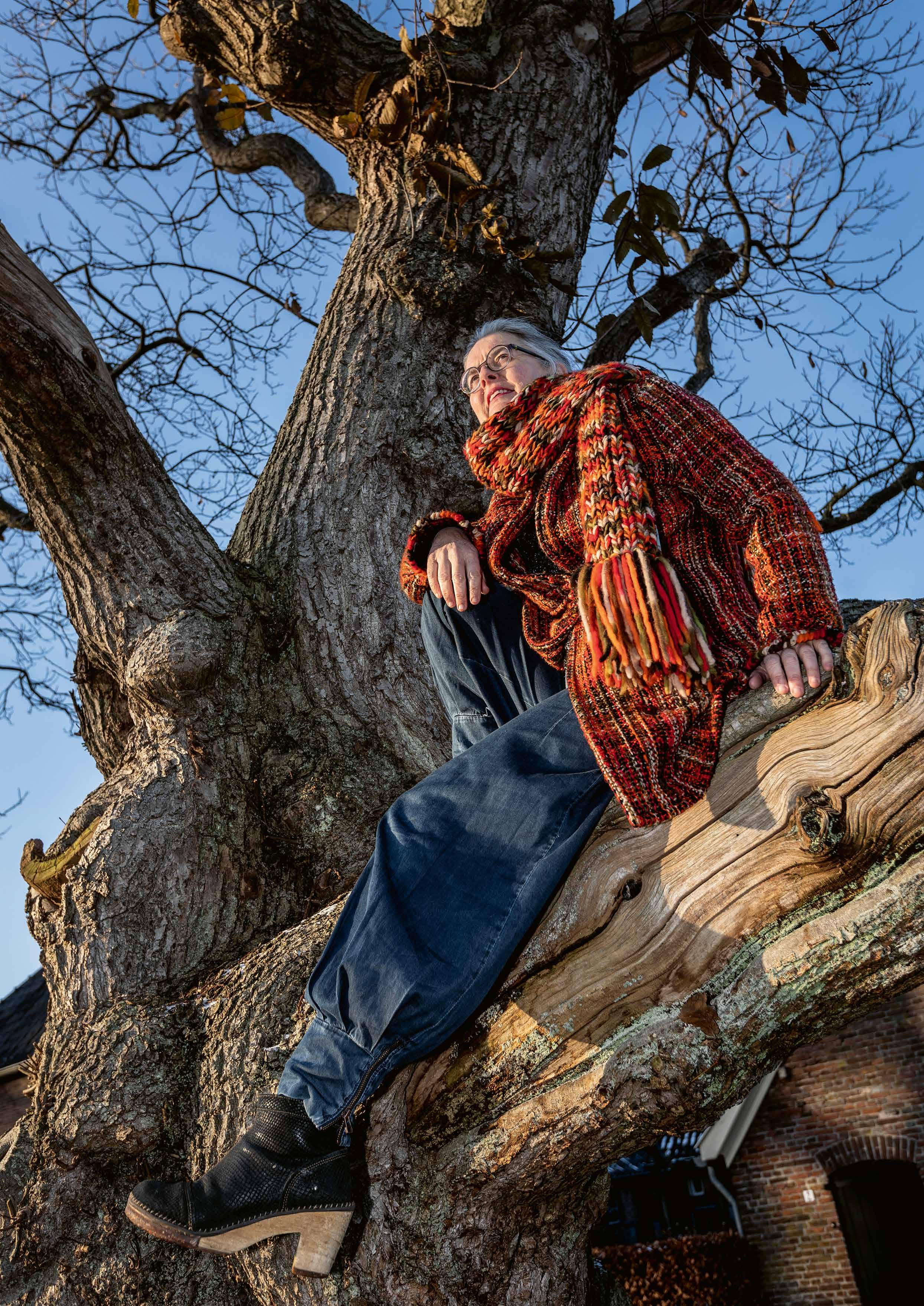 Variatie op Annie M.G. Schmidt: En nu zagen ze iets, daar heel hoog tussen de kale takken. Een been. Een been met een gehakte laars. “Mijn hemel het is een dame"... De dame klopte het stof en het groen van haar broek en zei: “Ik kan het niet helpen, ik moet de boom in als er een fotograaf aankomt.”