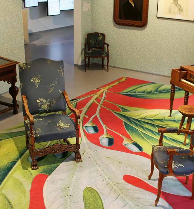 “Wat een bijzonder vloerkleed!” horen we regelmatig van onze museumbezoekers als ze de muzieksalon betreden. Inderdaad, in het oog springend mag je het kleed rustig noemen. De rode achtergrondkleur en de groene tinten van de wonderlijk gevormde sassafras-bladeren trekken onmiddellijk de aandacht. Het kleed is voor Museum STAAL ontworpen en gemaakt door OPERA Amsterdam.
