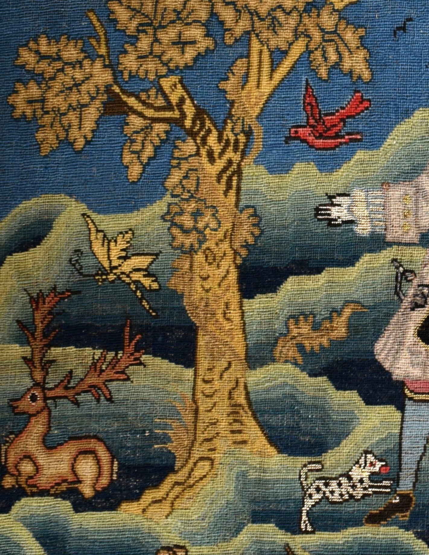 A call in the fall of 2018 from the Nantucket Historical Association brought this spectacular embroidered mantlepiece to Museum Textile Services for remounting and reframing. Made of silk, wool, and metal-wrapped threads on linen, it is attributed to Susan Colesworthy, c 1765. Referred to as a ‘fishing lady’ embroidery, it is one of a series of works that stands out in the realm of American Colonial needlework for its focus on women’s courtship and agency.