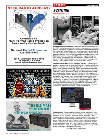 The Anthology X: Eventide’s latest plug-in bundle, Anthology X, contains enhanced versions of the 17 plug-ins that were originally available as part of the Pro Tools HD/TDM plug-in bundle, Anthology II. With newly designed graphics, feature enhancements and additional presets, each has been re-coded from the ground up to closely emulate the sound of the original hardware. Plug-ins include Eventide Clockworks classics (Instant Phaser, Instant Flanger, H910 Harmonizer®, etc.); the UltraChannel, EQ65 Filter Set, EQ45 Parametric Equalizer, EChannel and Precision Time Align, for mixing and mastering; and next generation effects UltraReverb, Quadravox and Octavox. Contact Eventide, 201-641-1200 16 February 2016