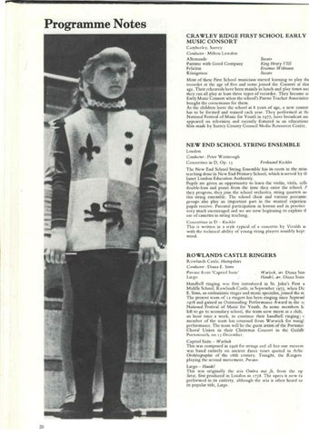 H andb ell ringing was ti rs! introd ll ccq in St. john's First a Middle School, R owlnnds Castle. in Septe mber 1973 . when Di: E. Sims, an enthusias ri c ringer and music specialist. joined the st; The prese nt team of 1 2 r i.n gers has been ringing since Sepccml 1978 and gained an Outstanding Perfo rm a.nce Award in che l! N ational Fes tiv al of M usic for Youth . As some members h; left to go to secondary school. the team now mee ts as a dub, an hour once a week co conrin ue their handbell r ingillg ; c me mber of the team has returned from Warwick for coaigi performance . The te. m wi ll be the gues t a.rris ts of the P o rtsmo C horal Union in their Ch ristm as Co ncert in the Guildh Portsmouth, on 15 December. Capriol Suite - Warlock This w~ s co mposed in 1926 for strings and all but one movem was based entirely On ancient dance tunes quoted in Arbe: Orelllfsographit of the r6th century. Tonight, the Ringers playing the second m ove ment, Pavalle. Largo - Hill/del This was origi nally th e aria Ombra mai fil, from the op Scr.'~ , fint produ ced ill London in 1738. The opera is now ra performed in its entirety, although the aria is often heard ur its pop ular title, LttI:~o.