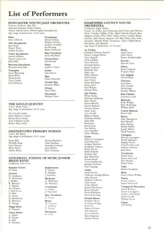 List of Performers DONCASTER YOUTH JAZZ ORCHESTRA Director of Music: John El/is Associate Director: Philip Gibbons Tutors: Harold Searle, Richard Ingham (saxophones) Age range of performers: 13-21 years Flute Rona Gilchrist Alto Saxophones Jane Seade Sharon Ward Andrea Scanlan Tenor Saxophones Steven Gibbons Simon Lockwood Julia Mills Baritone Saxophone Krystyna Rozynska Trumpets Steve Flemming Mark White David Grace Tony Corish Paul Millband