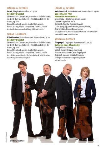 MÅNDAG 20 OKTOBER Lund, Magle Konserthus kl. 19.00 Brodsky Quartet Stravinsky – Concertino, Borodin – Stråkkvartett nr. 2 i D-dur, Sjostakovitj – Stråkkvartett nr. 2 i A-dur, op. 68 Daniel Rowland, violin, Ian Belton, violin, Paul Cassidy, viola, Jacqueline Thomas, cello Arr: Lunds Kammarmusiksällskap • Bilj: vid entrén
