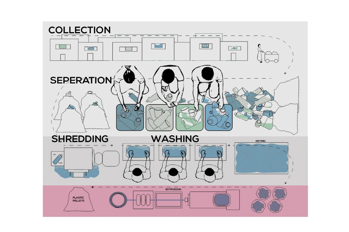 Plastic is recyled in 3 steps and results in colourful pellets.