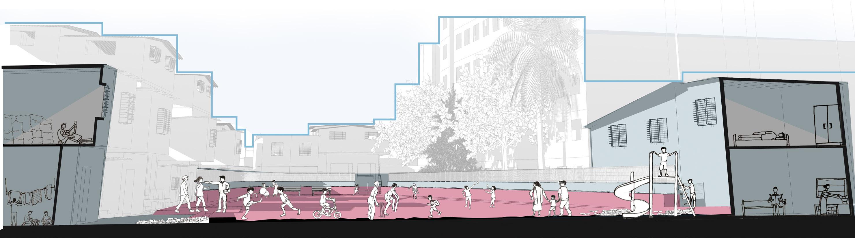 The site for this project was tucked into the leather market zone of Dharavi - an urban slum in the centre of Mumbai, India. The site appeared to be an empty piece of land widely used by the neighbourhood community for various activities. It was used for recreation by all age groups for different purposes like playing, gathering and as a spill-out space for the residents living nearby.