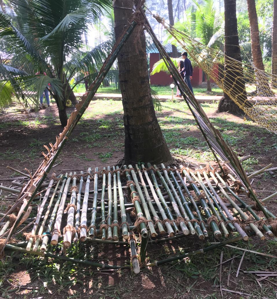 We were divided into groups of 10 and given the assignment of designing a user-centric bamboo installation, which had to take into account the tensile strength, stiffness, elasticity, and durability of bamboo. We started sketching and came up with design ideas like seating spaces, rocking platforms, walkways, and tents.