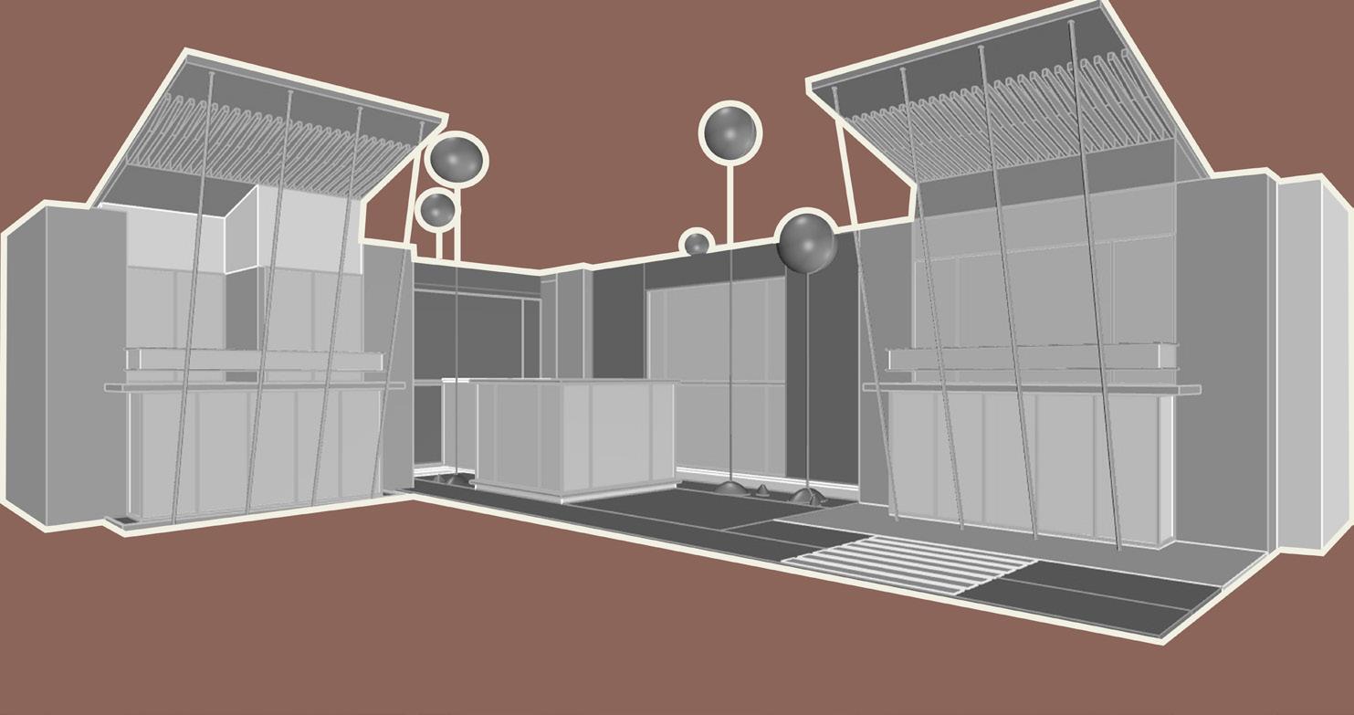 1. The design is structured around a central established axis and one crossing over it diagonally 2. The functions were arranged around the axis according to their needs and necessities. Recreation by