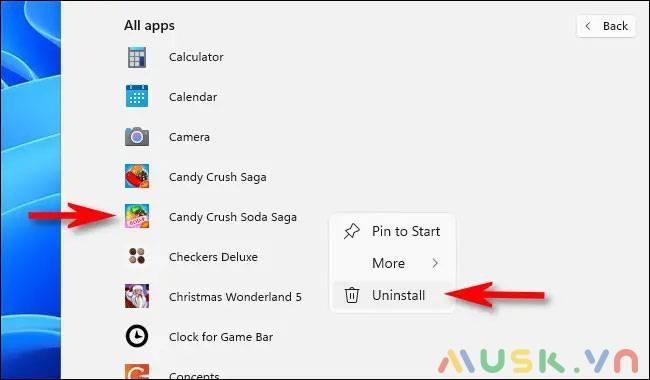 Chọn all apps để đóng ● Rồi bấm chuột phải chọn Uninstall Nhấn xóa ứng dụng không cần thiết