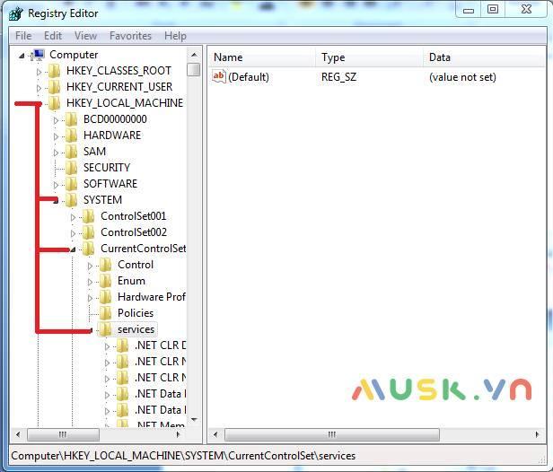 Nhấn mục Run ● Bước 2: Nhập regedit rồi enter hoặc click OK Chọn Regedit ● Bước 3: Sau khi bạn enter thì sẽ hiện hộp thoại Registry Editor, bạn tìm vào mục Computer rồi click đúp hoặc nhấn vào mũi tên ở bên trái, tiếp tục chọn HKEY_LOCAL_MACHINE -> SYSTEM -> ControlSet001 -> Services.