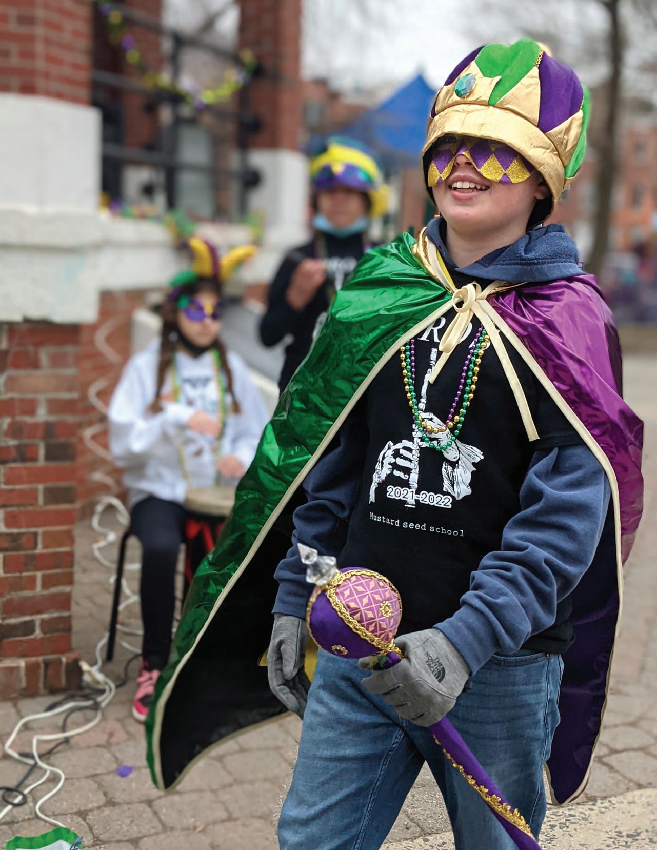 7 emphasized that they employed the standard engineering design process of research, build, improve build, check for mistakes, and finalize. “I am good friends with both of the people on my team, so we had a lot of fun building together even though there were challenges.” Owen has attended Mustard Seed since preschool. “Next year will be my 10th year as a Mustard Seed student,“ says Owen. “One of my favorite memories was our trip to Virginia in 5th grade as a member of PROS. It was my first overnight trip with the school, and we Japaneseperformedsongsfor a teachers' convention where Ms. Maudlin was presenting.” Having participated in all of the celebrations over the years, Owen was par ticularly excited and proud to play the role of King of the Mardi Gras 2022. “Our school hadn’t been able to have Mardi Gras for two years because of COVID. We held it outside this year for the first time, and I know that Ms. Mauldin put a lot of work into it.” As Mardi Gras King, Owen enjoyed: 1. Making so many feel kids happy, 2. Knowing the posi tive impact the celebration has on the school, and 3. Free food at the end. Mardi Gras and Lent appear adjacent on the MSS worship schedule and may be viewed as two ends of the festival spectrum. Where the Mardi Gras carnival at Mustard Seed is exuber ant, earthy, unapologetically loud, and gaudy, our observance of Lent is as hushed, cerebral, and introspective as one would expect for the season just before Easter. Among other traditions at MSS, we refrain from the use of the word “Alleluia” during Lent as a gesture of community fasting. That is just one example of our practices for the season. Early Childhood Director Ms. Ford Sytsma wrote this explanation of Mustard Seed's observance of Lent for new and preschool families: “Lenten practices are spiritual practices. We hope that the children will encounter a little more quiet and space in this time to connect with their inner lives, as well as with each other and their community, through collective experi ences. We hope it will lead them to feel like they are part of something bigger than themselves. We hope that the quiet and encouragement to be reflective encourages habits that might strengthen their understanding of God as good and loving. We hope they will begin to under stand that we can respond to God’s goodness and love by extending that goodness and love to others in acts of service," While Mardi Gras may seem like the obvious preference on the happniess scale, some children prefer the spiritual connection of Lent. One fifth grade student, identifying as a writer, felt he was able to do his best work of the year during the reflection and peace of Lent. Long time students understand and appreciate the variegated cadence of the schedule.